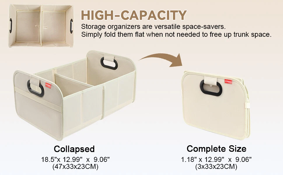 Trunk Cargo Organizer Collapsible Storage Bag 35L for Cars Trucks & SUVs Beige Features: FOLDABLE DESIGN : This car storage organizer has a foldable design that allows it to be folded up when not in use, saving space in the trunk of the vehicle. This design allows the bag to effectively reduce the space it takes up when not in use, improving space utilization in the trunk of the vehicle. MODERATE CAPACITY : The car trunk tidy has a certain capacity, suitable for storing tools, first aid kits, shopping bags and other items needed for daily driving. This moderate capacity design meets your most trunk storage needs, making the organizer bag able to meet your practical needs. DURABLE MATERIAL : It is usually made of wear-resistant material that can withstand a certain amount of weight and ensure durability for long-term use. This choice of material ensures the longevity of the organizer bag and also enhances its weight-bearing capacity, making it more practical. EASY TO CLEAN : The surface finish is usually smooth and easy to clean and wipe down, keeping the trunk tidy for car. This design makes the trunk organizer easier to clean during use and reduces the cost of use and maintenance for the user. EASY TO INSTALL : Designed with user convenience in mind, the car trunk storage organizer can be installed or removed without any tools. This easy installation allows users to easily install the bag into the trunk of the vehicle, improving your experience. Specifications: Color:Beige Material: Oxford Cloth Dimensions Open: 18.5” x 12.99 x 9.06” /47cm x 33cm x 23cm Dimensions Folded: 1.18" x 12.99" x 9.06" /3cm x 33cm x 23cm Fitment: Universal - Fits Almost Any Trunk Package included: 1*Trunk Organizer General Policies : Dear customer,if you have any questions,you can contact us,we will provide the best service for you. Shipping policy : The item will be shipped within 24 hours on payment received except the holidays.(except weekends & official holidays). You can log on to eBay to check your logistics tracking number. Please confirm address before purchase, and cannot change address once purchased. If you need to receive the item quickly, please contact us, you can pay the postage to choose other logistics. Payment: Please purchase and pay for the item through the eBay,only acc e pted the paypal payment. Returns: Please contact us first when return, exchange and refund is required. Any direct return of purchased items will not be processed. Item must be returned in new condition, as received with all accompanied accessories and literature, including the factory carton. Shipping, handling is not refundable unless item is returned because of defect. If the product is defective or damage upon arrival,please contact us immediately,we will provide the solve the problem. Returns accepted within 30 days of delivery date and item must be in original new condition. About us: Our goal is complete customer satisfaction. We will be very honored to provide you with quality service. If there is an issue with shipping or the item you purchased please contact us via e B ay message or call us before opening a case or leaving feedback.We will try our best to resolve any kind of issue.