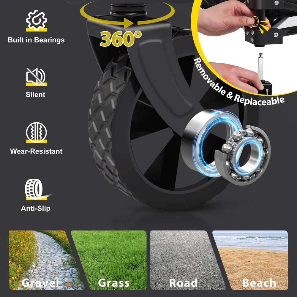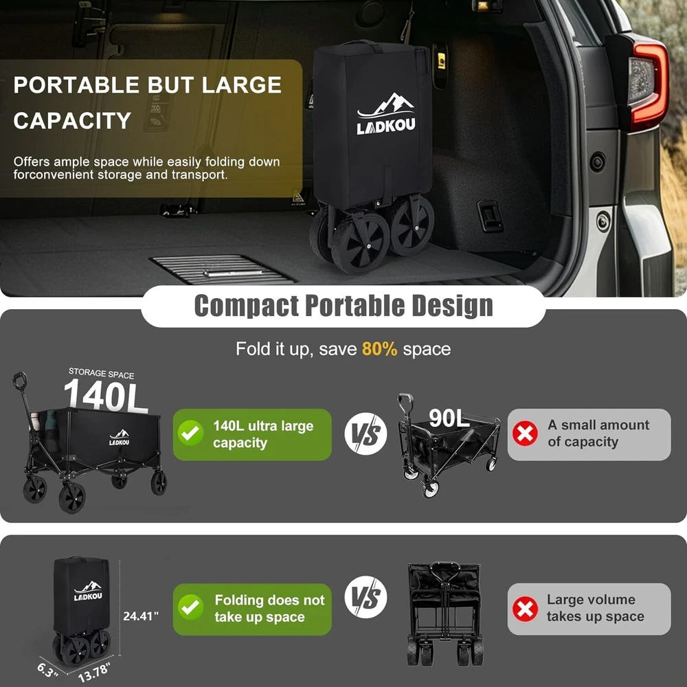 【Generous Capacity for Effortless Transport】 - With unfold full size: 37" (W) x 20" (D) x 40" (H), this foldable wagon has deeper and larger storage space than other standard-sized wagons, offering 140L carrying capacity. Allows you to transport sizable loads, reducing the need for multiple trips. 【Quick Fold & Space-Saving】 - This beach wagon cart with big wheels can be easily unfolded or folded in seconds without using tools, making it very easy to handle and transport. The portable and compact design perfect balance between large capacity and small folding size, you can take it anywhere with ease and store it in limited space. 【Durability for Longevity】 - Built to withstand outdoor conditions and heavy loads, Our folding heavy duty wagon is constructed with a heavy-duty steel tube frame, that effortless hold up to 330lbs. The double-layer 600d Oxford fabric is not only robust but also resists wear and tear, ensuring lasting performance and enduring quality. 【All-Terrain Wheels & Adjustable Handles】 - The collapsible wagon is equipped with 360° rotating off-road wheels, wear-resistant and silent, so it can move smoothly on different kinds of terrains. The 90° adjustable handle can be extended from 28" to 39.8" and locks securely in place. All for easy pushing and pulling! 【Versatility】 - This wagon is designed for versatility, catering to a range of activities. From camping, gardening, shopping, sporting events and outdoor activities, it’s a great outdoor utility wagon as a camping wagon, fishing wagon, or grocery wagon. Please feel free to contact us at any time, we will reply within 24 hours!