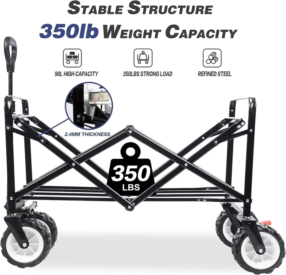 Beach Garden Travel Folding wagon cart Feature: Folding carts with strong steel structure-upgrade 600D waterproof oxford fabric, 2 cup holders design, equipped with 7’’all terrain tires. 180-degree rotating off-road wheel and the rear wheels are directional wheels. This is adopted to make your parking, pushing and pulling more conveniently. it doesn’t need to be installed, easy to open and fold, occupy small space, suitable for outdoor activities such as shopping, beach, camping. Sets up in seconds, no assembly required! Outside Dimensions Approx: 39.4" x 23.2" x 31.5". All terrain collapsible outdoor wagon cart has 90L large-capacity internal storage.And the use of 600D Oxford cloth, do not need to worry about filling too many things to cause damage. Wagon folds to only 7.48" thick! Folded size approx 29.5 x 22.3 x 7.5’’and includes a convenient portable bag for carry. All terrain collapsible folding outdoor wagon cart has internal pull rope design. Rear braking The cart can stop when you hit the brake with foot. Not only convenient but also protect your family and pets. Just up the brake then driving again. Double Triangle Structure Heavy-quality Frame, is made of triangle structure. Sets up in 3 seconds, No assembly required!The heavy duty frame allows loads up to 350 lbs. Widen Deepen Silent Wheels 7’’all terrain tires. The Wheels are silent widen hub and wear-resistant. It is made of PU material. 1 Net and 2 Straps Carry More and Do not Fall Off 180° Connecting Rod Pull Smoothly Stand Alone and Save Hands 600D Oxford Waterproof Fabric Specification: Fabric Material: Oxford Frame Material: Steel Overall dimensions: 39.4" x 23.2" x 31.5"(L*W*H) Folded dimensions: 29.5 x 22.3 x 7.5’’ (L*W*H) Capacity: 90 L Max Load: 350 LBS Weight: 30 LBS Package: 1 x Collapsible Wagon Cart
