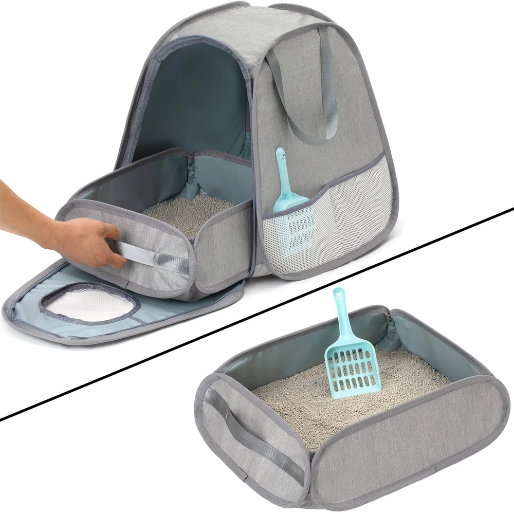 Collapsible Portable Travel Cat Litter Box,Portable Cat Playpen - Cat's Travel Companion Portable travel cat litter box specifications: Materials: Polyester Oxford cloth, steel wire . Color: Grey. Size: 45 x 45 x 42 centimeters ≈ 17.7 x 17.7 x 16..5 inches. Package includes: 1 foldable cat litter box, 1 cat litter box shell。 Collapsible Portable Travel Cat Litter Box Characteristic: ☑ Can better keep standing and it is not easy to overturn, preventing pets from climbing and escaping. ☑ The production material is made of polyester 600D Oxford cloth and steel wire. Sturdy as a castle. ☑ The enclosed design can prevent the odor leakage of cat feces. ☑ With PVC coating to ensure cloth no leakage. easy to clean 100% Satisfaction We have great confidence in our products. If you have any questions, please feel free to and we will reply within 24 hours. Trapezoidal Design: The trapezoid design of this pet fence can better keep standing and it is not easy to overturn, preventing pets from climbing and escaping. Strong and Sturdy: Pet playpen is made of 100% polyester 600D oxford and anti-tear sturdy net. With steel frame and nylon zipper, your whole outside pet appears a strong castle. Wide Application:Easy to fold and to open you can put a mat inside and turn it into your pet's bed, house. Can also be utilized as boxes, storage boxes, travel camping bags. Prevent Odor Leakage: The enclosed design can prevent the odor leakage of cat feces, effectively preventing odor emission and providing a better environment for cats and people on the journey Waterproof Easy to Clean: The cat litter box is made of high-density 600D Oxford cloth and coated with PVC coating to ensure no leakage. The smooth inner surface makes it very easy to clean