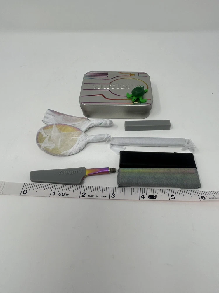 This NEW IN BOX collapsible Cutlery set includes Spoon, Fork, Knife, Straw, a cleaning tool and comes in a perfectly sized travel case. The cutlery is well made and stable, as the pieces screw together are designed to need the use of force to unscrew. This is the perfect travel cutlery set with case for your reusable cutlery for any type of trip!!! oh....and it's beautiful!!!!