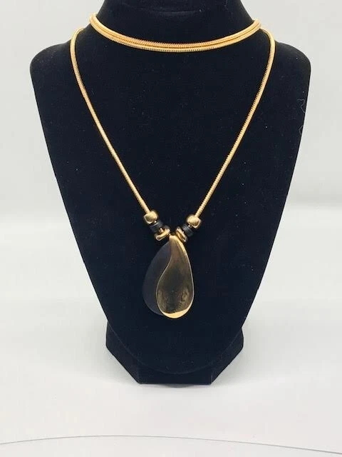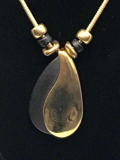 Add a touch of vintage elegance to your jewelry collection with this stunning 42" black and gold tone pendant necklace. The teardrop pendant, in an amulet style, is the focal point of the necklace and sits on a snake chain with a secure lobster closure. The pendant's main stone color is gold and its creation is unknown, adding to the allure of this unique piece. The necklace's material, metal, base metal, and country/region of manufacture and country of origin are unknown. However, its classic design and style make it a versatile accessory that can be worn with any outfit. This necklace is suitable for anyone who appreciates vintage jewelry or is looking for a statement piece to complete their look.
