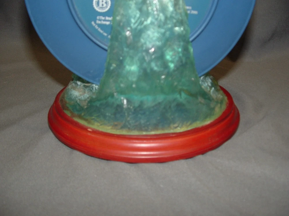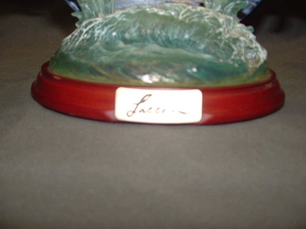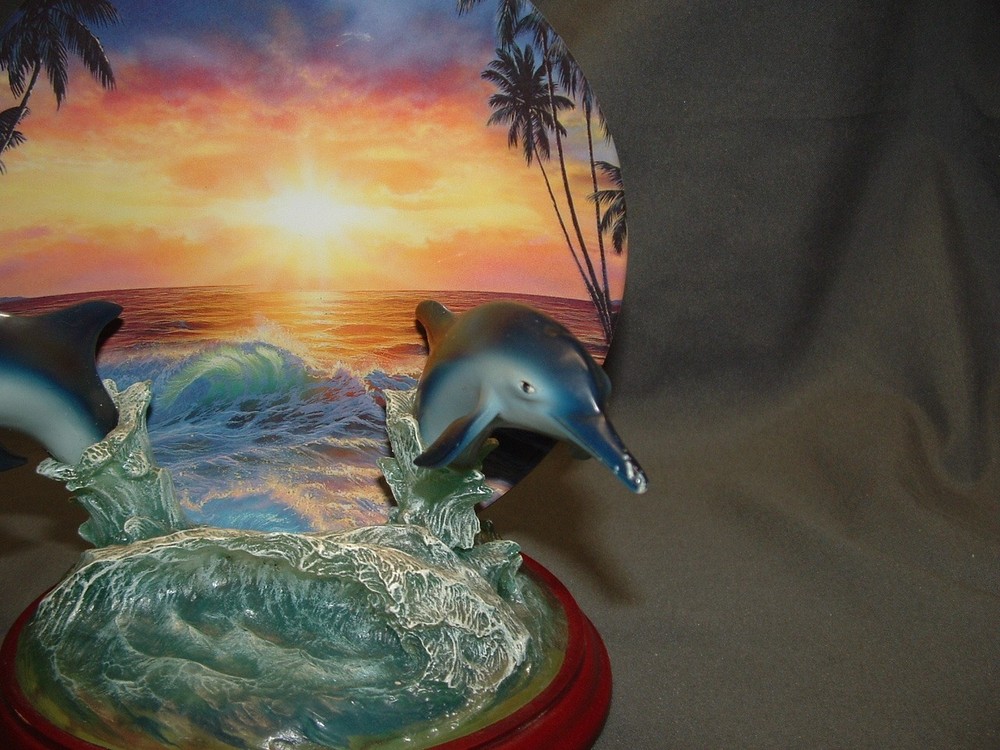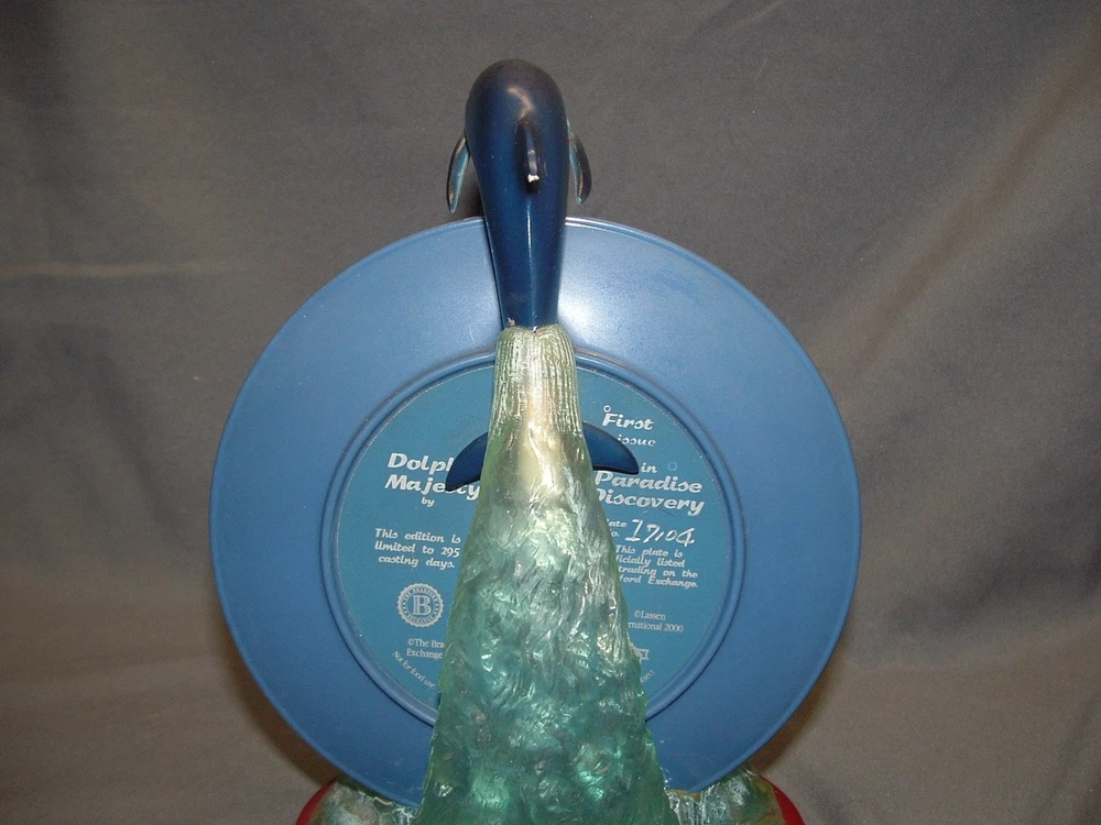 The Collectible Bradford Exchange Plate "Dolphin Majesty" 2000 By Lassen #17104 is a decorative collector's item featuring a dolphin print in vibrant multicolor. This round plate, measuring 6.25 inches in diameter, is a part of the Bradford Exchange franchise and Lassen International product line. Produced in the 21st century, this pottery item is handcrafted in the United States, making it a unique and stylish addition to any collection or decor. The stand included with the plate allows for easy display on any occasion.
