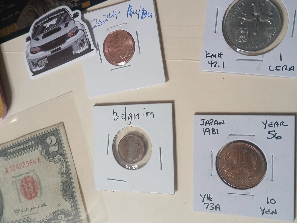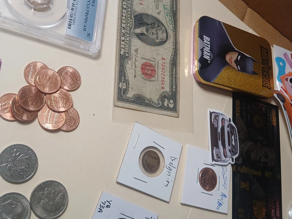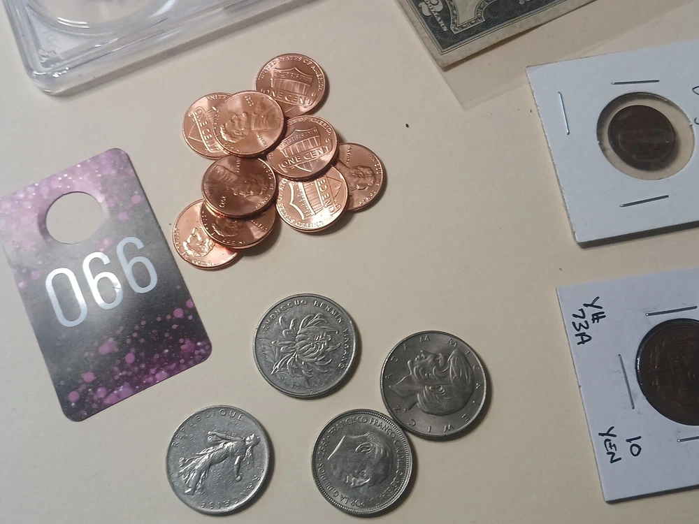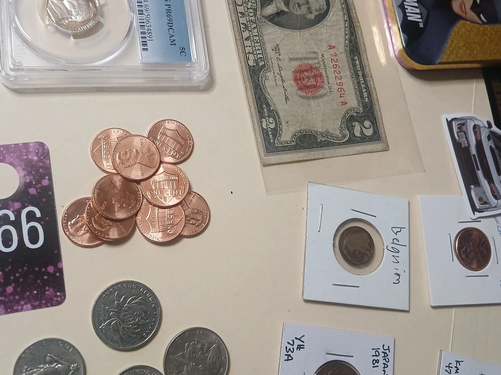 Lot#66 has coins from around the world including 1998s Nickle $2 bill red seal A72622964A series 1953B circulated and more
