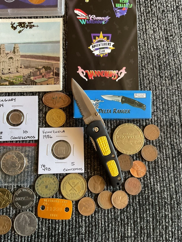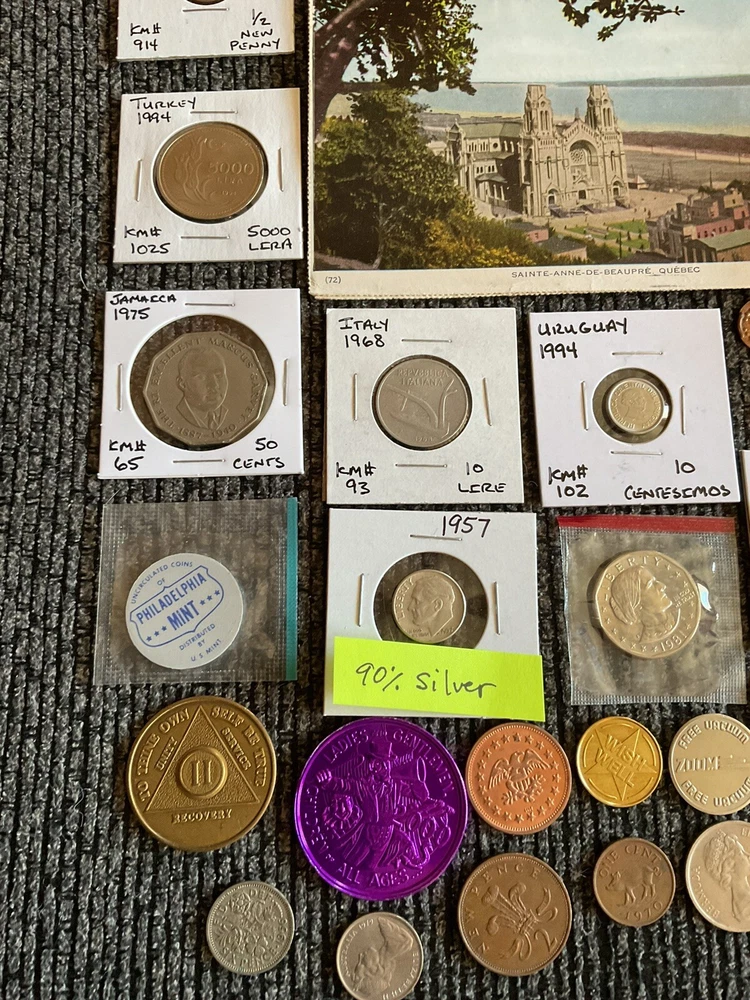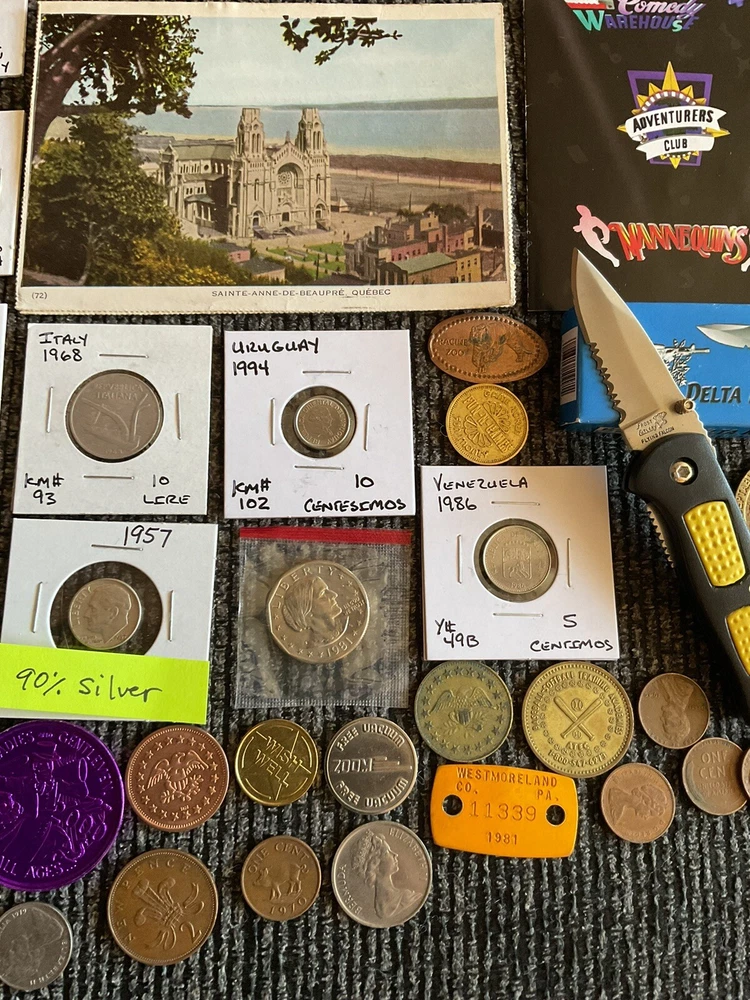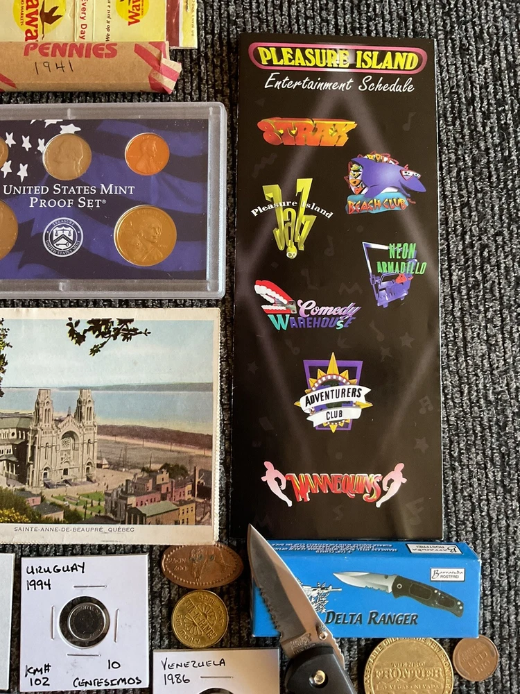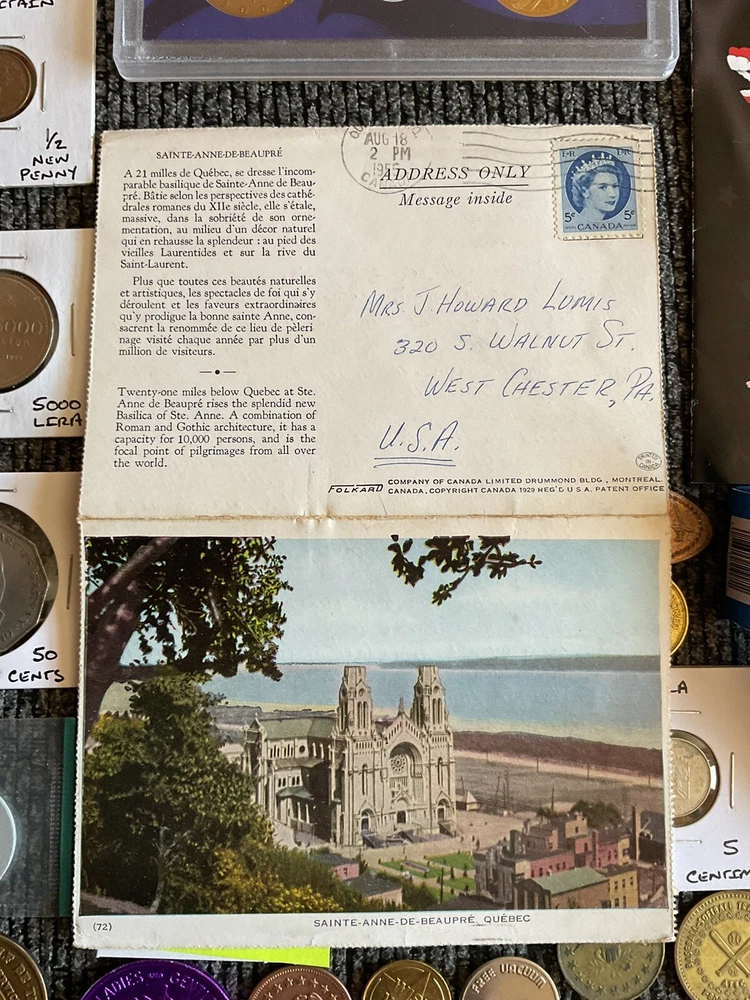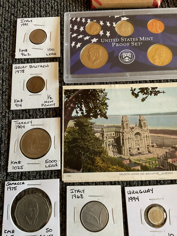 Beautiful lot 2001 S United States mint proof set with Sacajawea, 1957 FDR silver dime, one roll of wheat pennies all 1941 that is 50 pennies total. Beautiful handwritten postcard dated 1955. and so much more in this lot.
