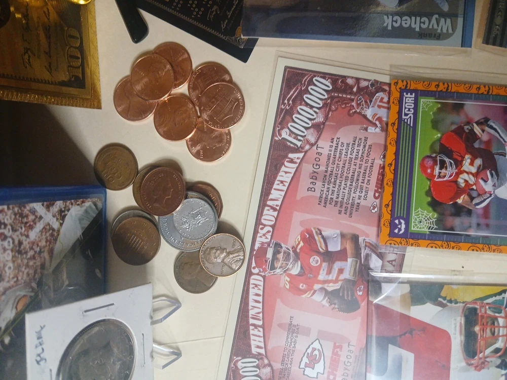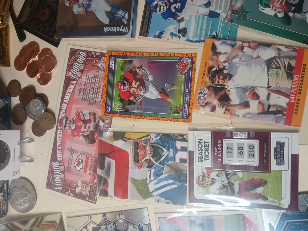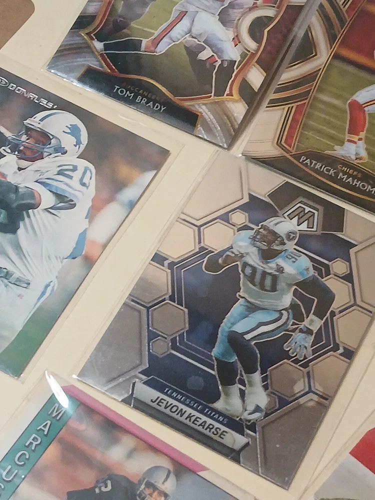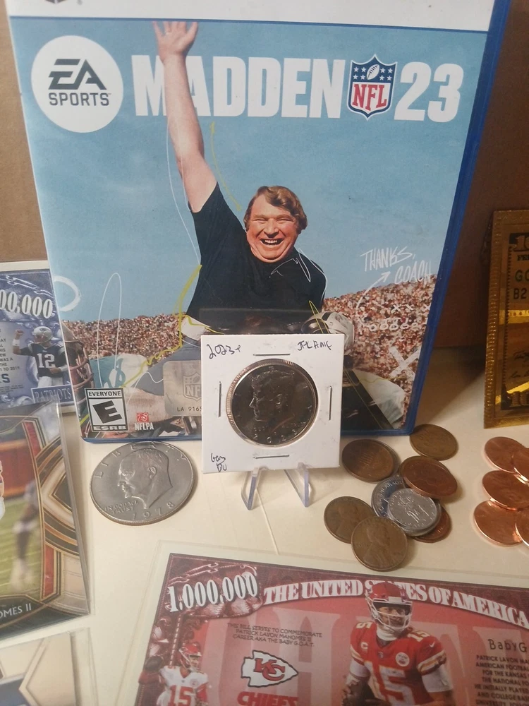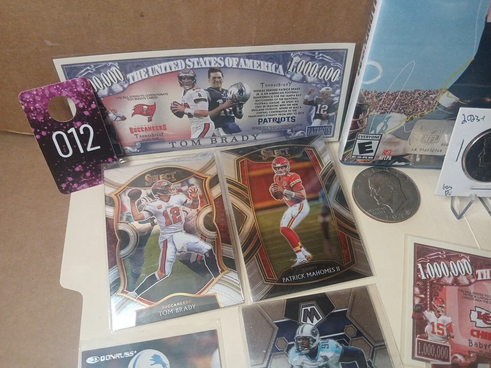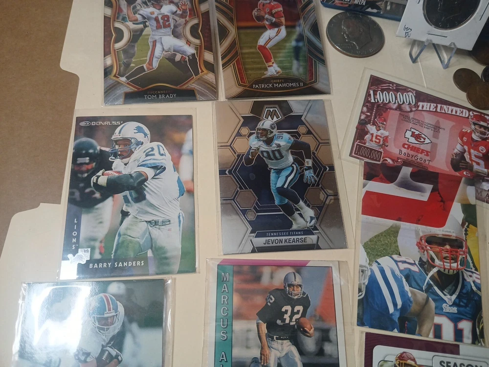 Lot#12 is a football Lot with 21 cards different players and teams like Tim Brady Patrick Mahomes Barry Sanders Jevon Kearse and more 2023p JFK 1978 Eisenhower and other coins