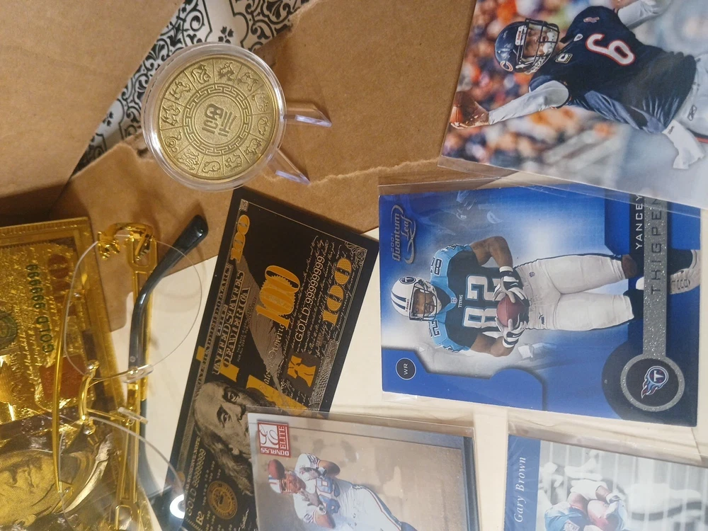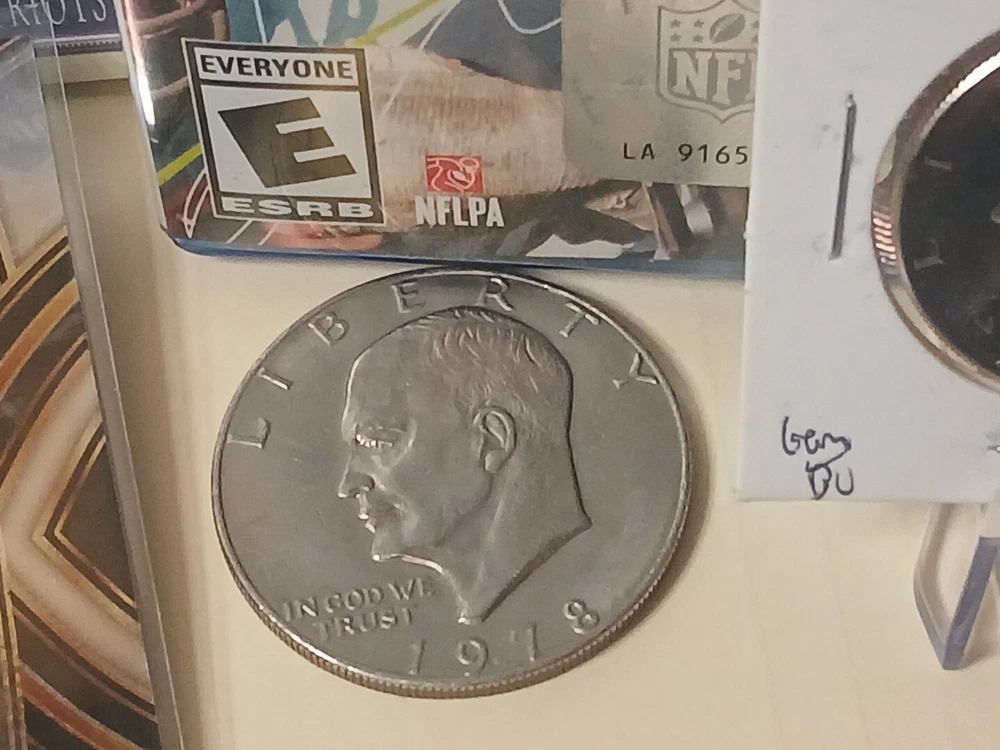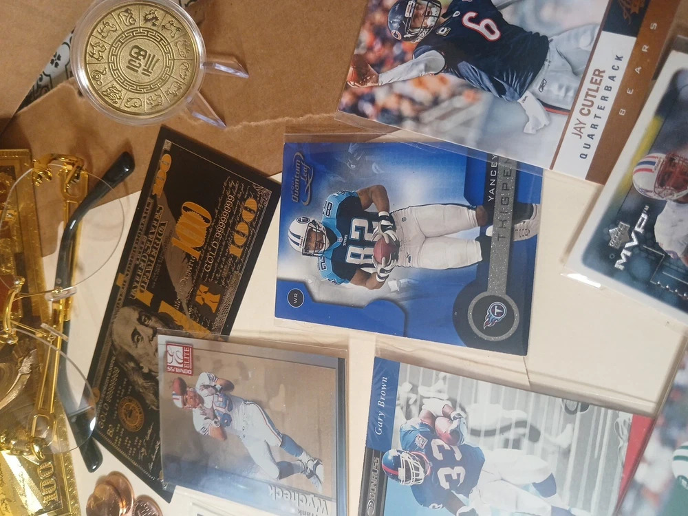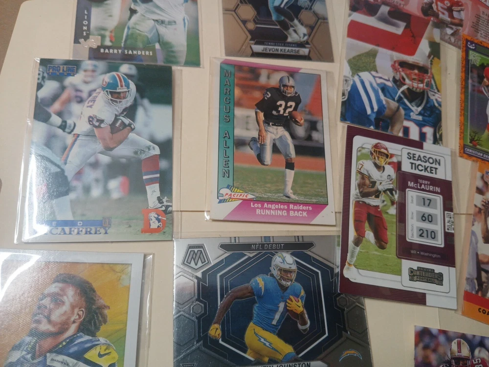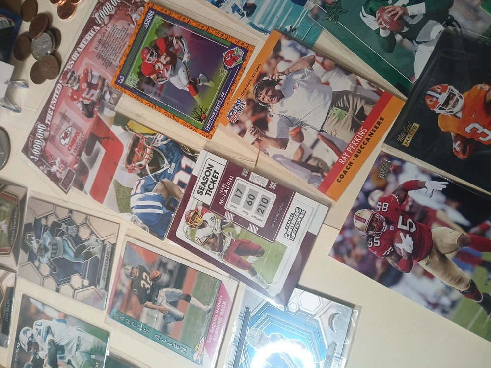Lot#12 is a football Lot with 21 cards different players and teams like Tim Brady Patrick Mahomes Barry Sanders Jevon Kearse and more 2023p JFK 1978 Eisenhower and other coins