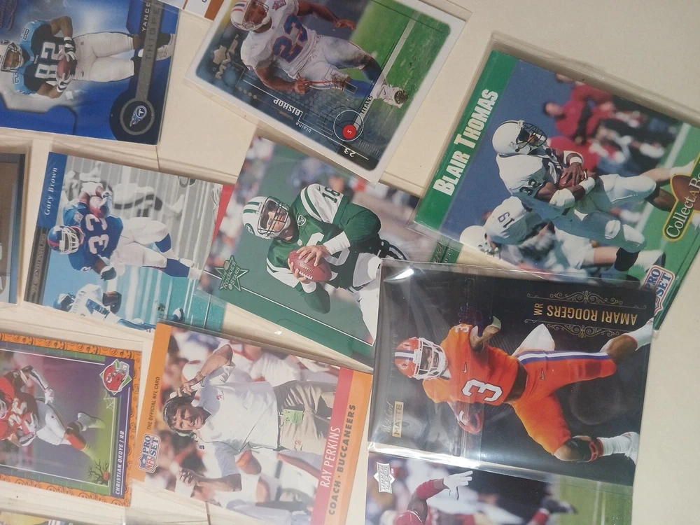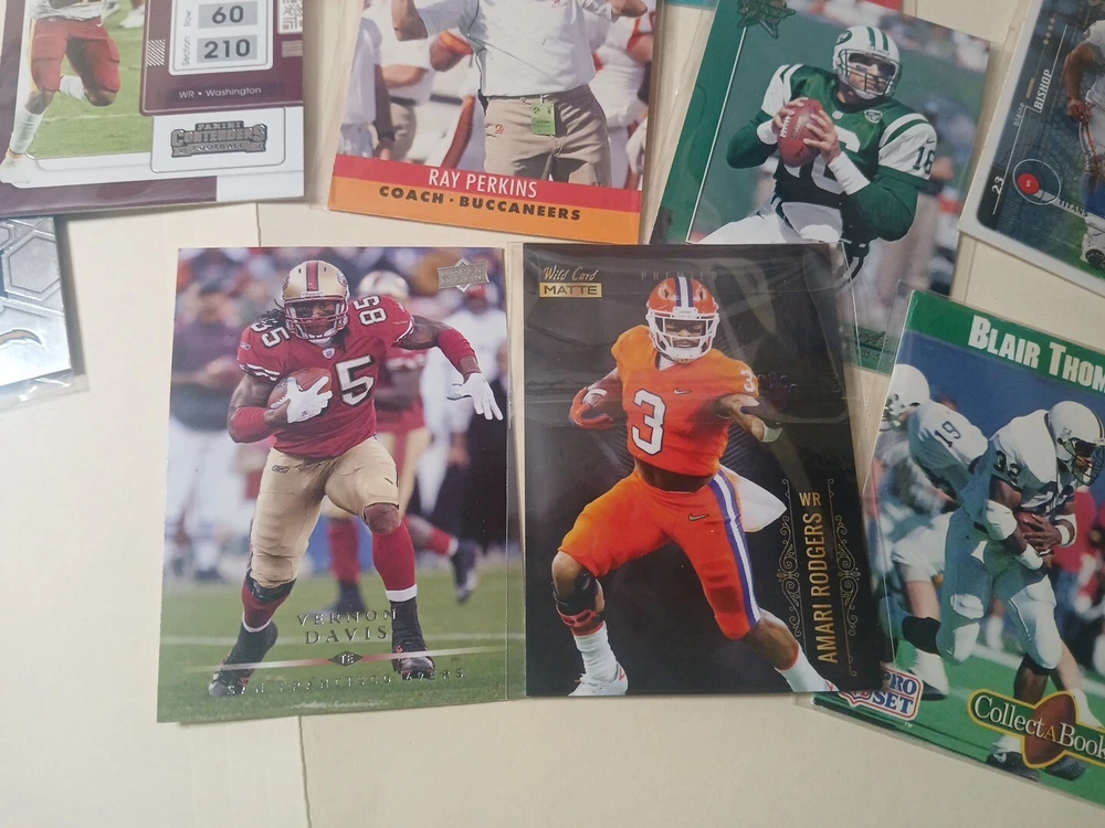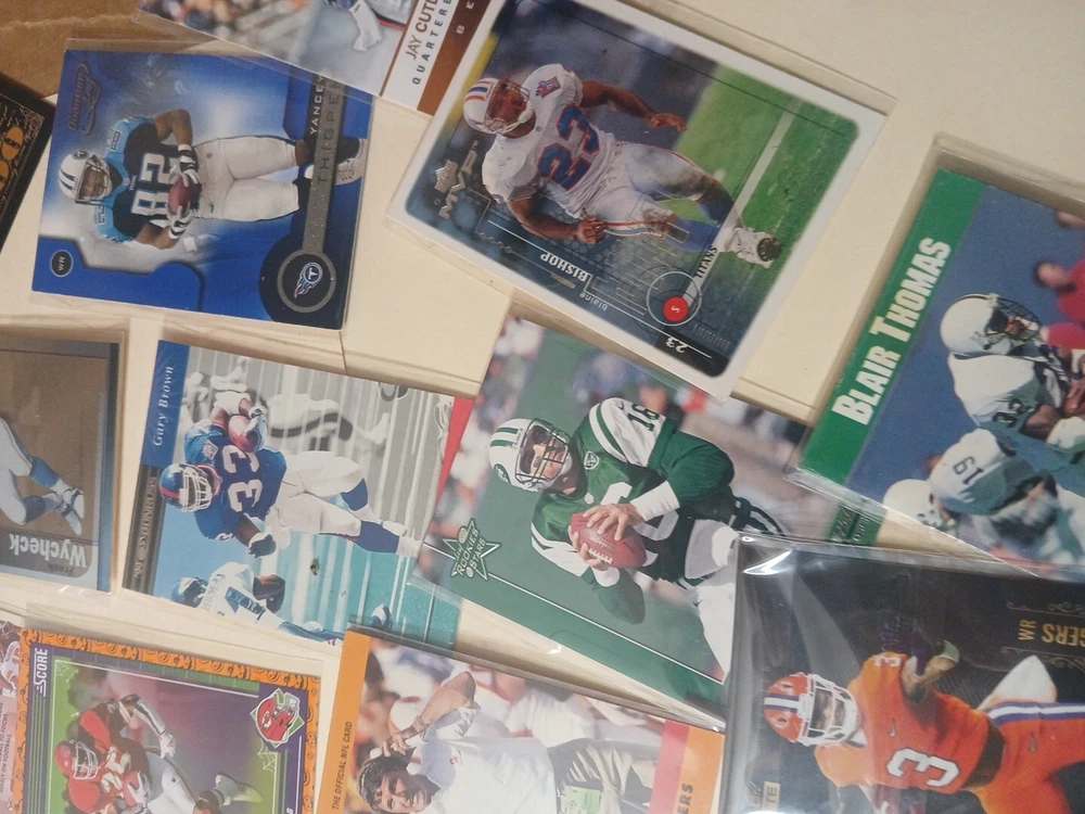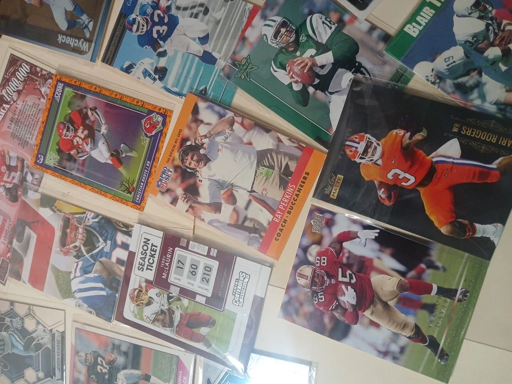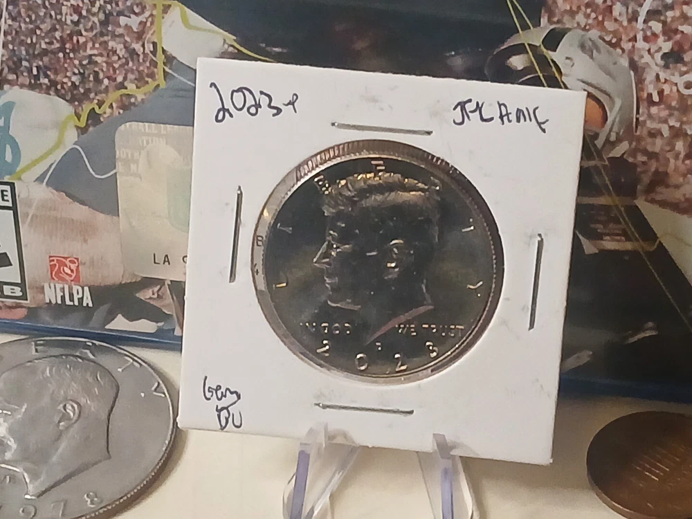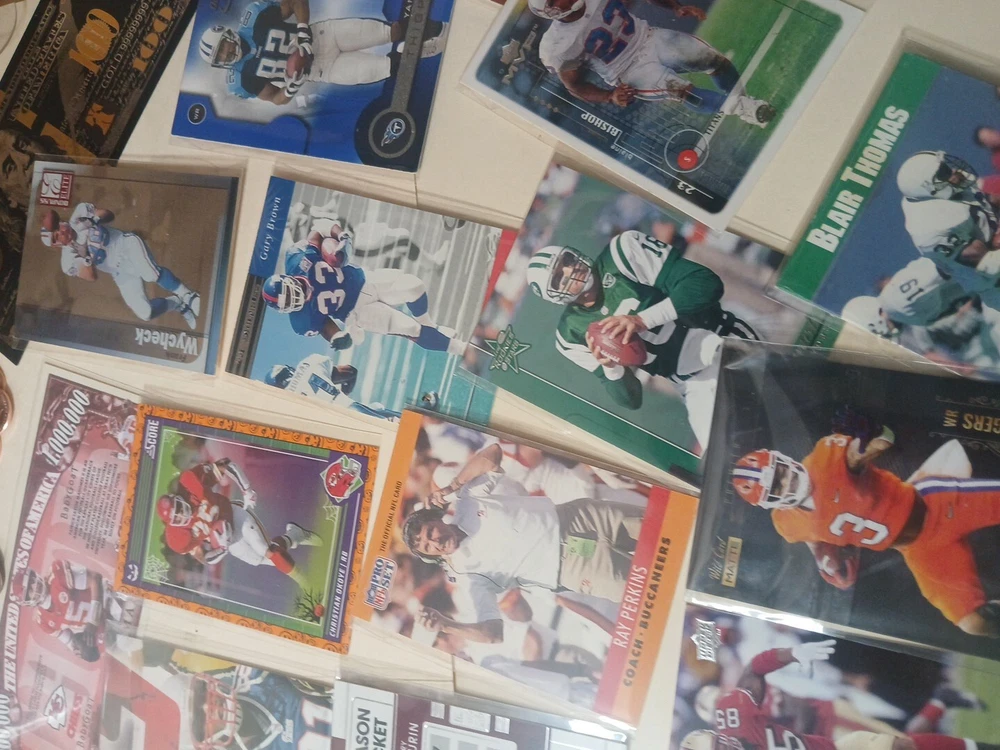 Lot#12 is a football Lot with 21 cards different players and teams like Tim Brady Patrick Mahomes Barry Sanders Jevon Kearse and more 2023p JFK 1978 Eisenhower and other coins