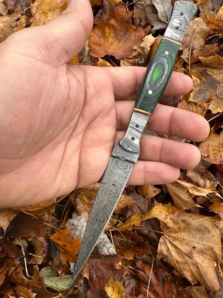This collectible military combat dagger is a must-have for any knife enthusiast. With a full tang and needle point blade made of Damascus steel, this knife is both durable and sharp. The handle is crafted from wood and features a green and black color scheme. Overall length: 8.5” inch Blade : 4” inch Handle : 4.5” inch With Genuine leather sheath This knife is versatile, with applications in hunting, combat, throwing, boot, survival, and more. It comes with a sheath for safe and easy storage and transport. Handmade in the United States, this original piece is a unique addition to any collection.