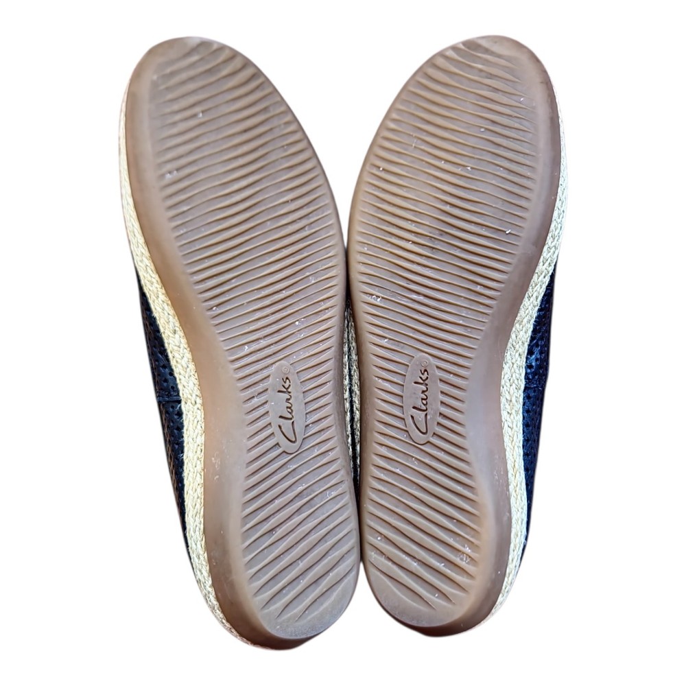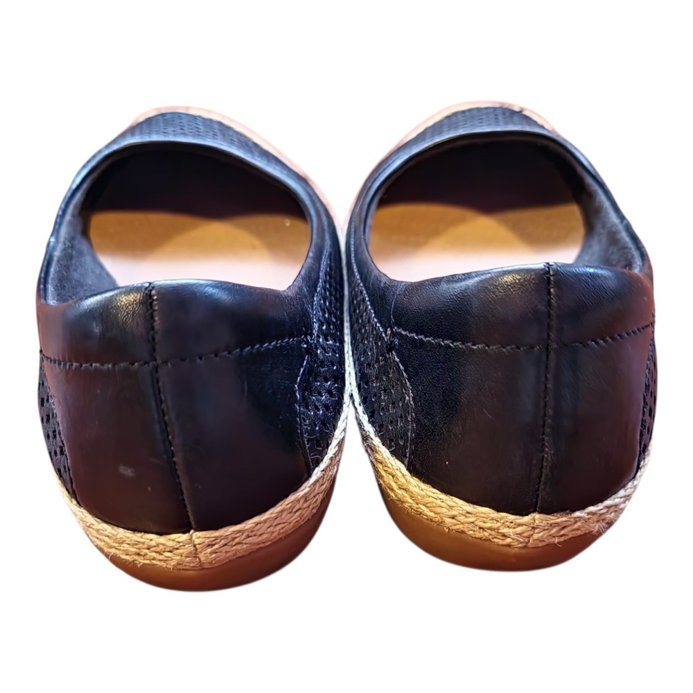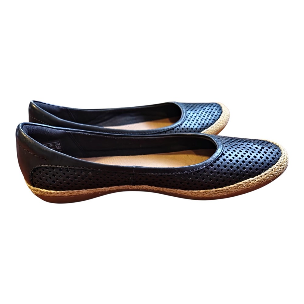 Collection By Clarks Danelly Adira Black Leather Espadrille Ballet Flats 7M Clarks Slip on ballet flats Size 7 M Width Pre-owned, no holes, no rubbing, no odors Very good used condition Black perforated leather No box I ship within a day from a smoke-free environment!