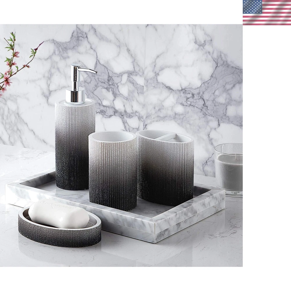 Collection Unique Decorative Beautiful Designs Bath Décor, 4 Piece Set, UrbanaPack of 1 Poly Resin UNIQUE COLLECTIONS - We designed 21 unique styles that are designed to transform your bathroom décor. Our 21 styles are Avalon, Beach Shells, Glamour, Parker, Plaza, Ritz, Urbana, Beach Life, Branches, Marbelized, Moderno, Pendant, Twist, Casanova, Monaco, Marble Plaza, Ocean Star, Omega, Seascape, Urbana Green and Versailles. INDIVIDUALLY OR A SET - We offer each item of the collection individually, or buy the 4 piece matching set and save. The 4 piece set includes all pieces which are Lotion Pump (Soap Dispenser), Soap Dish, Toothbrush Holder, and the Tumbler. DURABILITY AND STYLE - These bath accessories are made out of durable material to keep your bathroom looking great for s to come. For the Avalon style, they are made out of concrete! They look awesome and feel durable. With the other set, we use a poly resin that is strong and lasts. SIZE UP - Each piece are of the following dimensions: Soap/Lotion Dispenser: 2. 5" x 2. 5" x 7. 75", Soapdish: 5. 12" x 3. 75" x 1", Toothbrush holder: 2. 5" x 4. 25" x 4", Tumbler: 2. 75" x 2. 75" x 4" EASY TO CARE - These bath accessories are simple to clean. Simply grab a damp cloth or cleaning wipe, and wipe clean. The Urbana 4 piece bathroom accessory set adds sophistication and a touch of glamour to your bathroom decor. This modern handcrafted resin collection is luxurious, stylish, and helps keep your bathroom dé cor clean, fresh, and organized. The 4 piece set includes: a tumbler, lotion/soap dispenser, toothbrush holder and soap dish. The Urbana accessory collection is textured with a black to white ombre finish for a subtle addition of style. Each piece is hand crafted in a durable resin. Each item is easy to wipe clean and made to last a . This ultra-luxurious collection will surely add contemporary charm to your bathroom. Handcrafted Poly Resin Wipe Clean 4 piece set Soap/Lotion Dispenser: 2. 5" x 2. 5" x 8" Tumbler: 3" x 3" x 4. 5" Toothbrush Holder: 4" x 2" x 4" Soapdish: 5. 5" x 3. 75" x 1"