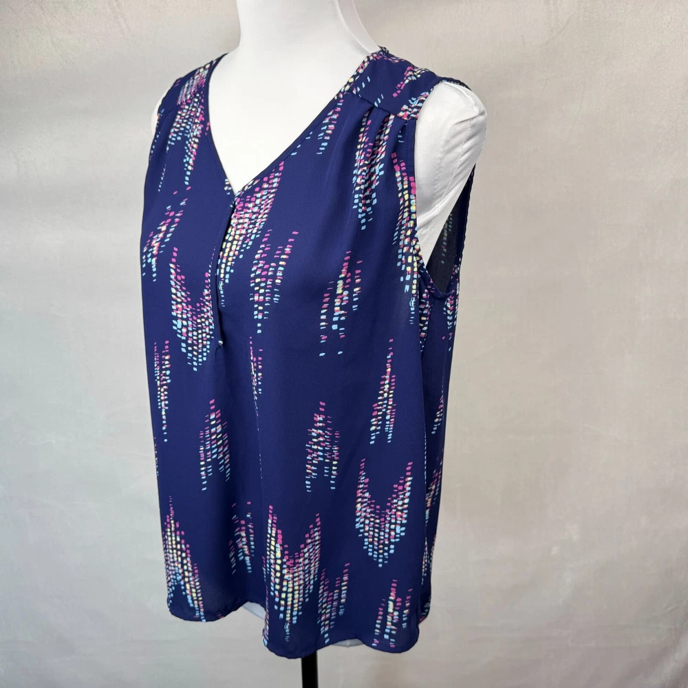 Elevate your wardrobe with this stunning Collective Concepts blouse in a beautiful blue hue. The sleeveless top features a V-neckline and a button closure, making it perfect for any occasion, be it a wedding, party, or casual outing. The blouse is made of high-quality polyester material and has a semi-sheer design that adds a touch of elegance to the overall look. The blouse comes in a regular fit, size S, and is suitable for summer, fall, or spring. The geometric pattern adds a unique touch to the blouse, making it a must-have for any fashion-forward woman. The garment care instructions recommend dry cleaning only. This blouse is perfect for women who want to add a basic yet stylish piece to their wardrobe. Measurements, Materials and Item Care: See labels photos. Item has been washed/cleaned and it is already packed, I will ship the same day or next business day. Color might differ from picture due to flashlight used , also it depends on your monitor light settings. Open to offers. B-1783