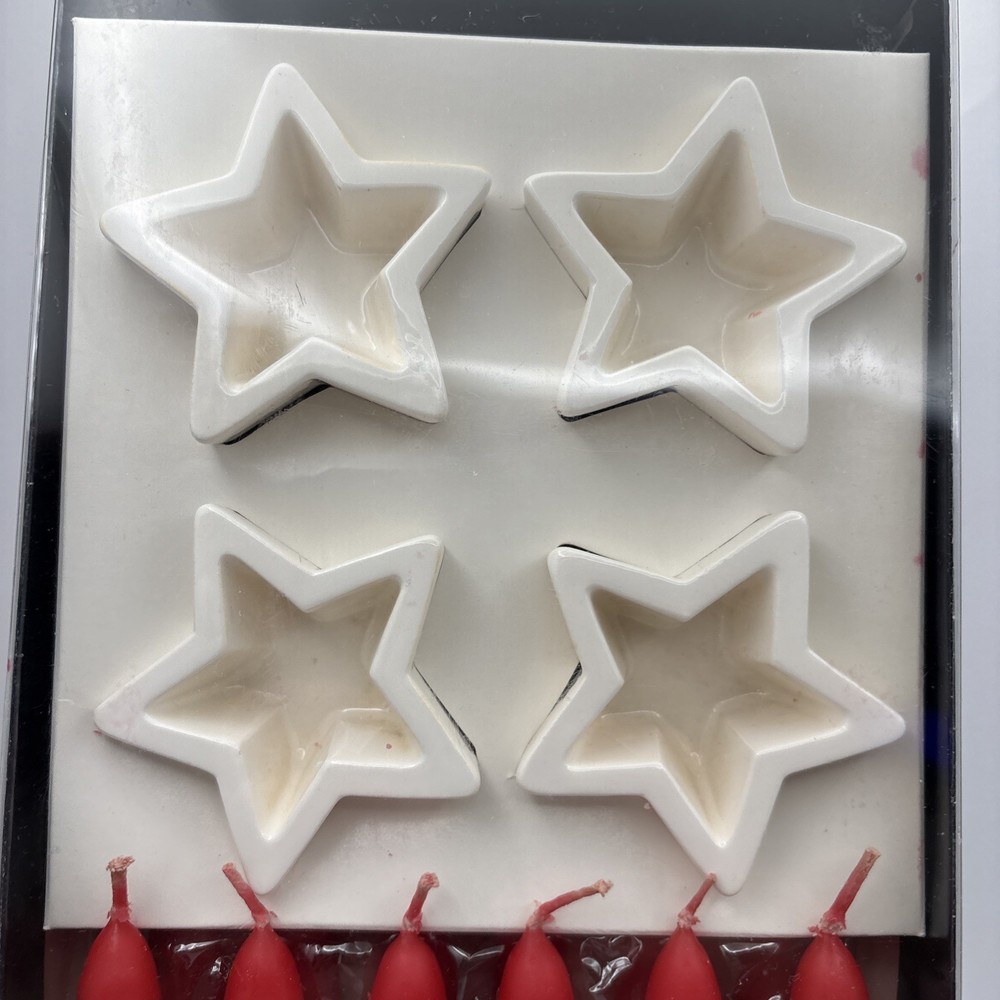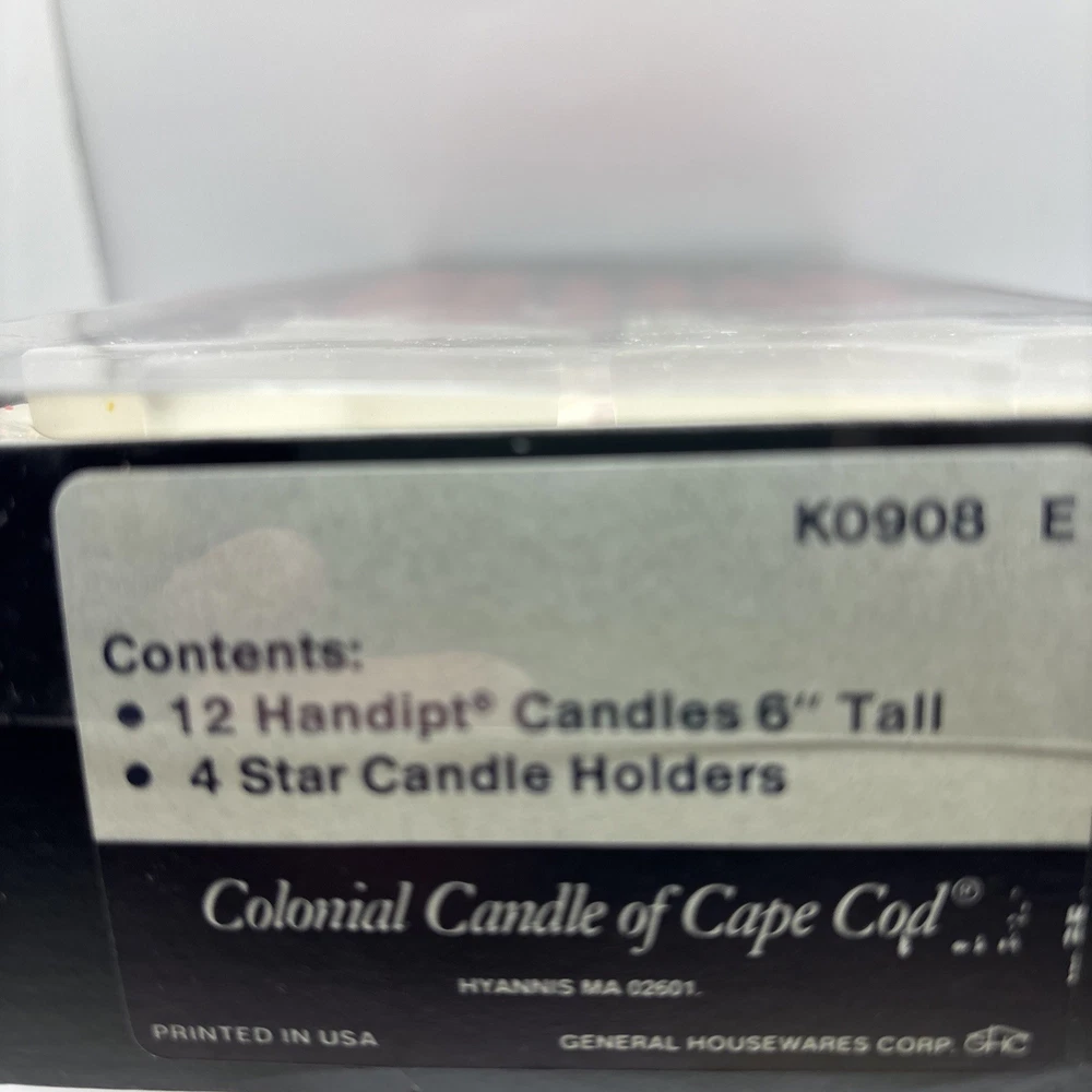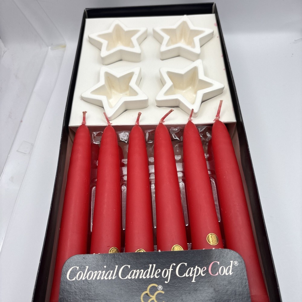 This is a box of Colonial Candles of Cape Cod. There are 12 red candles measuring 6 inches along with 4 star shaped candle holders. Made in Hyannis, Massachusetts. Items are unused in open box. Box shows wear.