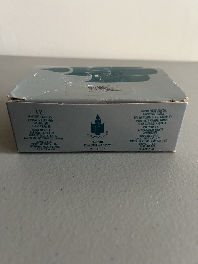 The PartyLite Colonial Yellow Pear Scented Tea Light Candles come in a box of 12 small candles made of wax. The candles are designed with a yellow color and a pear scent, perfect for all occasions. The colonial style adds a touch of elegance to any space, making these candles a decorative collectible suitable for use in cups or as a centerpiece.