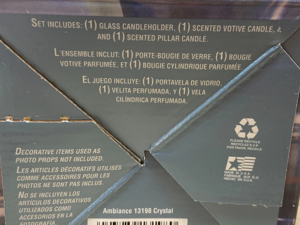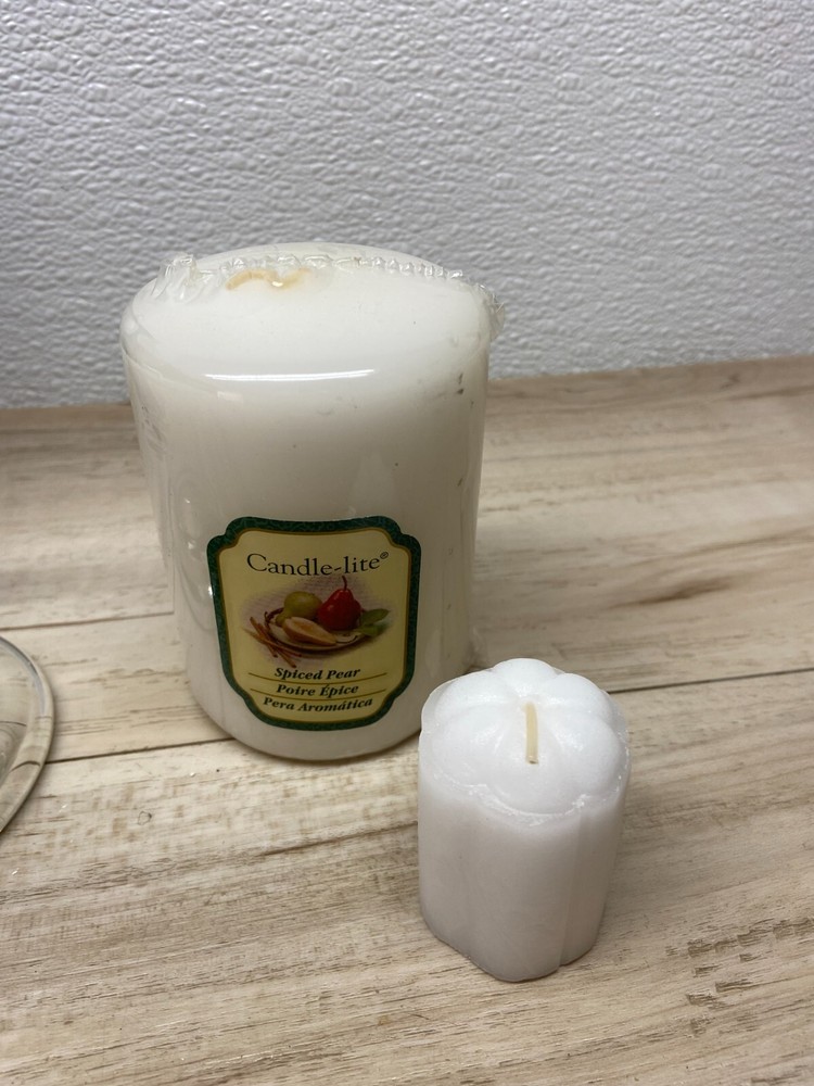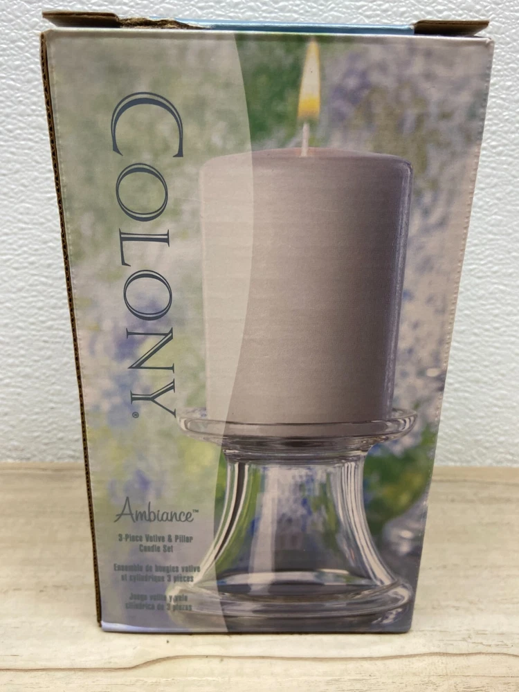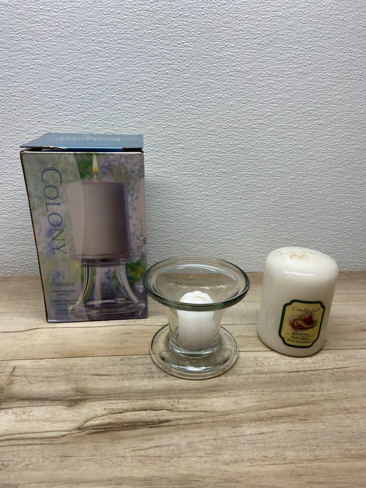 Indiana Glass Colony Ambiance Votive & Pillar Round Clear Glass Candleholder Set With Candle .1scented votive candle and 1 scented pillar candle.Made in USA WE OFFER COMBINED SHIPPING AND MULTI-ITEM PURCHASE DISCOUNTS.IF YOU HAVE ANY QUESTIONS, PLEASE LET US KNOW