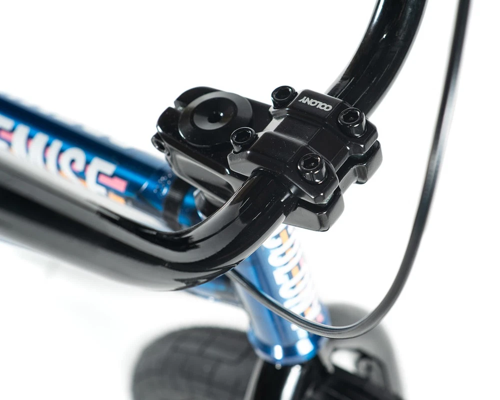 Complete Bikes, New Products / Colony Premise With the universal 20.8" top tube and the full Chromoly frame, forks and bars the Colony Premise is a great all round BMX Bike. Frame: Colony Premise Full Chromoly, 20.8" TT, 13.0" rear slammed, 75.2 HT, 71 ST, 11.5" Mid BB height, Integrated Headset. Stand over Height: 8.0" (center of BB shell to center of TT). Forks: Colony Premise Full Chromoly, tapered legs with 1 piece CNC steer tube, 25mm offset. Brakes: Alloy 990 style (rear). Lever: Alloy. Cables: Linear Slick (rear). Headset: Integrated. Stem: Colony Forged Top Load Alloy, 50mm reach. Bars: Colony Full Chromoly, 9.0" Rise x 29.5" Wide. Grips: Colony Much Room. Sprocket: Colony Endeavour Alloy 25T. Cranks: Colony Chromoly Tubular, tapered 8-spline 19mm spindle 170mm. Bottom Bracket: Sealed Mid 19mm. Chain: KMC. Pedals: Colony BMX Fantastic Plastic. (Pedals may vary on different color models) Rims: Double Wall 6000 Series Alloy 36h. Front Tire: Colony Grip Lock 20×2.35". Rear Tire: Colony Grip Lock 20×2.35". Spokes: Black. Front Hub: Colony Alloy Female Axle, Full Sealed Bearing, 36h. Plastic Hub Guards. Rear Hub: Colony Alloy Cassette, 14mm axle, Full Sealed Bearing with 9t driver, 36h. Non Drive Side Plastic Guard. Seat & Seatpost: Colony Aztec Fat Seat/Post Combo. (Seats may vary on different color models) Weight: 10.7kgs. The Colony Premise comes in Clear Blue. Note: Bike specification &/or colors subject to vary slightly Please note: All Trans or Clear coated finished frames will create rust spider webs in a short period of time. These will occur on or under the paint surface. This is the cosmetic desired effect for these styles of paint finishes. It does not affect the structural integrity of the frame. Nor is it considered a warranty case. About Us | View Store