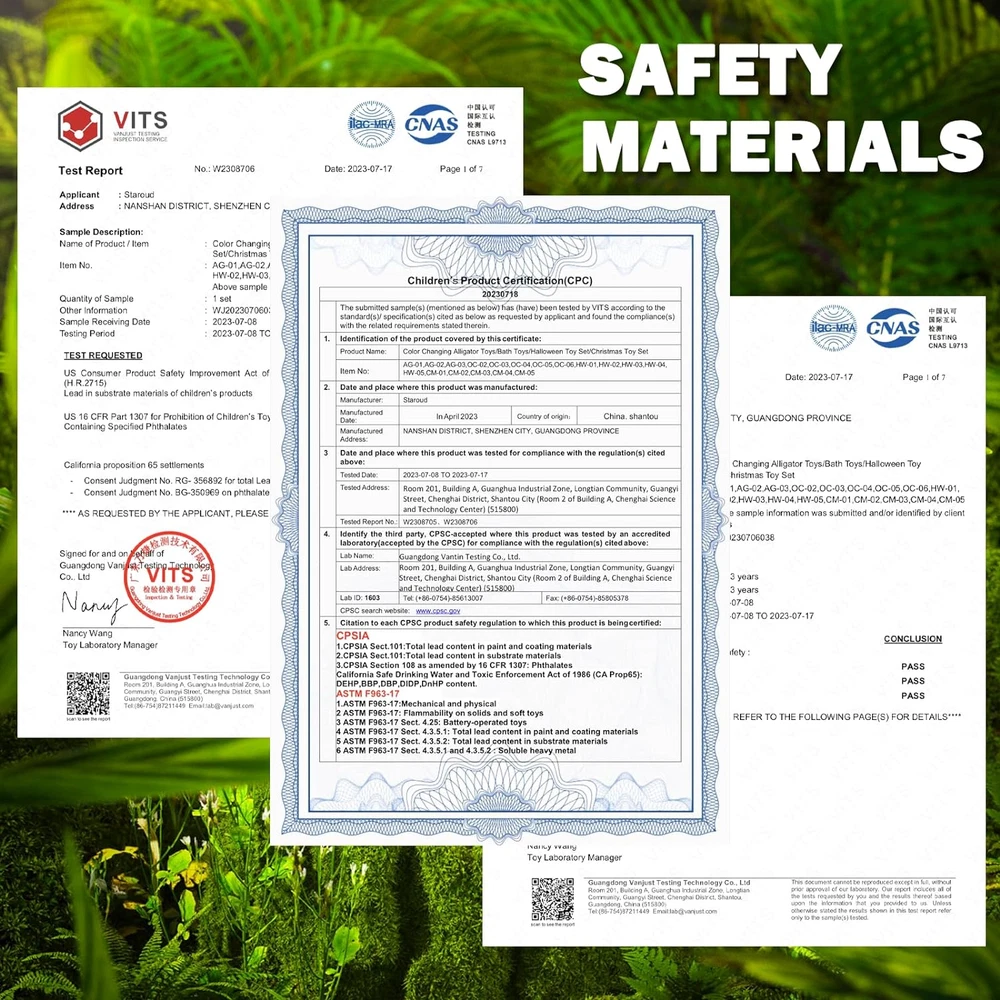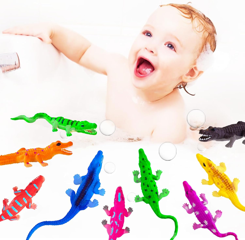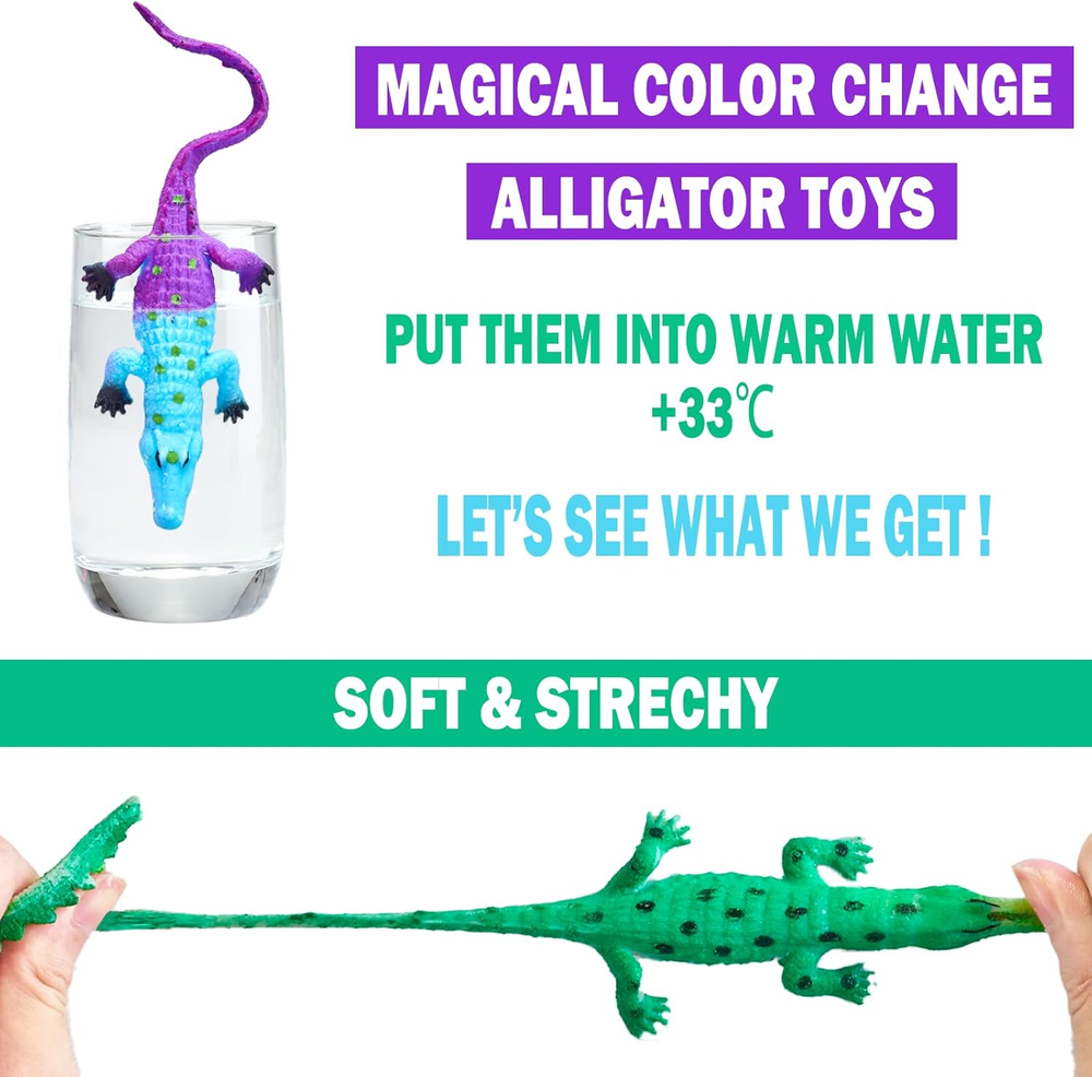 【12 PACKS ALLIGATOR BATH TOYS FOR KIDS】: We provide 12 kinds of alligator toys for kids. Each one is about 6". Suitable as bath toys, reptile party favors, water toys, bathtub toys, squeeze toys, bathroom toys, animal toys, stocking stuffers, Goody Bag Fillers, Classroom Prizes and Pinata Fillers. 【COLOR CHANGING TOYS】: 12 packs of alligator toys magically change colors in warm water above 33℃. Vivid designs and magical skills will be a big surprise for kids. 【HAND PAINT & NO HOLE BATH TOYS】: All are made by premium quality hand paint. Made of environmental and premium rubber. No hole bath toys. No glue needed. 【SOFT & STRECHY】Also perform as stress relief toys. Endless fun to stretch, twist and squeeze these alligator toys. 【HIGH QUALITY AND SAFETY】: All toys meet US safety standards (ASTM & CPSIA). Please rest assured to buy and enjoy these alligator toys. PACKAGE INCLUDED: √12 *COLOR CHANGING ALLIGATOR TOYS We have 12 kinds of alligator toys in vivid design. Magical color change and realistic design can stimulate children's cognitive abilities. Suitable as bath toys, reptile party favors, water toys, bathtub toys, squeeze toys, bathroom toys, animal toys, stress relief toys, stocking stuffers, Goody Bag Fillers, Classroom Prizes and Pinata Fillers. Meet US safety standards (ASTM & CPSIA), please rest assured to buy.