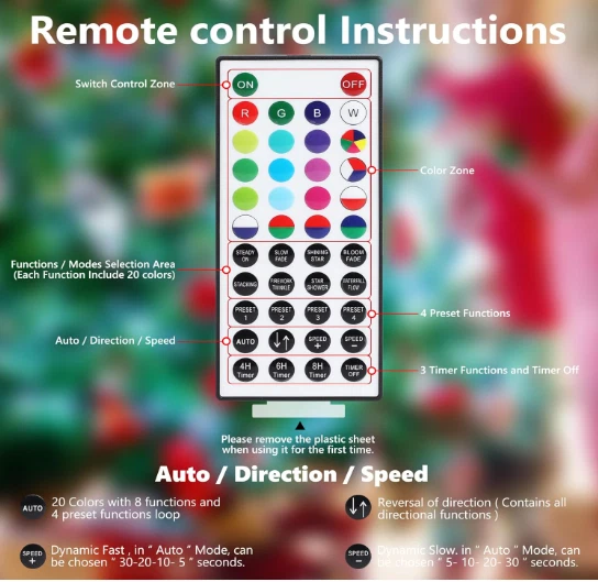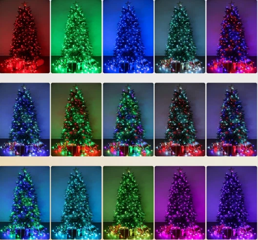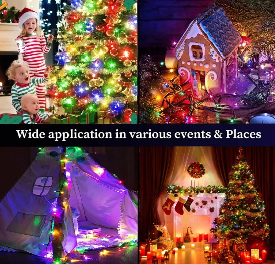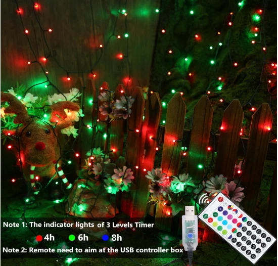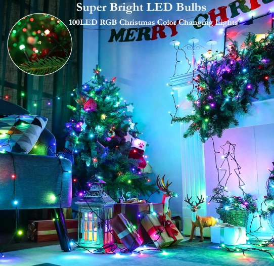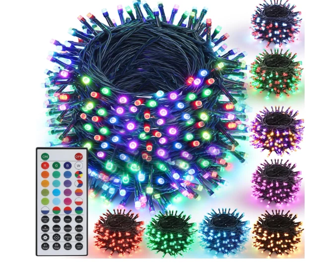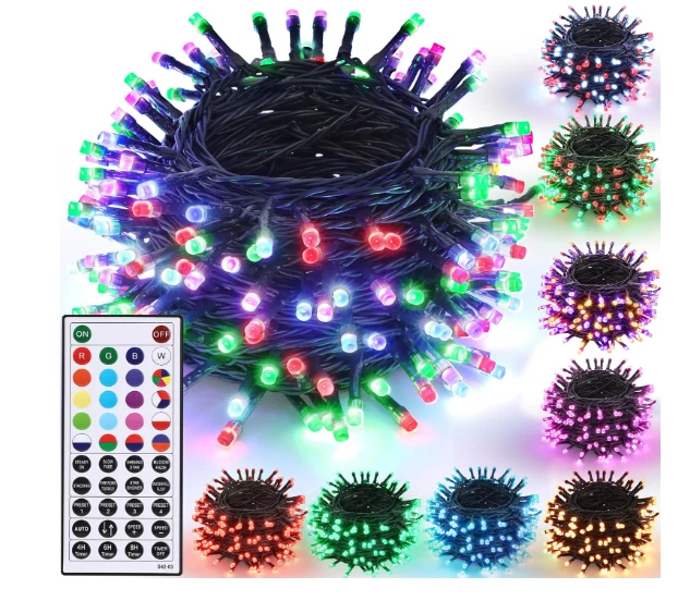 RGB Color Changing Christmas Lights 🌟 Key Features: 🌈 RGB Color Options: Choose from 24 colors, including: 16 Single Colors 6 Dual Colors 2 Multicolor Options Plus, each color offers 8 modes to suit different holiday themes like Christmas, Halloween, July 4th, Valentine's Day, and more! πŸ“± 42-Key Remote Control: Effortlessly control your lights: Select colors Choose from 8 modes per color Adjust speed and brightness (4 levels: 100%, 75%, 50%, 25%) Set a timer (4/6/8 hours) for convenience Memory Function: Retains settings for daily use πŸ’‘ Customizable Lighting: Adjustable speed and brightness settings for a dynamic lighting display. Perfect for creating the ideal holiday atmosphere with dynamic effects. πŸ’§ Waterproof & Durable: Rated IP44 Waterproof, making them ideal for both indoor and outdoor use. Suitable for front yards, gardens, trees, patios, and more. πŸ”Œ Easy to Use & Safe: Low-voltage plug for safety and energy efficiency. πŸŽ‰ Holiday Decor: Great for holiday parties, Christmas decorations, or year-round festive lighting. Warm Tips: Non-Connectable: These RGB strings cannot be linked end-to-end. The white color may have a slight blue tint. Remove the insulation sheet from the remote and point it directly at the controller for proper functionality. Transform Your Space with Colorful Holiday Lights! ✨