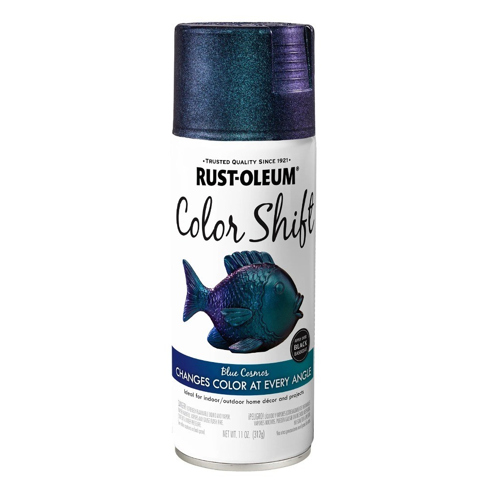 Blue Cosmos, Color Shift Spray Paint-372479, 11 oz: Contains advanced light pigments that change color with viewing angle movement. Apply a unique color shifting effect to bikes, helmets, rims, skateboards, home décor items, automotive accessories and more. It is suitable for surfaces such as wood, metal, glass and plastic. Test paint in an inconspicuous area first. Apply 3 or more light coats a few minutes apart. The more coats, the more dramatic effect, do light coats instead of heavy coats. Ideal on wood, metal, glass and plastic such as helmets, school projects, home décor and more Must apply over a solid black base coat. Allow base coat to fully cure Apply 3 or more light coats a few minutes apart. The more coats, the more dramatic effect. Do light coats instead of heavy coats Oil-based formula, surface should be primed if youre using on bare wood or metal Clean up spilled paint with spirits