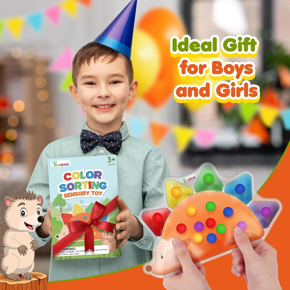 【Color Sorting Toys For Preschooler】Hedgehog-shape color sorting toys include 15 rubber beads of different colors,which squeezing and pressing the rubber beads of different colors to sort the colors and put them into the correct colors to complete the color matching game.Montessori Color sorting toys are suitable for children aged 3, 4, 5 and 6 years old and build color recognition skills. Through playing this lovely matching game, little kids can also enhance the fine motor skill and hand-eye coordination. 【Learning Through Play】Sensory toys for toddlers is designed according to the concept of preschool education, contains what toddler need to learn, allowing them to learn through play. The toddlers montessori learning toy keeps kids busy on sorting and matching colors and keep them quiet and focused for hours. Great teaching tools for preschool teachers! 【Safe & Durable Materials】Sensory fidget toys are made of soft materials, gel,and beads are firmly sealed in the sensory tubes. Even if kids or toddlers squeeze them hard, they will not break or leak. Color matching toy ranges in size from 1.18-1.77in.Perfect for toddlers to grasp.Therefore, parents and teachers can feel confident about using sensory toys for parent-child or classroom interactions. 【Sensory Calm Down Item】When kids are having big feelings, pushing the colored beads is a tactile, calming experience that helps them regain control of their feelings. Especially meet the special needs of children with autism and ADHD OCD / ADD, this sensory item provide a calming effect and help promote focus and relaxation. Ideal toys to put in preschool classroom calm down corner for autistic children. 【Ideal Gift for Todders】This color matching toy is specially designed for preschoolers. The montessori sensory toys for 3 4 5 year old will bring your kids more happiness, great toddler toys ages 3-6 boy girls, preschool learning activities. Ideal birthday gifts, Christmas gifts and holiday gifts.Nice toddler teaching tool and helpful learning resource for parents, teachers to use in kindergarten daycare classroom or at home. Product Description ZaxiDeel Sensory Color Sorting Toys for Kids