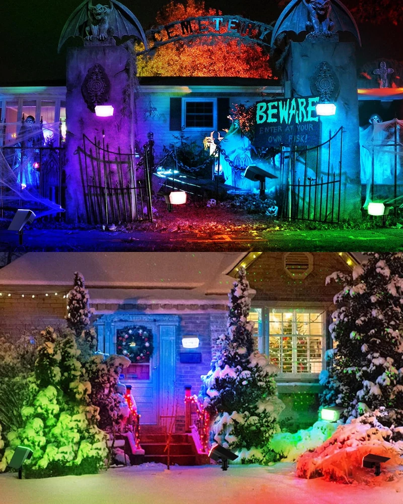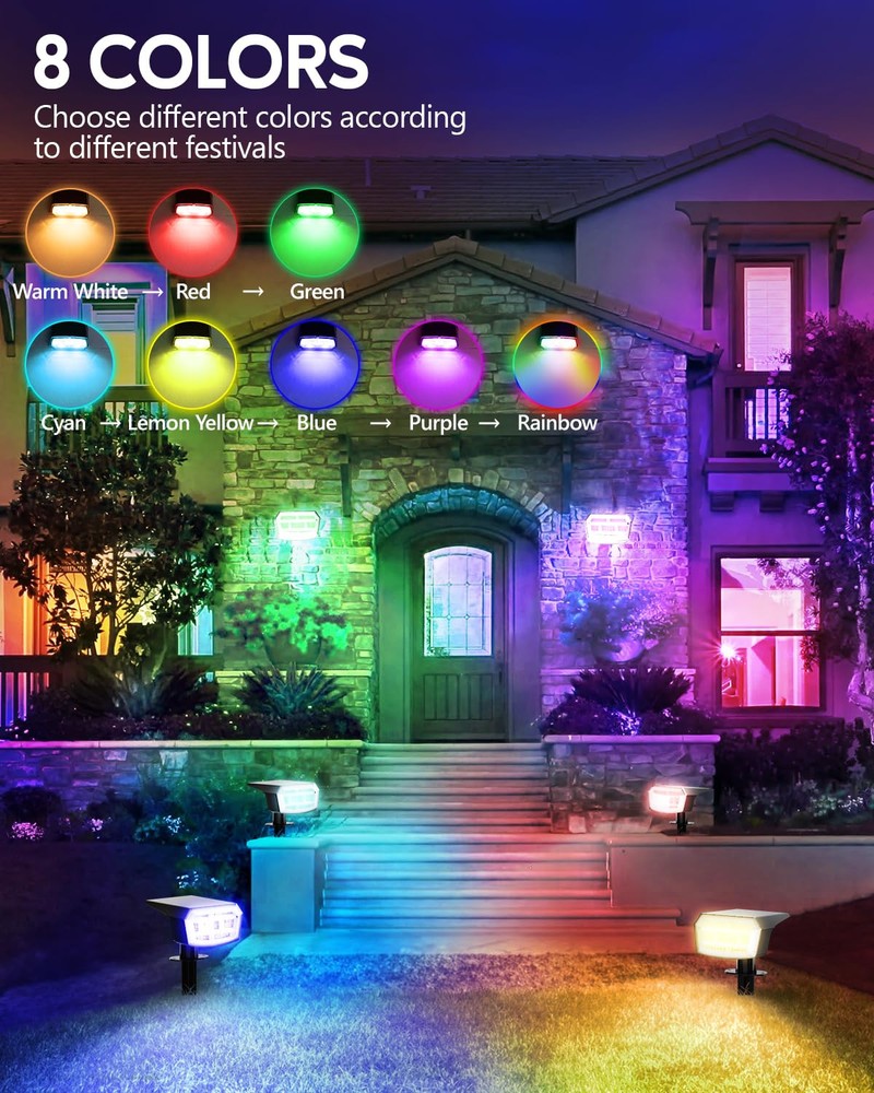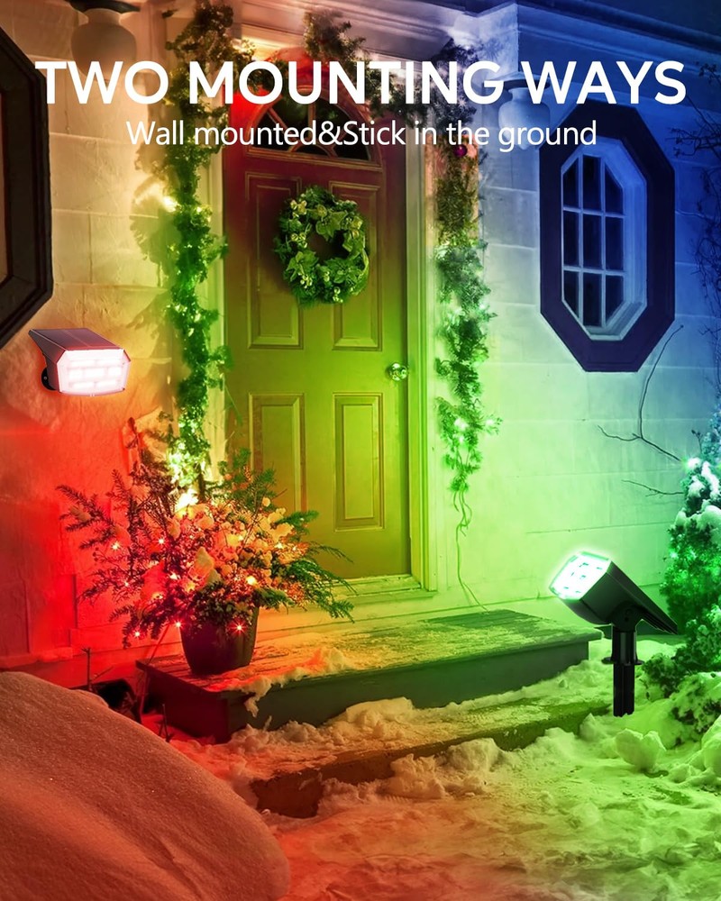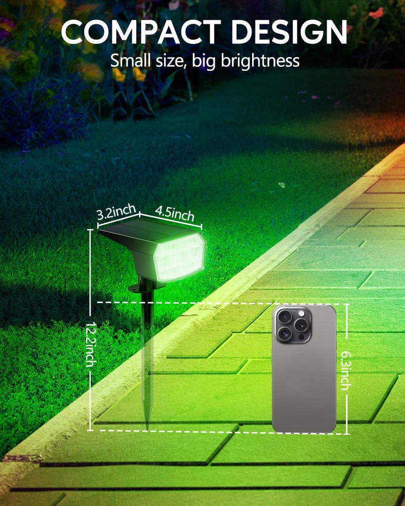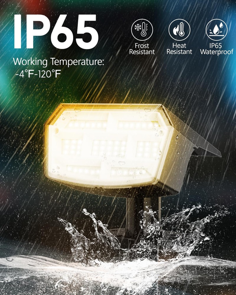 WARM TIP: CHARGE SPOTLIGHTS FOR 1-2 DAYS BEFORE FIRST USING, THEY WILL BE BRIGHTER. SOLAR SPOT LIGHTS OUTDOOR - Solar spot lights outdoor charge during the day, automatically illuminating your yard at night. With an impressive 30% conversion rate of sunlight to energy, just 8-12 hours of charging allows for 10-15 hours of brilliant light. Plus, the adjustable solar panel angle ensures maximum sunlight absorption, making these lights perfect for any garden or patio. Illuminate your evenings sustainably! COLOR CHANGING - The christmas lights outdoor have nine color modes—Warm White→Red→ Green→Blue→Lemon Yellow→Purple→Cyan→Multi Color. These color changing solar lights for outside let you easily switch to the perfect hue for any occasion. Decorate your house and yard for holidays and create a festive atmosphere effortlessly. EASY 3-MINUTE INSTALLATION - Solar uplights outdoor offer two installation options: stake it into the ground or mount it on a wall. Installing tree lights outdoor is a breeze! With just one person, you can have landscaping lights set up in a matter of minutes. Perfect for illuminating your yard, garden, landscapes, trees, and flags, this light adapts to any outdoor setting effortlessly. IP65 WATERPROOF&DUSTPROOF - Designed for all weather conditions, led landscape spotlights can be confidently used in rain, snow, and high temperatures. Crafted from durable ABS material, solar uplights outdoor ensure long-lasting performance, providing reliable illumination no matter the weather. 59 LED BEADS - Solar powered outdoor lights feature 59 high-quality, high-brightness LEDs, ensuring exceptional illumination.Garden lights are certified with CE, RoHS, and FCC, guaranteeing safety and compliance with international standards. Illuminate your house backyard with confidence!