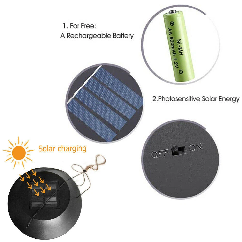 Bullet Point 【ENERGY SAVING & AUTOMATIC】 Solar-powered design, excellent automatic sensor, battery panel can quickly absorb energy, and can be used for 6-8 hours when fully charged. LED lights do not fade or deform and can last up to 100,000 hours at night. 【MULTI COLOR CHANGING LIGHT 】Set the switch to "ON" mode, and it will automatically charge during the day (placed in a sunny place). At dusk, the light will automatically turn on. From one color to another, 7 colors can be easily and gently changed. 【EASY TO HANG & MOVE】 High-quality and durable ABS material, unique waterproof design, with an "S" -shaped hanging hook, can be easily connected to the roof protrusions or trees around the garden or terrace. (Tips: Do not immerse the product in water for a long time) 【GREAT FOR HOME DECOR】 This wind chime is a great companion for home decoration, courtyard decoration and stained glass window decoration. It is a great gift for holidays, anniversaries, and Mother's Day. Can be used indoors and outdoors. 【100% QUALITY GUARANTEE 】If you want to decorate more beautiful and colorful, you can buy several products at once to decorate. If you are not satisfied with the wind chimes, please contact us for a full refund within 30 days. We provide the highest quality products and the best customer service. SPECIFICATIONS: Solar wind chime Brand iMeshbean Condition 100% Brand New & High Quality Style LED Material Plastic Power Solar/Rechargeable NiMH battery Charging time 6-8 hour in direct sunlight Color 7 Colors changing in random Switch ON/OFF (Under the panel) Package included 1 x Solar wind chime 1 x Rechargeable NiMH battery 1 x Retail package Kindly Note: 1.Hang the solar lights outdoor to enjoy direct sunlight. 2.Make sure the switch is set to "ON" position.(turn on to begin charge) 3.Covering the solar panels imitate nightfall to sure if the solar lights can turn on automatically. 4.If solar lights does not light up after it has been used for around 1-3 months,Replace the rechargeable batteries as they may be weak or worn out. Battery 1 pc "AA" 1.2v, Ni-CD, Rechargeable- Same equivalent type as recommended must be used.