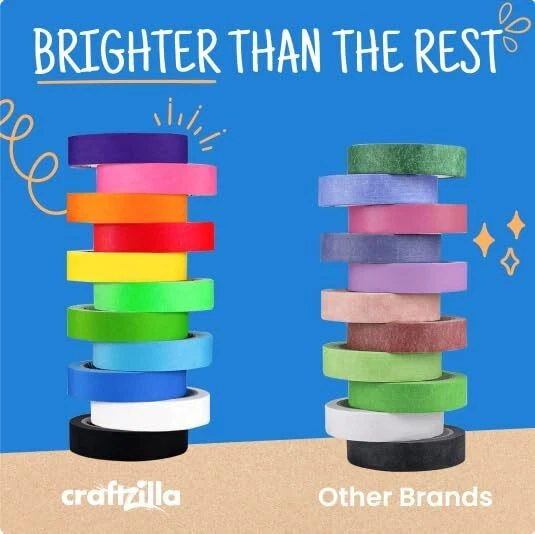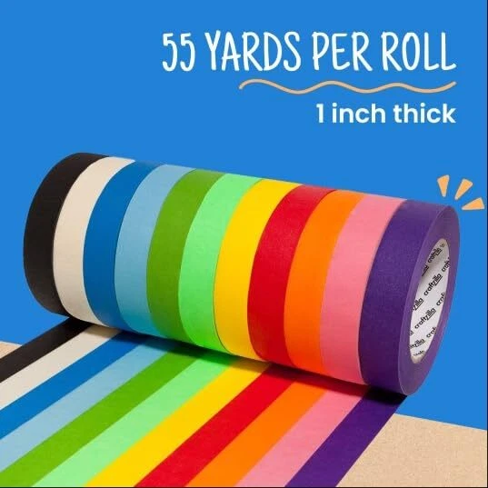 COOLER CRAFTS – Broaden your creative palette with 605 yards of exciting, colorful yards of masking tape. Whether you need painters tape or colored tape, create something beautiful with . Size: 55 Yards x 1 Inches each roll tape BIGGER AND BRIGHTER – Worried about running out of tape before you’re finished? 1,815 feet of vibrant colored tape per pack ensures you have the length and colors needed for project after project. A FULL PALETTE OF USES – Get creative with where you put your colored painter's tape every day! Use it for arts, crafts, carpentry, labeling, and anywhere else you want a sticky splash of color. STICKY, NOT ICKY – Enjoy safe and simple use at home, work, or school. Your no-mess craft tape is just the right type of sticky to stay on strong and peel off clean, thanks to its natural rubber adhesive. HALLOWEEN HAUNT – Transform your space into a spooky spectacle with our colored masking tape. Perfect for crafting haunted house decorations and adding a ghoulish touch to your party setup. ENDLESS CREATIVITY – Unleash your imagination with this rainbow masking tape set. From DIY costumes to pumpkin decorating, these vibrant colors will elevate your Halloween crafts and bring your spooky ideas to life. Perfect color tape for kids, painters, artists, and anyone who want to explore creativity THE PROMISE – Get stuck on us for our high-quality color tape; stay stuck on us for our stellar customer service. Let us help you make your next project big, bright, and bold. SCHOOL SUPPLIES Fun and functional! Decorate and reinforce school supplies with vibrant colored masking tape. Back-to-school supplies