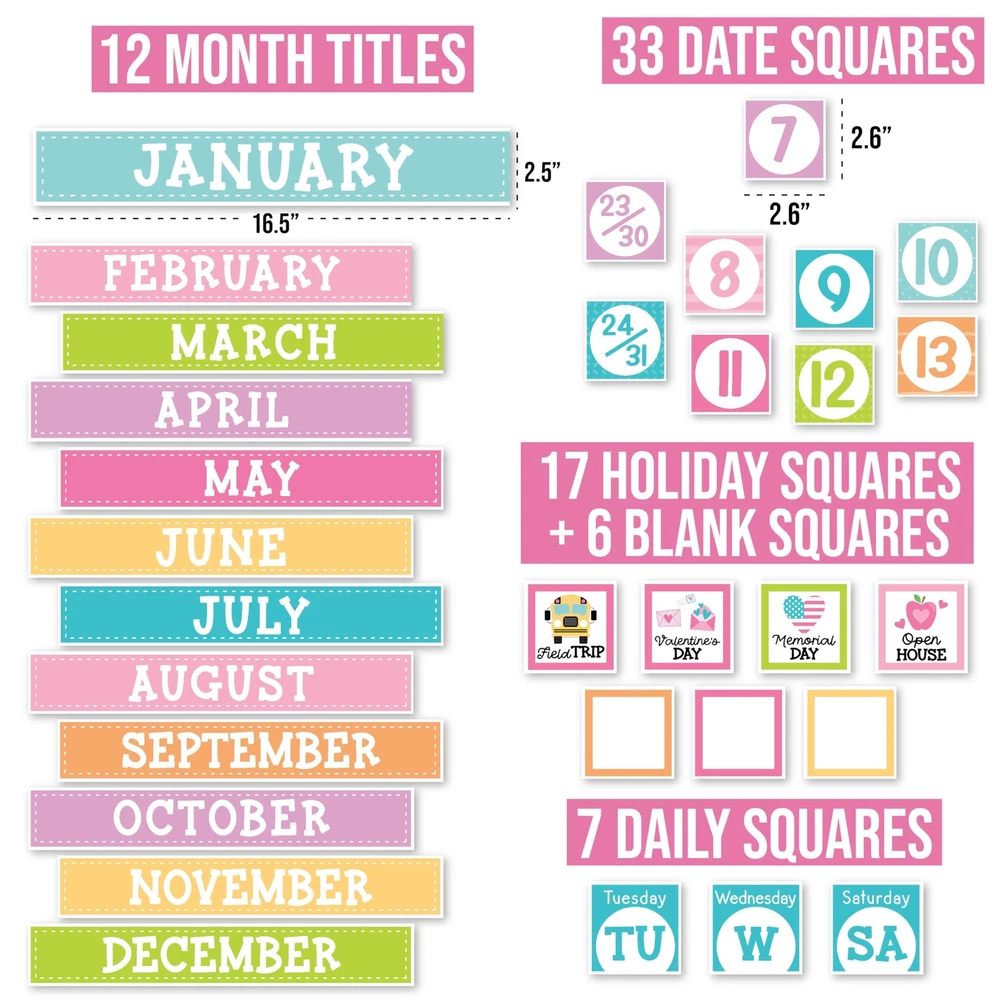 Looking to add some excitement to your classroom? Look no further than these classroom bulletin board sets! They're not only fun and engaging, but also an excellent circle time activity that fosters a lifelong love for learning. Package Includes: 98 Individual Calendar Pieces 1 - 11x14" Days Of The Week Poster 1 - 8x10" Weather Chart This calendar bundle includes everything needed to teach days of the week, months, weather, and more! Our calendar poster for classroom also captures kids' attention with their bright colors, so your students can learn (and retain!) new topics in record time. And unlike other classroom calendar numbers that are made overseas, our class calendar/classroom themes decoration sets are USA made with thick cardstock, so these classroom decor theme sets can be used year after year. Give students daily calendar practice by using this as a simple rainbow color voice level chart, pastel yellow green bulletin board months of the year, blue red doodles preschool classroom must haves, weather chart for preschool, school calendar for classroom elementary teacher must haves, calendar classroom must haves for teachers elementary, class calendar numbers for classroom, teacher calendar for classroom decor theme sets, homeschool calendar for school, kindergarten calendar for classroom decorations for teachers elementary, calendar set for classroom elementary classroom must haves, bulletin board decorations for classroom essentials for teachers elementary, calendar preschool classroom must haves, kindergarten classroom must haves, prek classroom essentials, 2nd grade classroom must haves. Our family-owned business wants to help you create a fun learning space. If you have questions about our classroom must haves, classroom essentials, teacher supplies for classroom, or our preschool classroom supplies, please don't hesitate to reach out. If You’re Looking To Make Circle Time Educational And Fun; Then you need this modern boho calendar set for classroom elementary; While other calendar classroom are made overseas, our preschool classroom calendar set is proudly USA made Get Kids Excited About Their Day; You'll receive 98 individual calendar pieces, 1 - 8x10 weather chart, and 1 - 11x14 days of the week poster; Inspire a love for learning with this muted tones school calendar for classroom elementary/teacher calendar for classroom Capture Attention And Boost Focus; This bright colorful calendar numbers for classroom helps grab and hold kids' attention; Skyrocket learning speed and retention with this classroom decorations, classroom wall calendar, months of the year bulletin board set Sharpen Critical Thinking Skills; Use as a bohemian homeschool calendar, kindergarten calendar for classroom, voice level poster for classroom, weather chart for classroom, months of the year for classroom, bulletin board decorations for classroom We are so confident in the quality of our calendar chart for classroom that we offer a lifetime manufacturer warranty; If you have any issues with your preschool bulletin board sets, we will replace them with a smile; Our family-owned business is here to help you create a positive learning environment where kids can succeed now and in the future; Why wait, get your calendar days for classroom today
