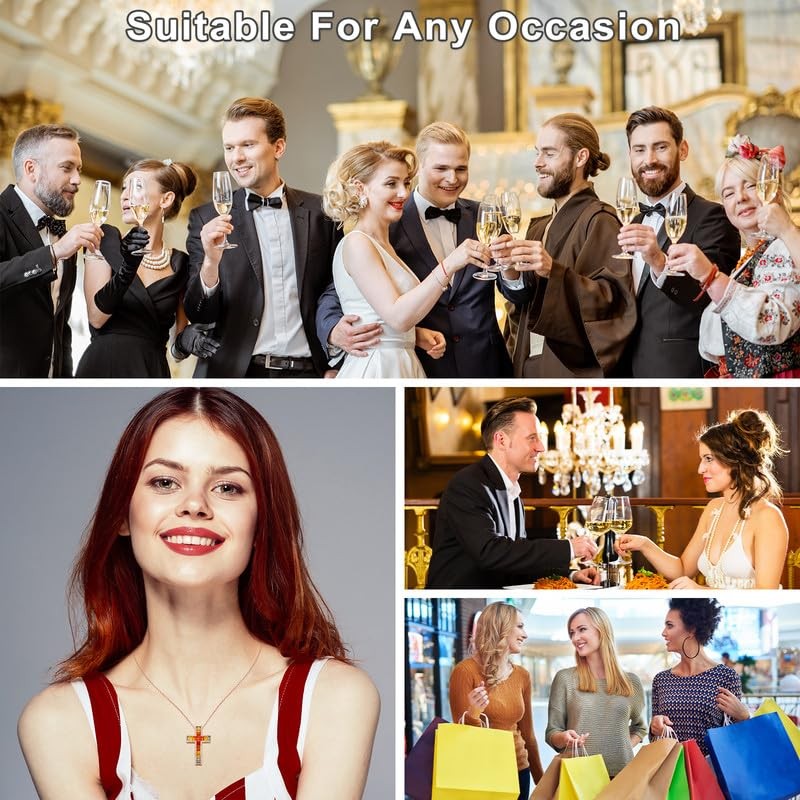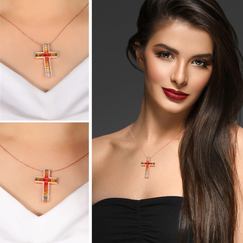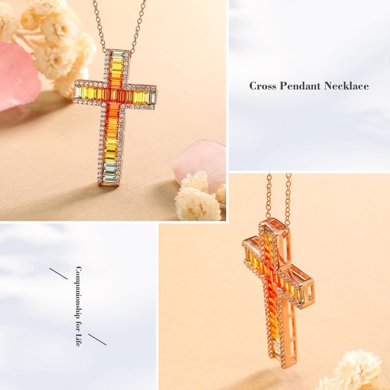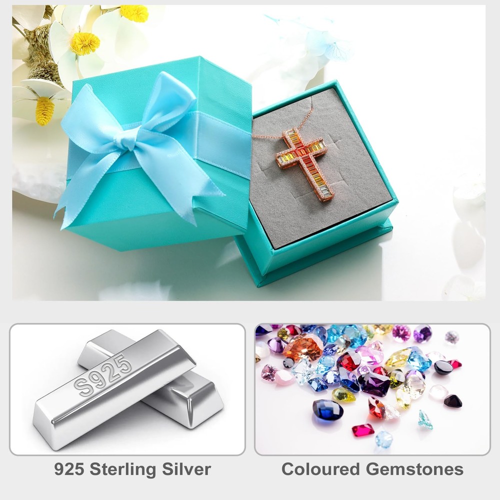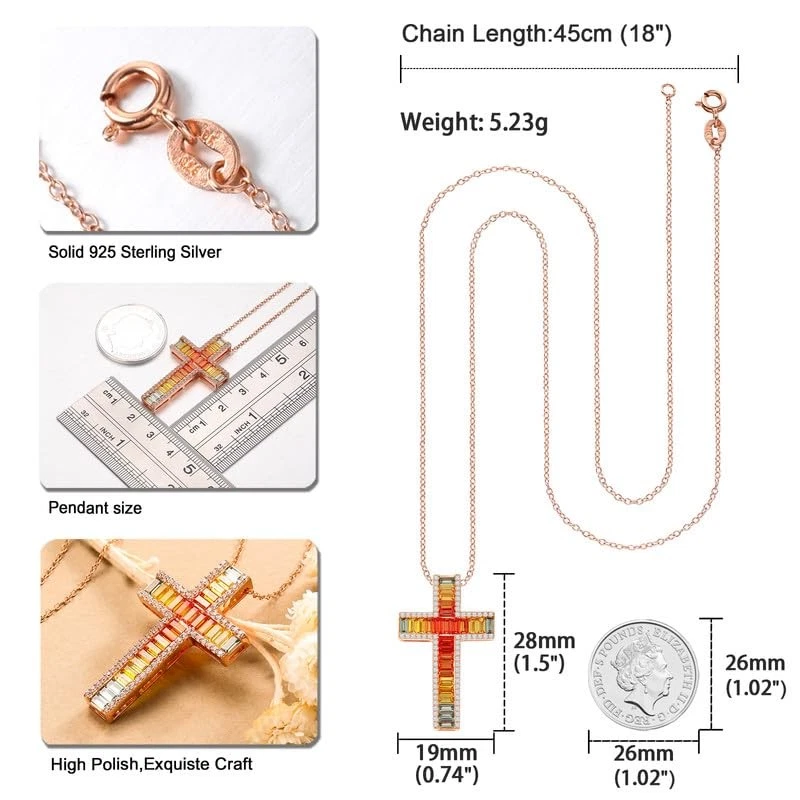 This stunning cross necklace features a colorful gemstone pendant set in sterling silver. The eye-catching design of the big necklace is sure to make a statement, while the 18" chain with a 2" extender. This elegant and timeless piece is perfect for adding a touch of faith and style to any outfit. Perfect for everyday wear or special occasions, this cross necklace is a must-have accessory for anyone looking to showcase their faith in a fashionable way. Cross Necklace for Women: The cross necklace symbolizes faith, hope and love. This big colorful cross necklace will bring you strength and keep you brave in difficult times Colorful Cross Necklace: This multi gemstone necklace is adorned with baguette cut colorful 5A lab created stone, the colors are arranged from dark to light, adding a touch of elegance and brilliance to the overall design Sterling Silver Cross Necklace: This cross necklace crafted from hypoallergenic 925 sterling silver and plated with thick 14k rose gold to give extra shine, not easy to fade or turn green, great for sensitive skin and very comfortable to wear Cross Pendant Necklace: This women cross necklace delivered with a jewelry box, great for everyday wear or mother necklace wedding necklace love necklace anniversary necklace or any special occasion for yourself or love ones like wife, grandma, bestfriends Jewelry: If you have any questions about this christian cross necklace, we are ready to help, you can enjoy your stunning gemstone necklace cross to the fullest