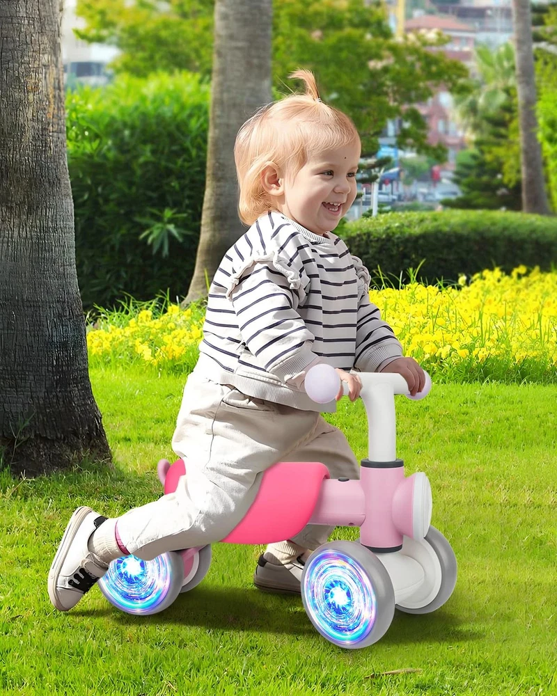 blance bike GLOW WHEEL: Cool colorful lighted 4 wheels are more eye-catching to make babies more interested, inspires their curiosity. Bring more fun to your baby.No extra energy supply required, colorful light can be emitted just by rotating the wheel.The headlights (need batteries)enhance visibility, adding a safety feature for evening rides SOFT MUSIC: The balance bike built-in 5 songs and 5 cute animal sounds on the tail button, the cute music makes the baby more willing to move and enjoy the fun of sports. The combination of movement and music together promotes the development of children's perceptual ability and body coordination SAFE AND STABLE DESIGN: The balance bike has a 135° turning limit design to avoid side falling,Low centre of gravity design,Stop when you baby land. Self-balancing design to prevent tipping, The sturdy frame and wide, grippy tires offer stability and control,built to withstand the rigors of toddler play while providing a smooth and comfortable ride EASY TO ASSEMBLE: Balance Bike can be easily assembled in just 4 steps, upgraded self-locking buckle and screws double locking wheels, no need to worry about tires falling off, great protection of the baby's safety BEST FIRST BIRTHDAY GIFT :The colorful lighting toddler balance bike is sure to delight any young children aged 12-24 months and provide hours of entertainment. It's a thoughtful and practical present that promotes active play and outdoor exploration from an early age.