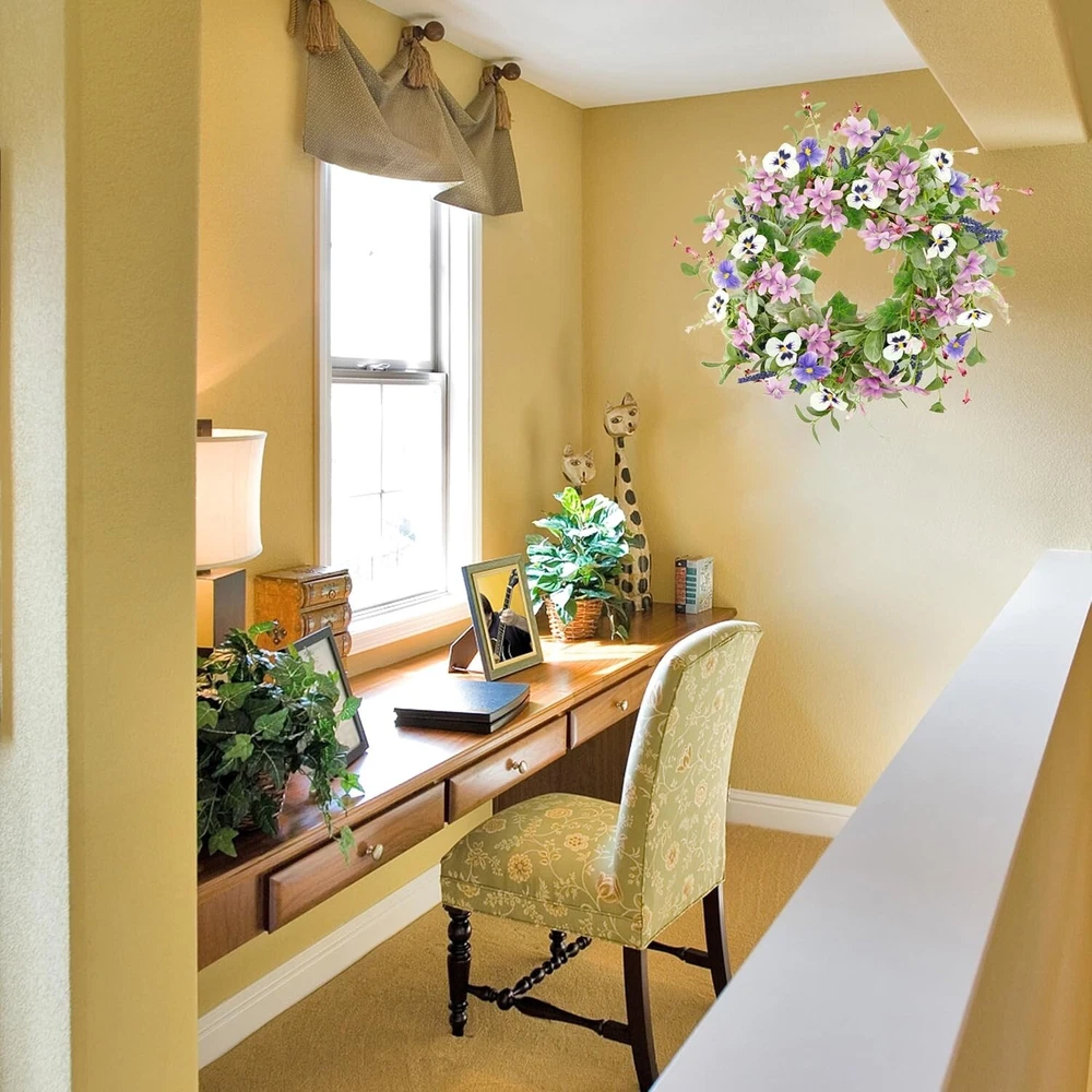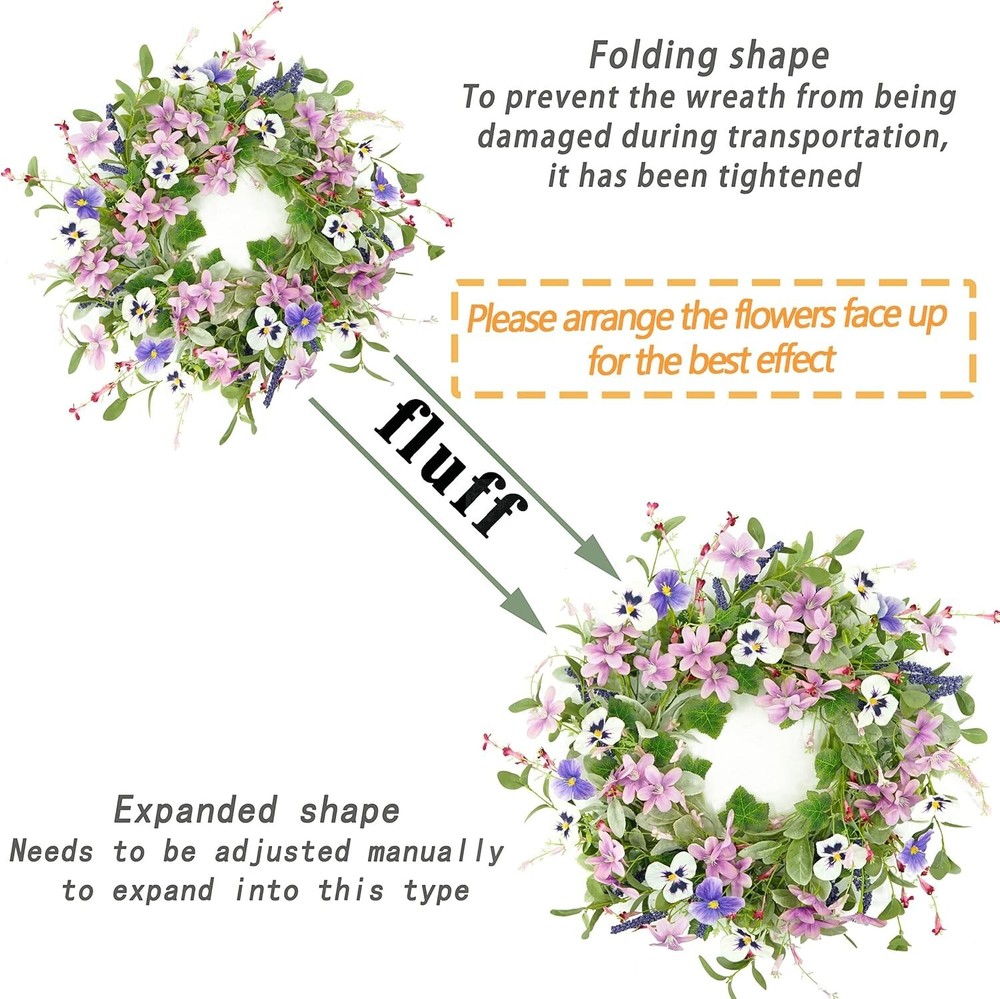 Spring Wreaths for Front Door Summer Wreath with Pansy Flower Lamb Ear Leaves Color: White Pansy and Lavender Flowers B Material: Silk Shape: Round" or "Oval Product Dimensions: 20"D x 20"W x 5"H Occasion: Multi-purpose ADJUST WREATH SHAPE : branches of the spring summer wreath are made of bendable wire, so you can shape things as you go, and keep monkeying with them until you make it look just as you want. Please adjust or bend the branches on the wreath and arrange the pansy flower heads upward for best display.,the maximum size of wreath can be 20". VERSATILE DECOR:This spring summer floral wreath is suitable for front door, wall, indoors,outdoors,window,fireplace,farmhouse, living room, porch, centerpiece party, wedding, holiday and festival celebration. It will provide your home a feeling of natural and vatality. BEST FRIENDS FOR spring summer wreath : Suitable for spring, wedding, home, wall, window, front door, fireplace, living room, bedroom, dining room, fireplace, porch, window and other indoor and outdoor decoration. Add glamour to your spring and summer season with this striking pansy and lavender wreath. EASY CLEAN: The handmade wreath is convenient to clean, just wipe it with a try towel to make the wreath like brand new. The green leaves and branches are not easily falling apart. This wreath can be used for a long time. PACKAGING DESIGN: we pack the wreath to gift box and we Tighten the wreath when packing so that the wreath can be protected when delivery,pls open and fluff the wreath and adjust the branches,flowers, the maximum size of wreath can be 20". Return Policy: We offer a 30 day return policy from the receiving date. Please contact us for a Free Return Label. Please use our return label so it will go back to our supplier and we can do a refund or replacement afterwards. Feedback: Your satisfaction is very important to us! If you have any problem with your order, please contact us and we will do our very best to make you satisfied. As long as you are happy with your purchase, please leave a positive feedback for us. We will always leave you a positive feedback in return. If you have any problem with your purchase, please do not leave a negative feedback. Please Contact us ... and your issue will be solved quickly and positively We are a small family-owned business trying to make a living, not a huge company that does not care ... We will ALWAYS do our best for you!