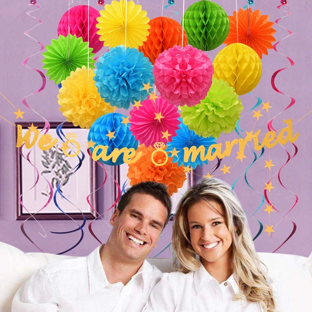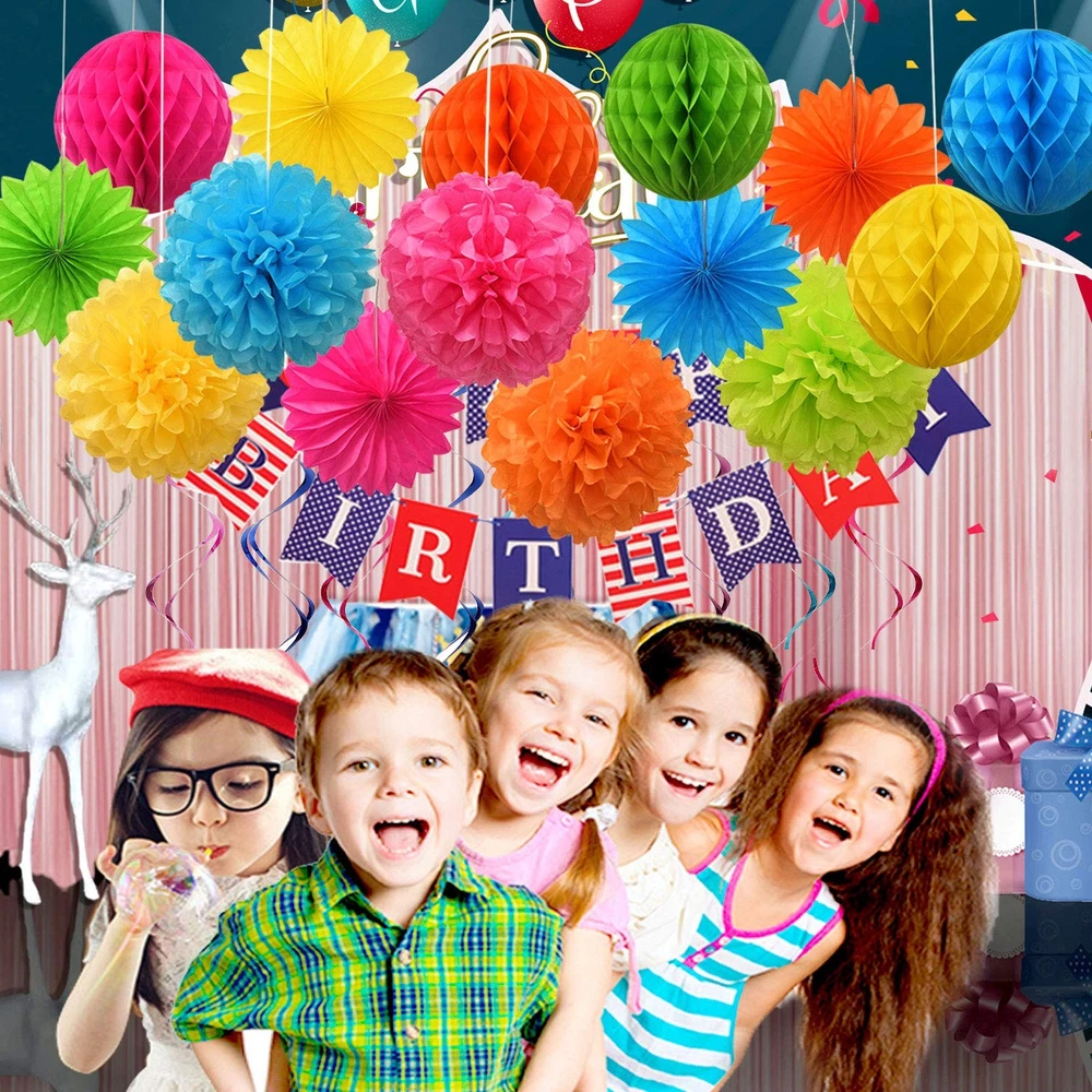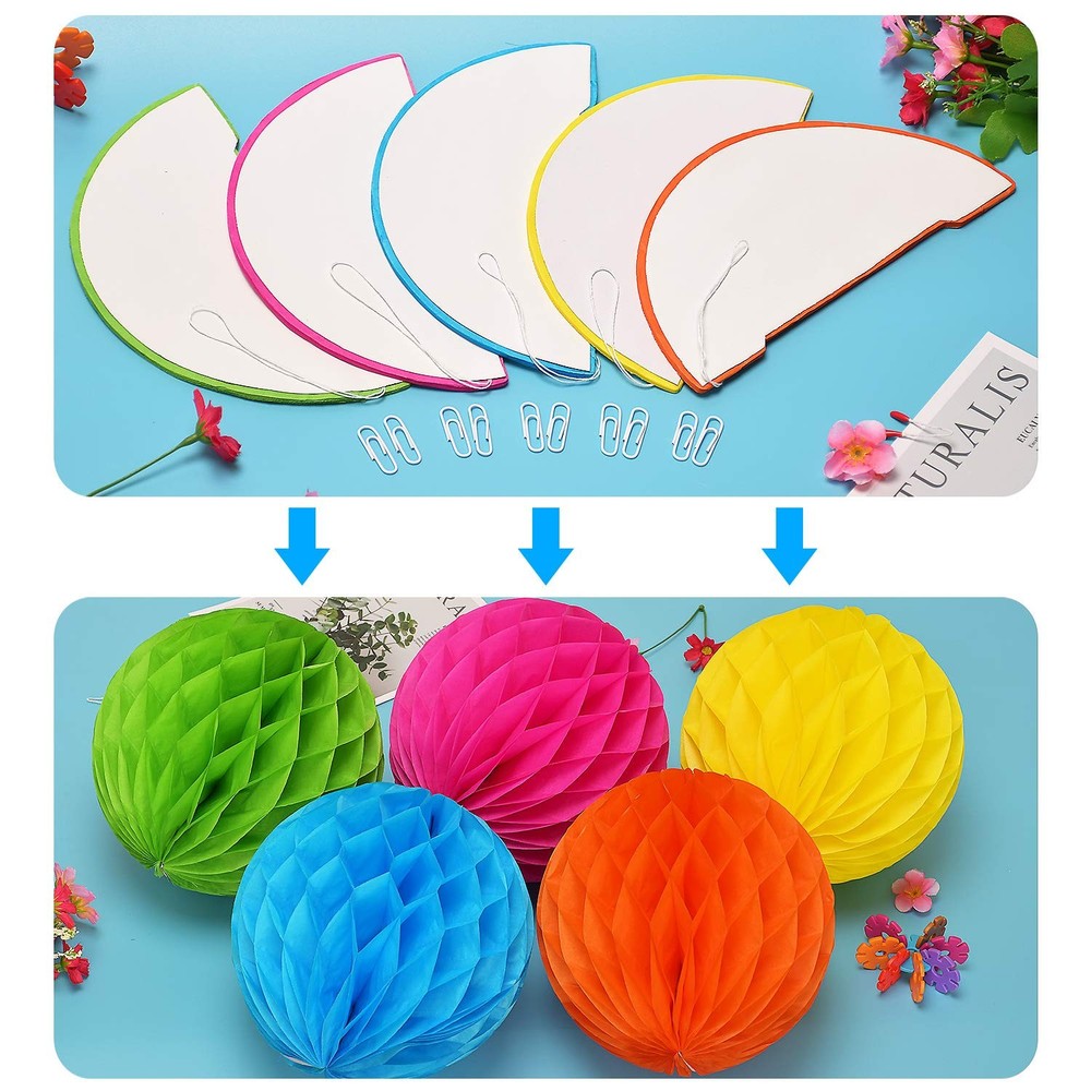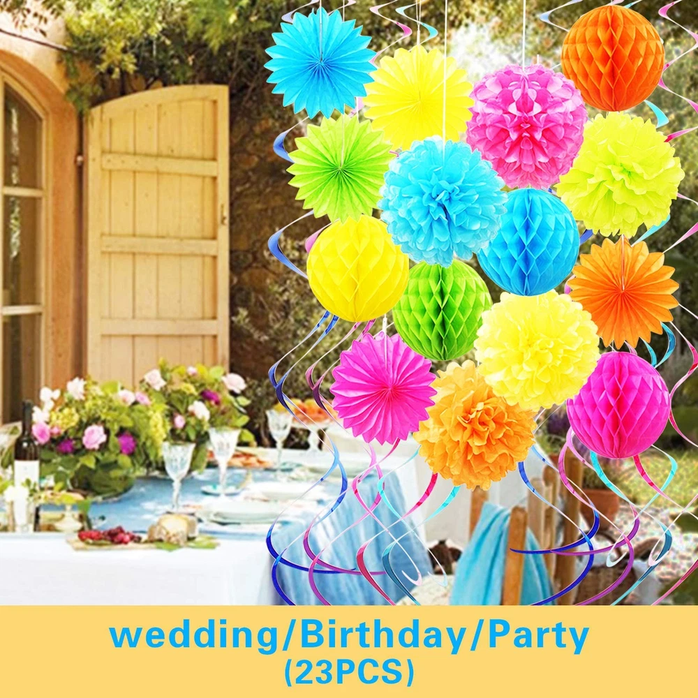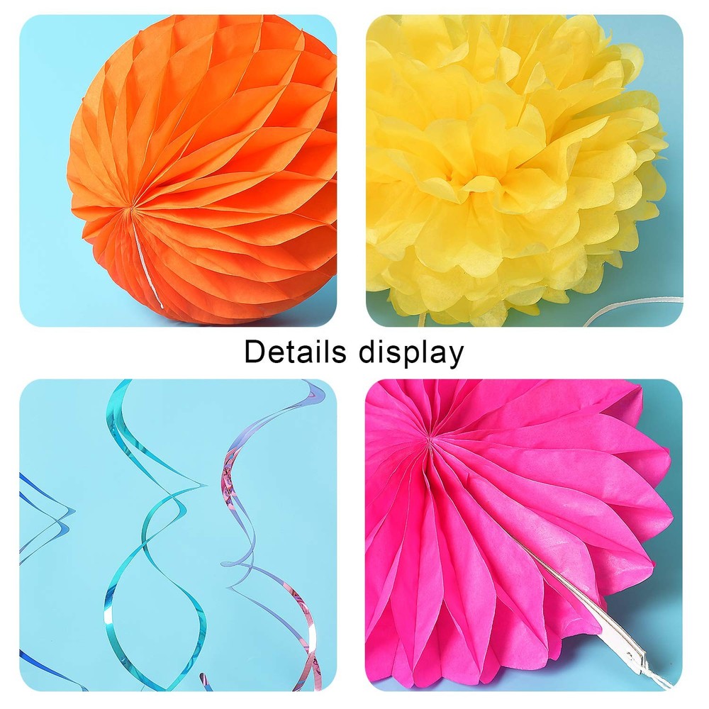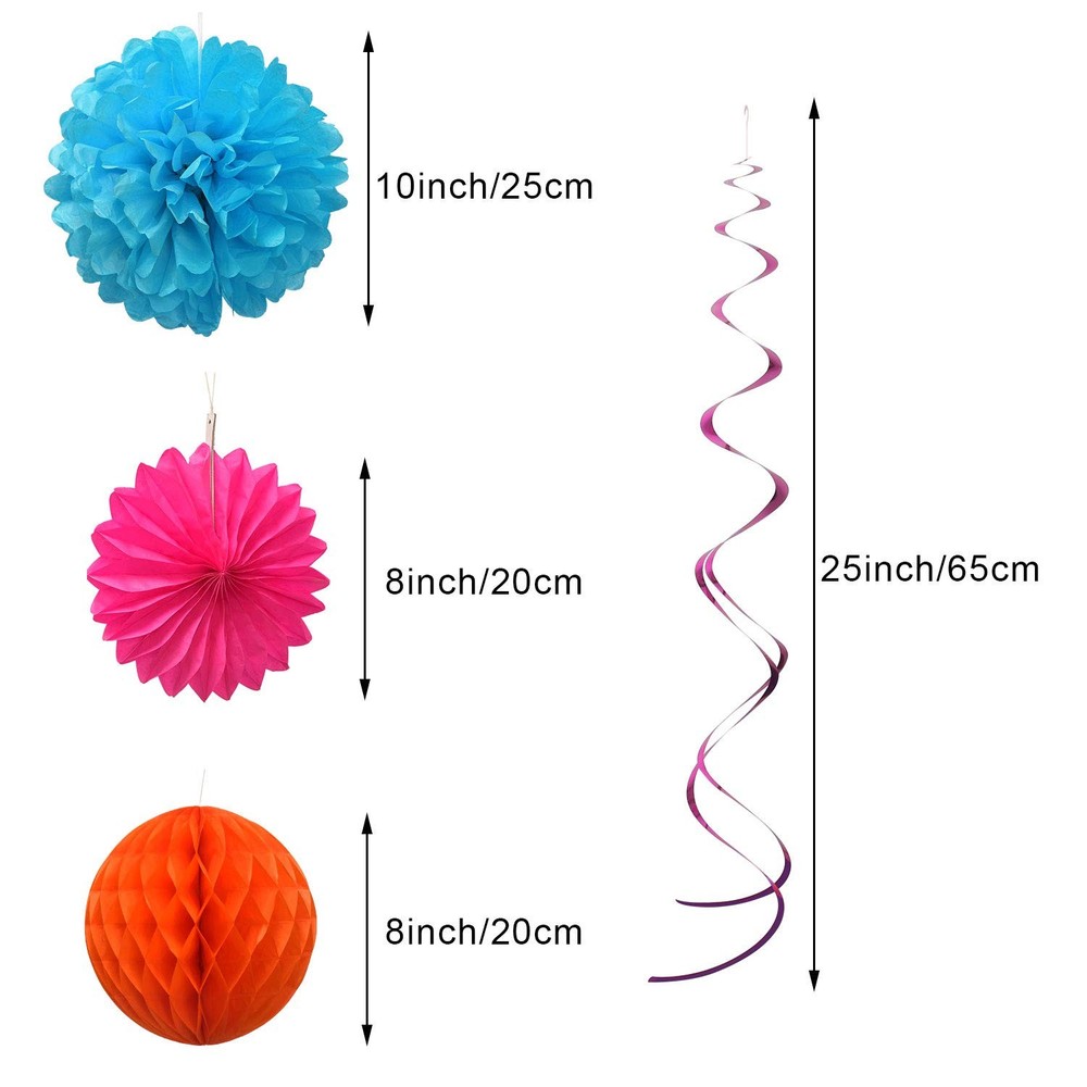 Product Specifications: Each Honeycomb Ball is 8" in diameter; Metal Swirl is 31"; Pom Pom is 10" in diameter; Paper Flower Fan is 8" in diameter. Color: Color. Material: Toilet Paper Quantity: Set of 23 12 Months Warranty: We trust our products. Therefore, all of our products are guaranteed to be of high quality, backed by a 12-month warranty, and we offer friendly and easy-to-contact support. 1.【Much thicker&More durable】 Our Paper Party Decorations use much thicker paper stock than the other brand so our paper flowers are very durable. The thicker paper tends to hold up nicer. The party décor set boasts vivid assorted colors for party and holidays that command attention. 2.【Premium Material】 These tissue paper set are made with thick, high quality 100% recycled tissue paper. The Paper Flower and pom poms prevent yellowing over time to ensure a long-lasting appearance. Your family, kids and guests will love the cheer and joy these bring to your home. 3.【Joyful Environment Creator】Colorful Paper Party Decorations Come in a big set of 23, the Honeycomb Ball come flat and easily open them to make a nice round lantern. Once they are opened, simply hang them with any string, ribbon, or fishing line. Once the holidays are over, they can be reused or recycled. 4.【Perfect Choice】Our accordion lanterns make a great decoration for any party, wedding, bridal shower, corporate function, or any party which you need to add some fun and festive decorations. Whether you’re looking for stunning decorations for a bridal shower or wedding or wishing to create a magical setting home holiday décor. 5.【Package Content】5pcs*Honeycomb Ball; 8pcs*Metallic swirls; 5pcs*Paper pom poms; 5pcs*paper fan. Each honeycomb Ball diameter is 8"; metallic swirls is 31";Pom poms diameter is 10";Paper flower fan diameter is 8"