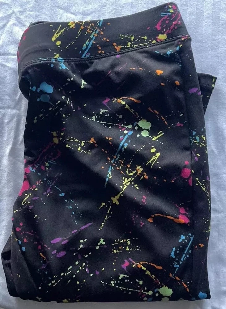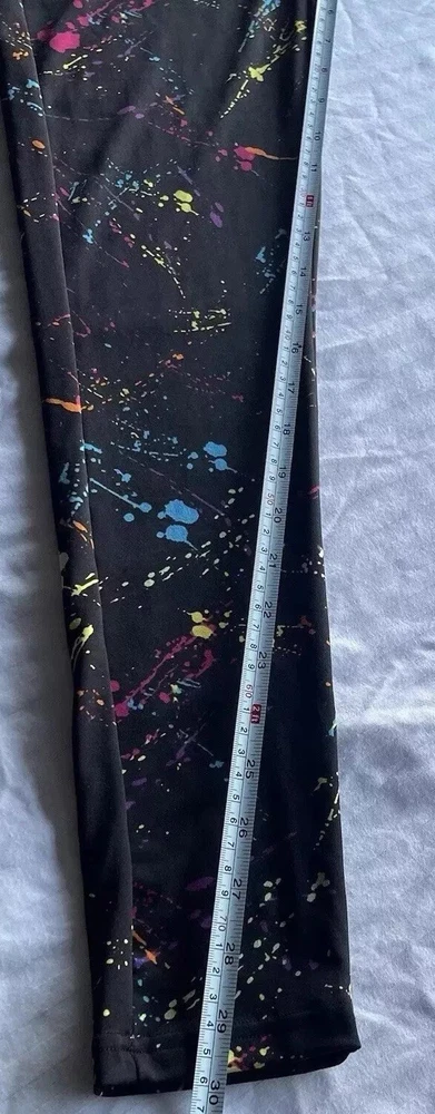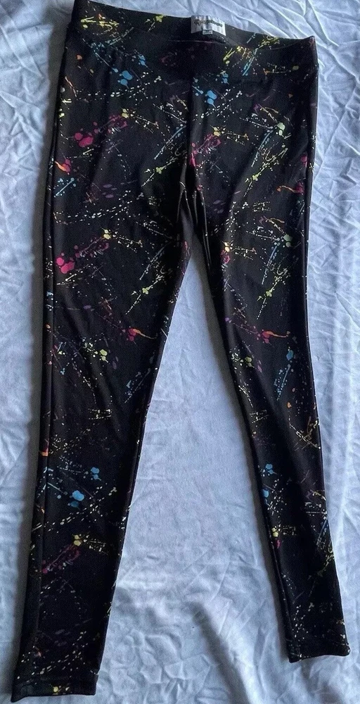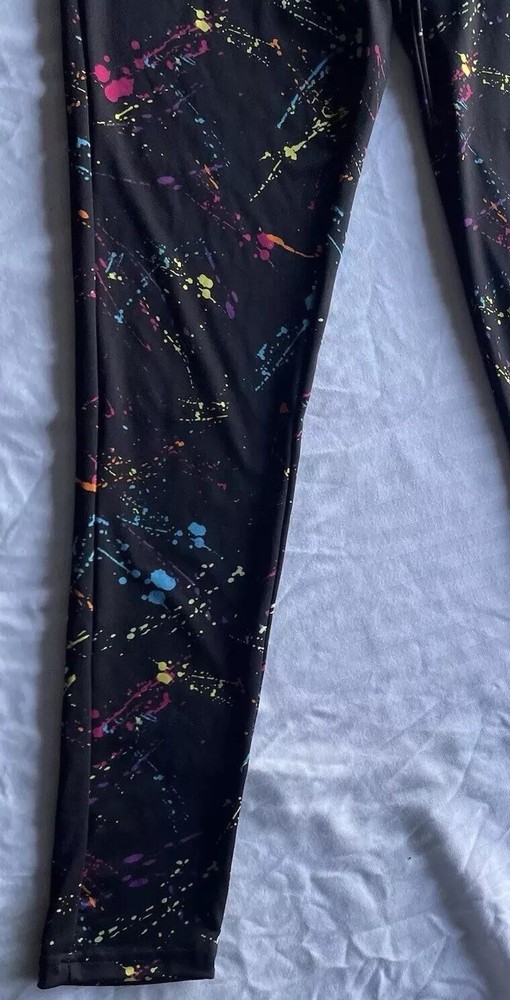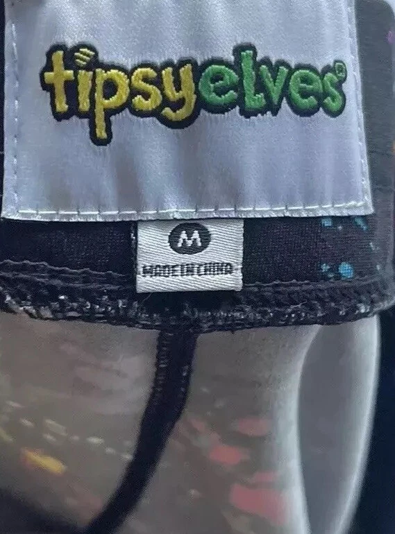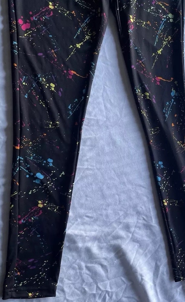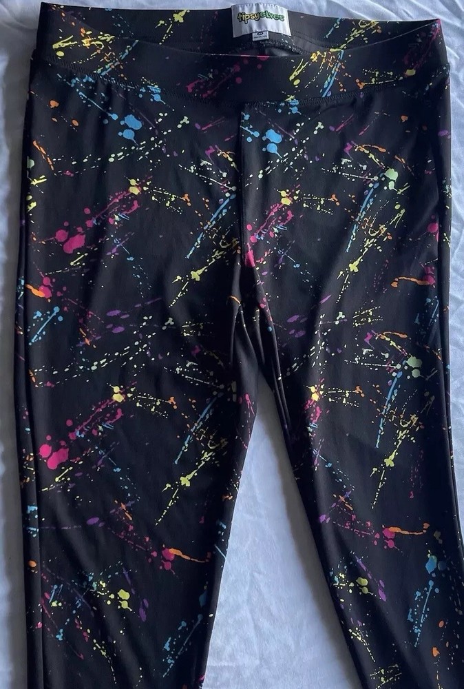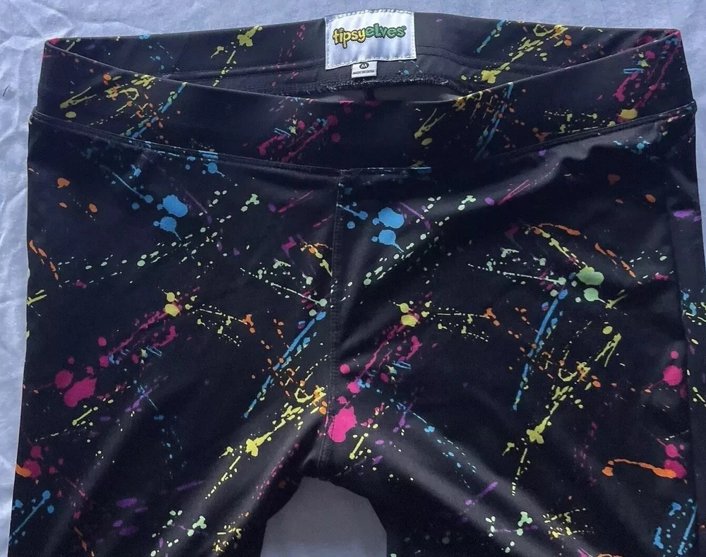 These Tipsy Elves leggings in size Medium for women feature a vibrant splatter paint colorful print, giving off an artistic and eye-catching look. Made of Spandex material, these jegging-style leggings have a vintage design with sequin accents, adding a touch of sparkle. The elastic waist and stretching fabric provide comfort and shaping for various activities like gym training, walking, yoga, or even a party or cocktail event. Perfect for all seasons, these leggings are a fun and stylish addition to any wardrobe.