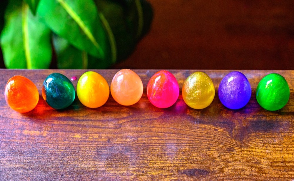 Handmade Translucent Resin Decorative Eggs – Set of 8 Add a bright artistic touch to your home décor with this handcrafted set of colorful resin eggs. Each piece is individually handmade using high-quality epoxy resin and pigments, creating a beautiful glass-like translucent effect that glows in natural light. These decorative pieces are perfect for styling shelves, coffee tables, tiered trays, office desks, or display cabinets. They function as year-round home accents and also make a unique gift for art lovers, collectors, or anyone who enjoys colorful décor. No two eggs are exactly alike — slight variations, color movement, and tiny internal swirls are part of the handmade process and make each set one-of-a-kind. Details: • Set includes 8 resin eggs • Handmade with epoxy resin • Translucent / glass-look finish • Smooth, polished surface • Freestanding display pieces • Indoor decorative use only Approximate Size: Each egg measures approximately 2.25–2.75 inches tall. Perfect For: • Shelf décor • Coffee table styling • Tiered tray décor • Desk decoration • Gift giving • Seasonal displays (spring, summer, Easter, or year-round color accents) Please note: These are decorative art pieces and not intended as children's toys. Your set will be carefully packaged to ensure safe delivery.
