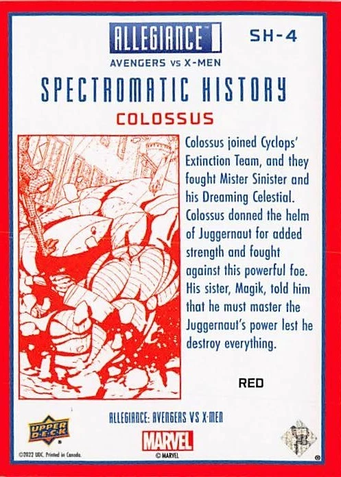 Unleash the might of the Colossus with this exclusive 2023 Allegiance Avengers Vs. X-Men card, a spectacular addition to any collection. Featuring the iconic Marvel figure, this special insert card is a vibrant red parallel variety, limited to just 150 copies, making it a unique treasure for enthusiasts and fans alike. Crafted with precision by Upper Deck, this collectible card boasts a serial number, ensuring its authenticity and rarity. As part of the distinguished 2023 Allegiance set, it captures the essence of the Avengers and X-Men franchises, marking a historic moment in the ongoing saga of superhero prowess and camaraderie.