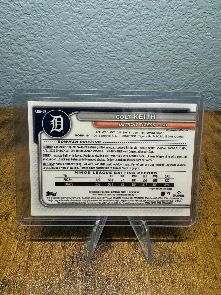 This is a rare and highly sought-after Colt Keith Tigers 2024 Bowman Rookie RC Mega MOJO Auto trading card. With a card number of CRA-CK, it features the Detroit Tigers player in his rookie year. The card is manufactured by Topps and is part of the Major League Baseball (MLB) League.The card is in excellent shape and has been well-maintained, ensuring its longevity. It comes from the 2024 Bowman set and is a sports trading card that is perfect for any baseball fan. The card is a Mojo Refractor parallel/variety and has features that make it stand out from other cards. This is a must-have for any collector who wants to add a valuable and unique card to their collection.