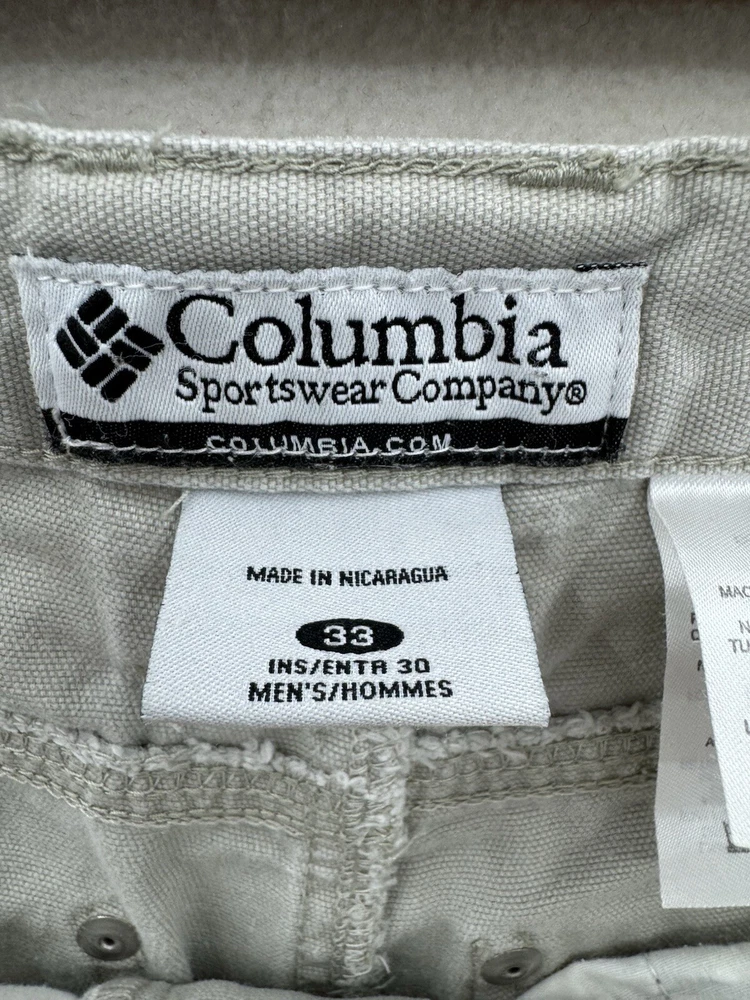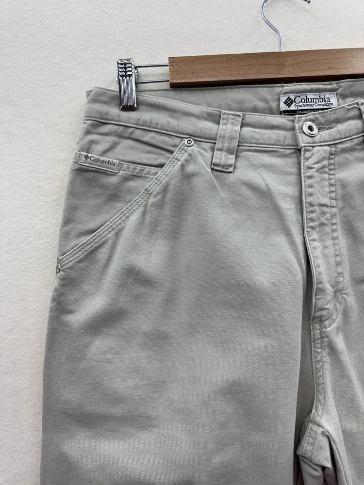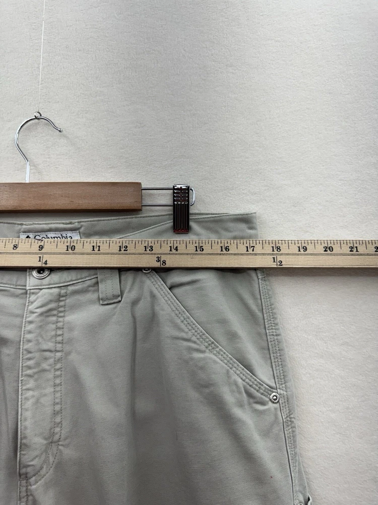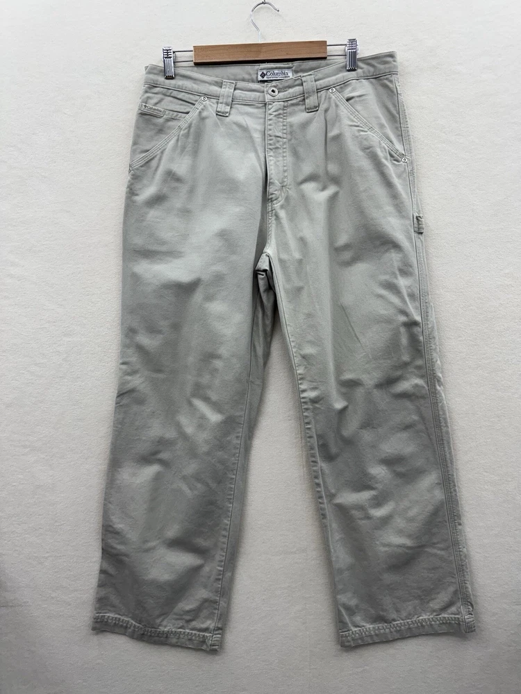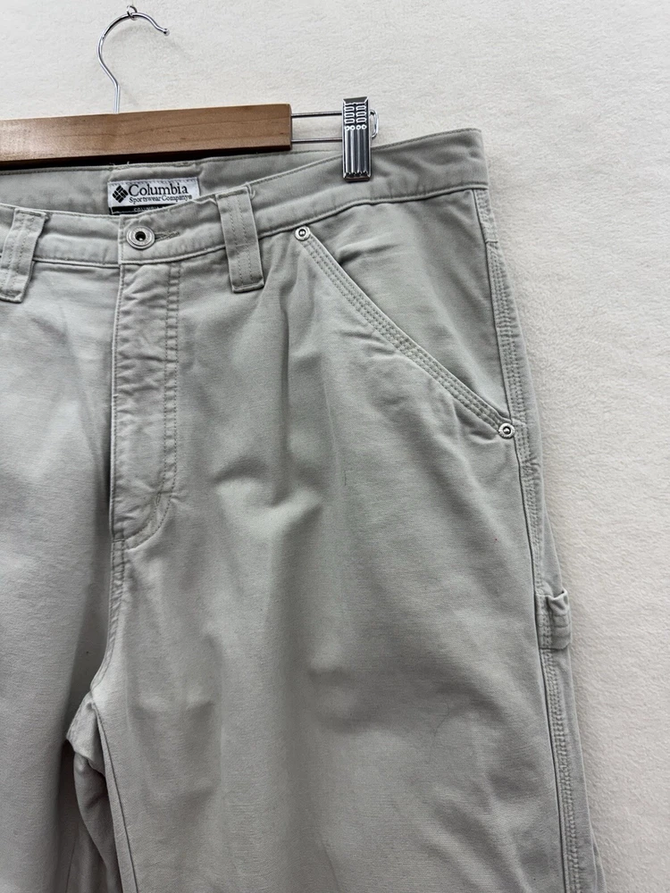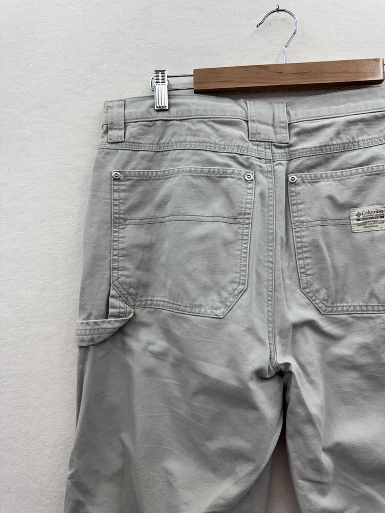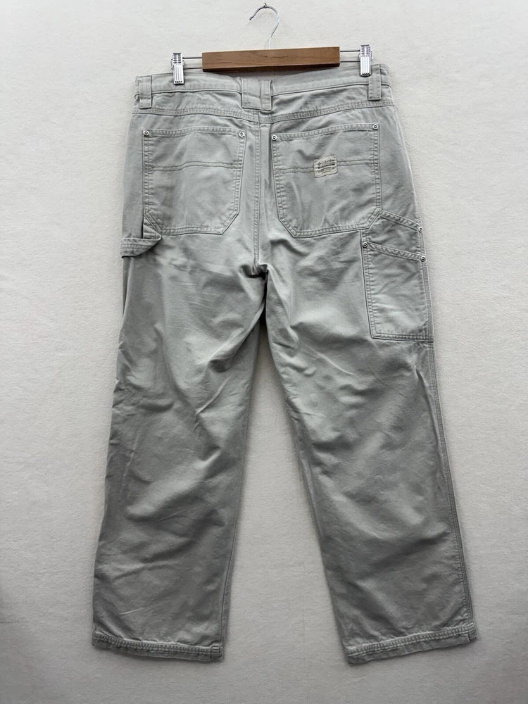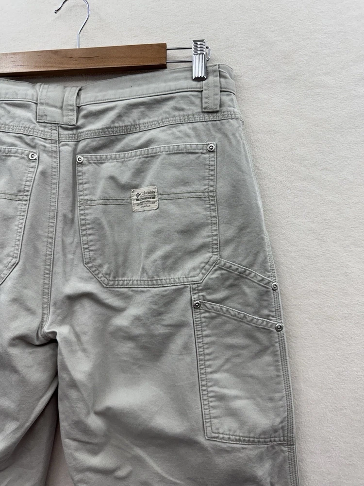 Elevate your outdoor style with these Columbia men's carpenter pants. Made of durable cotton canvas material, these pants are perfect for any casual, workwear, or travel occasion. The pants come in a beige color with a mid-rise and straight leg style, featuring a flat front and zip closure. With plenty of pockets to store your essentials, including cargo and slash pockets with zippers, these pants are perfect for any outdoor adventure. The pants are machine washable and made to last through any season, whether it's winter, summer, fall, or spring. The Columbia logo adds a touch of accent to the overall design.