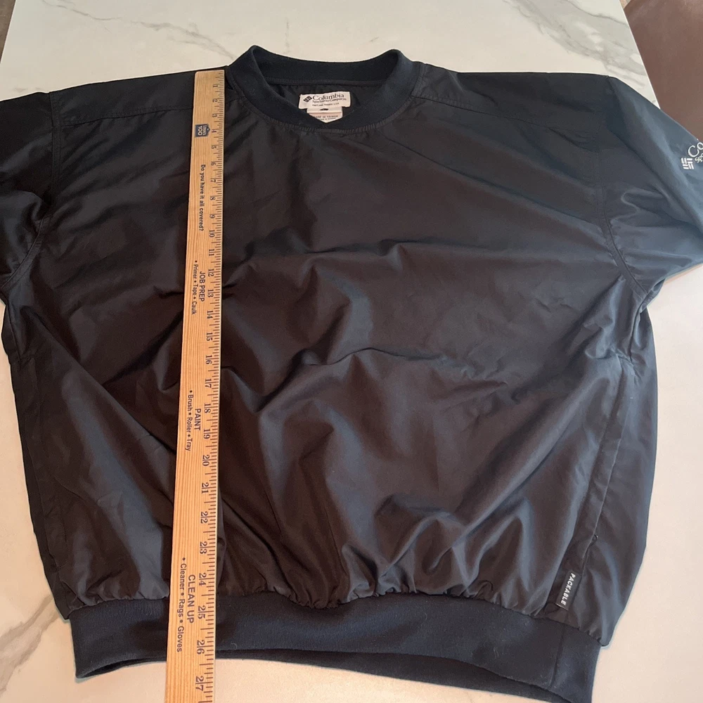Crafted for the active man, this Columbia Golf Jacket offers versatile functionality across all seasons. The sleek black color and solid pattern make it a timeless addition to any wardrobe, while its lightweight polyester fabric ensures durability and ease of care. With a machine washable design, this jacket is both practical and convenient for both on and off the golf course. The jacket's packable feature makes it an ideal travel companion, ready to unpack and provide comfort on any casual outing. Additional pockets enhance its practicality, providing ample storage for essentials. Its elastic waist and collarless style offer a comfortable fit, making it an effortless choice for any sports-themed event or outdoor activity. Excellent preowned condition. See photos for measurements.