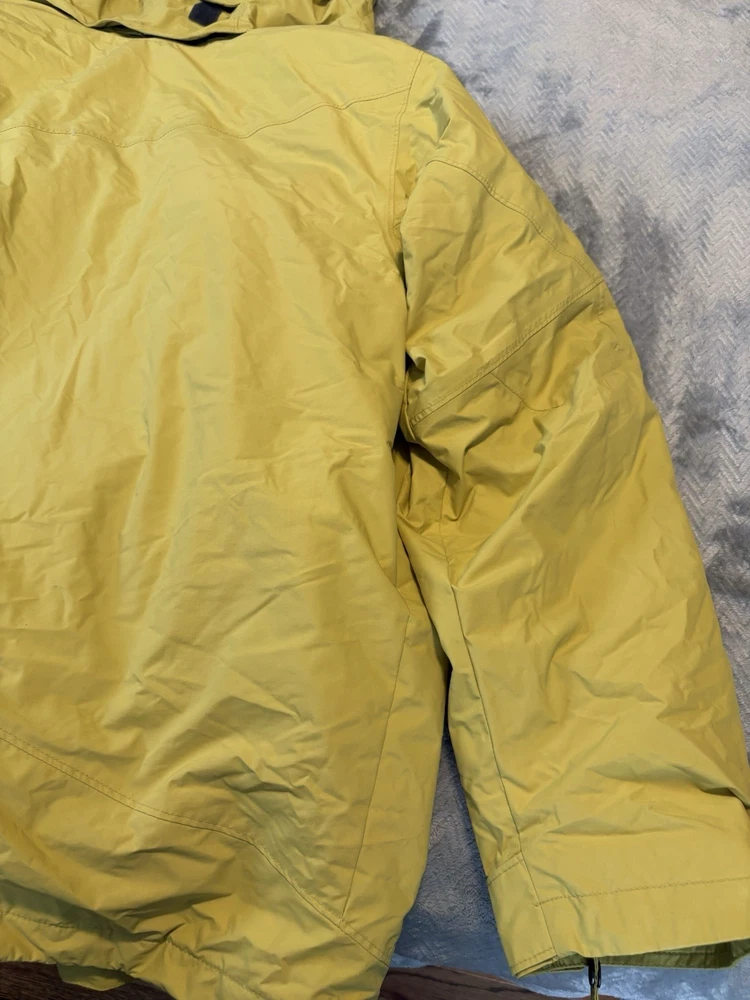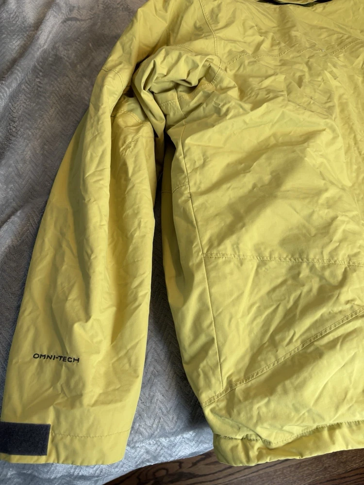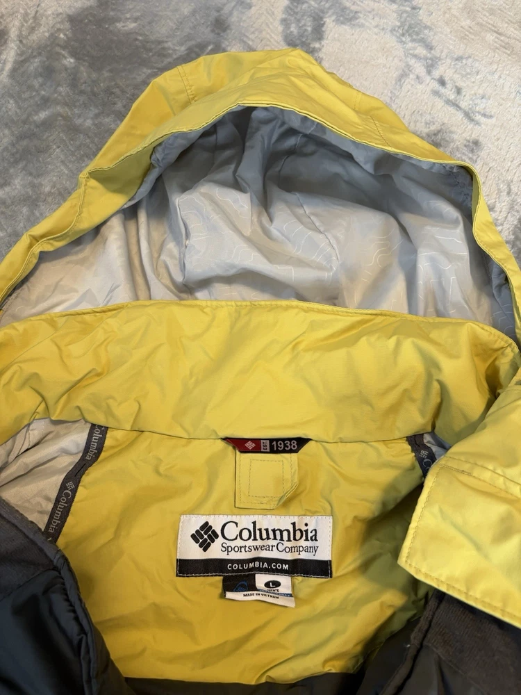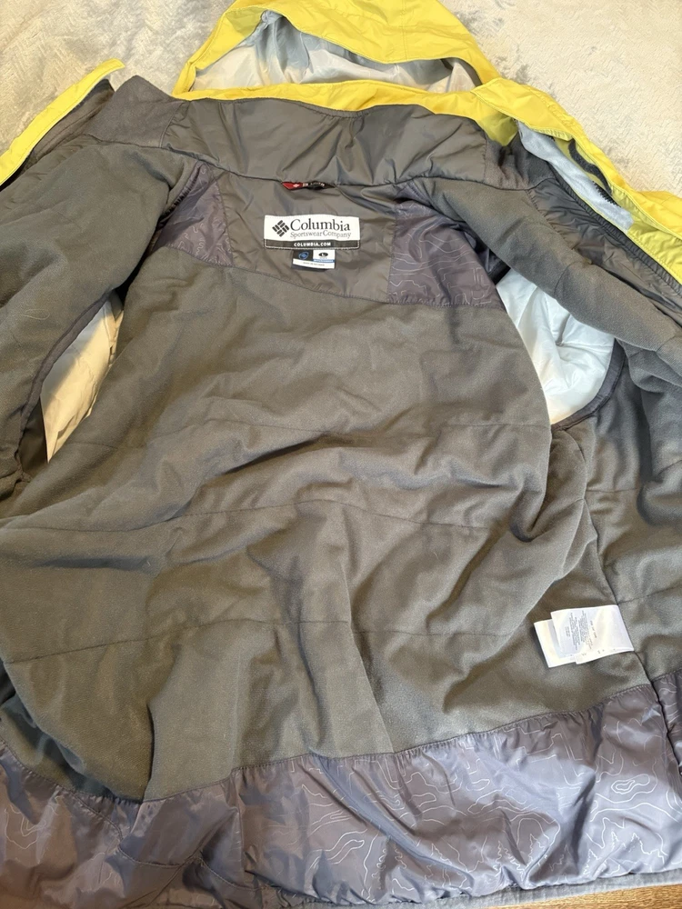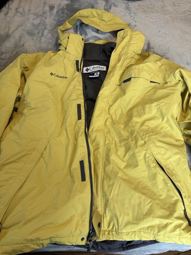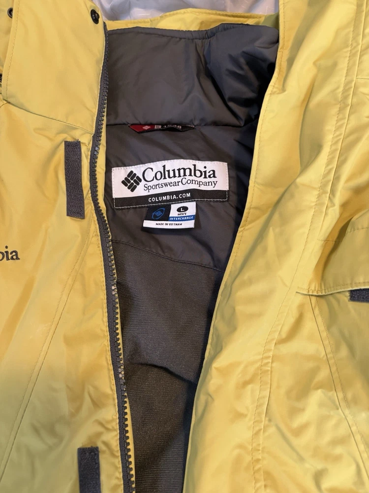The Columbia Jacket in Yellow/Gray is a versatile 3-in-1 Interchange jacket designed for men in size L. Made with nylon outer shell material, this jacket features Columbia's Omni-Tech technology for outdoor activities like hiking. With its bright yellow and gray color combination, this jacket offers both style and functionality for those seeking a reliable outerwear option for various weather conditions. If there are any questions, please feel free to reach out.