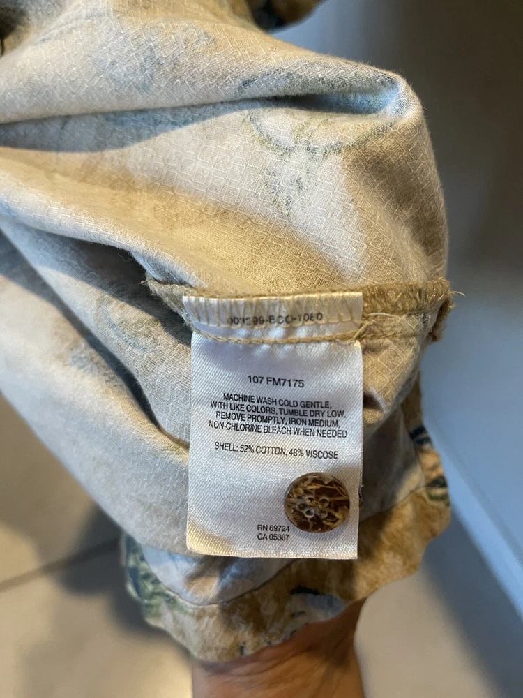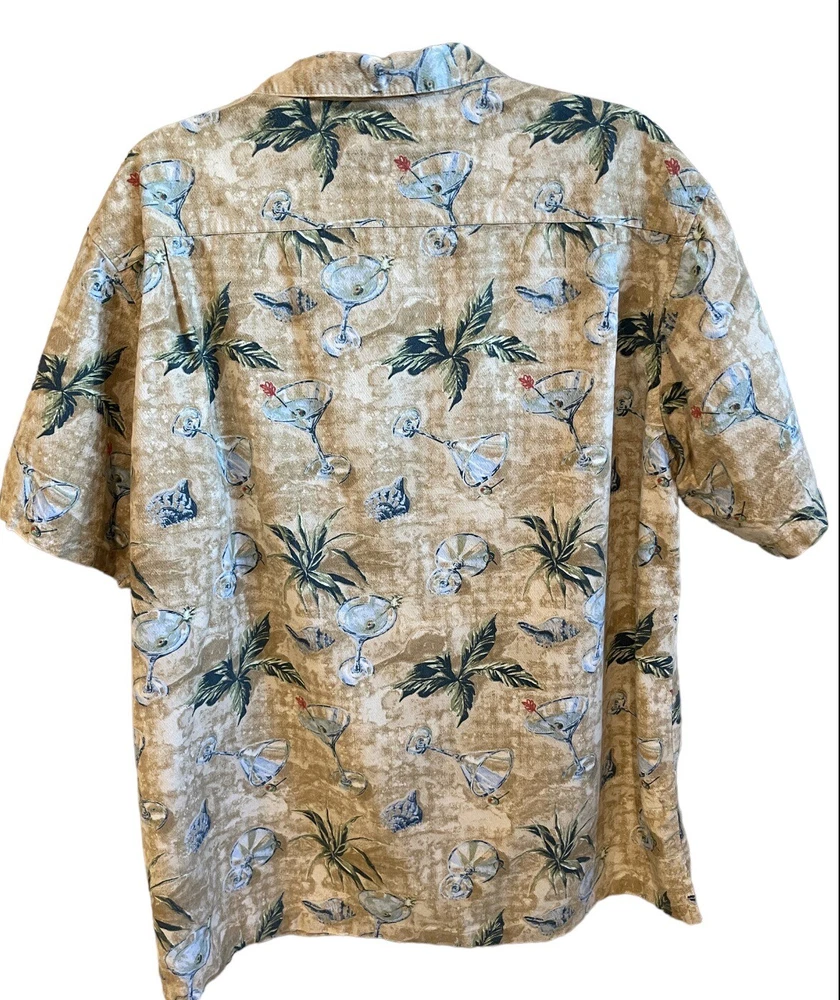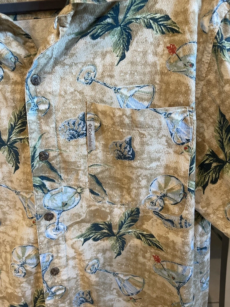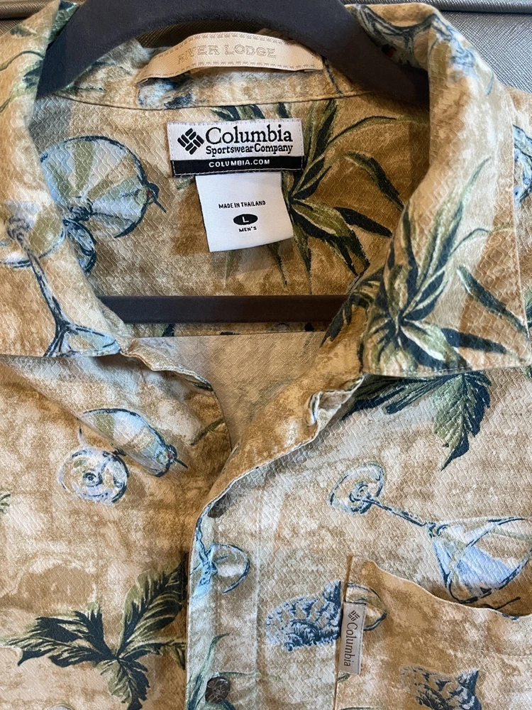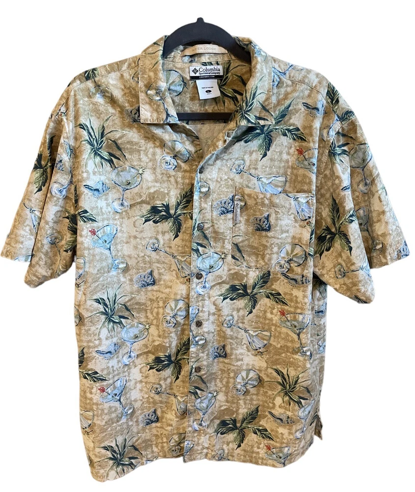This men's shirt from Columbia is a stylish and comfortable addition to any wardrobe. The beige color and Hawaiian shell martini pattern make it perfect for casual occasions, while the cotton blend material and pockets add practicality. The shirt features short sleeves, a collared neckline, and a button closure, with a regular fit that suits most body types. The vintage-inspired River Lodge model is machine washable and has a button-down collar style. It is suitable for all seasons and occasions, from festivals to travel. The shirt is part of the designer, bohemian, 70s, 80s, 90s, and couture themes, making it a versatile choice. Please note that this item is handmade in Thailand and does not have any personalized features.