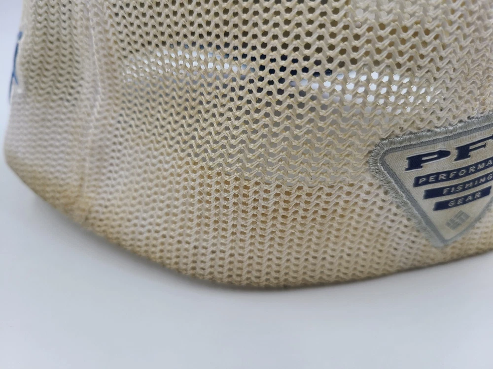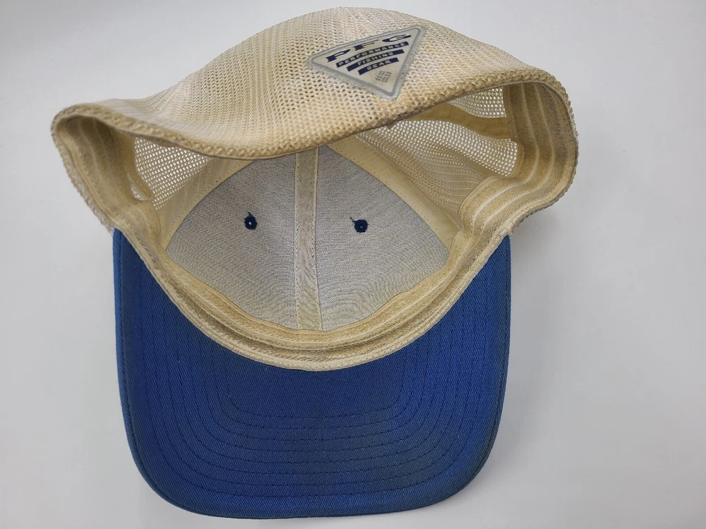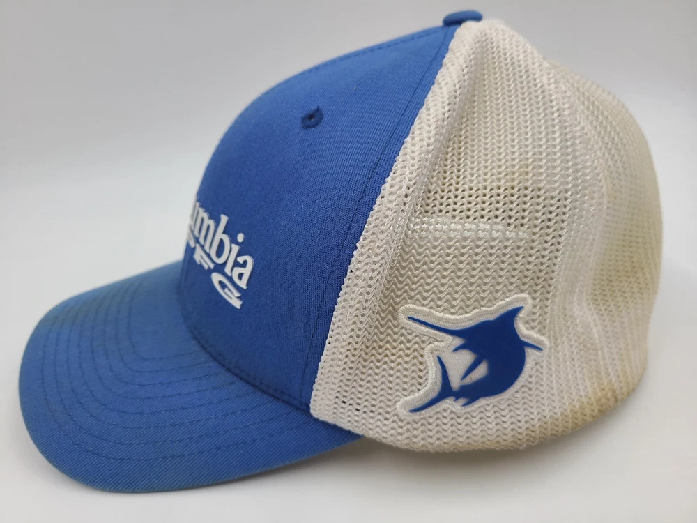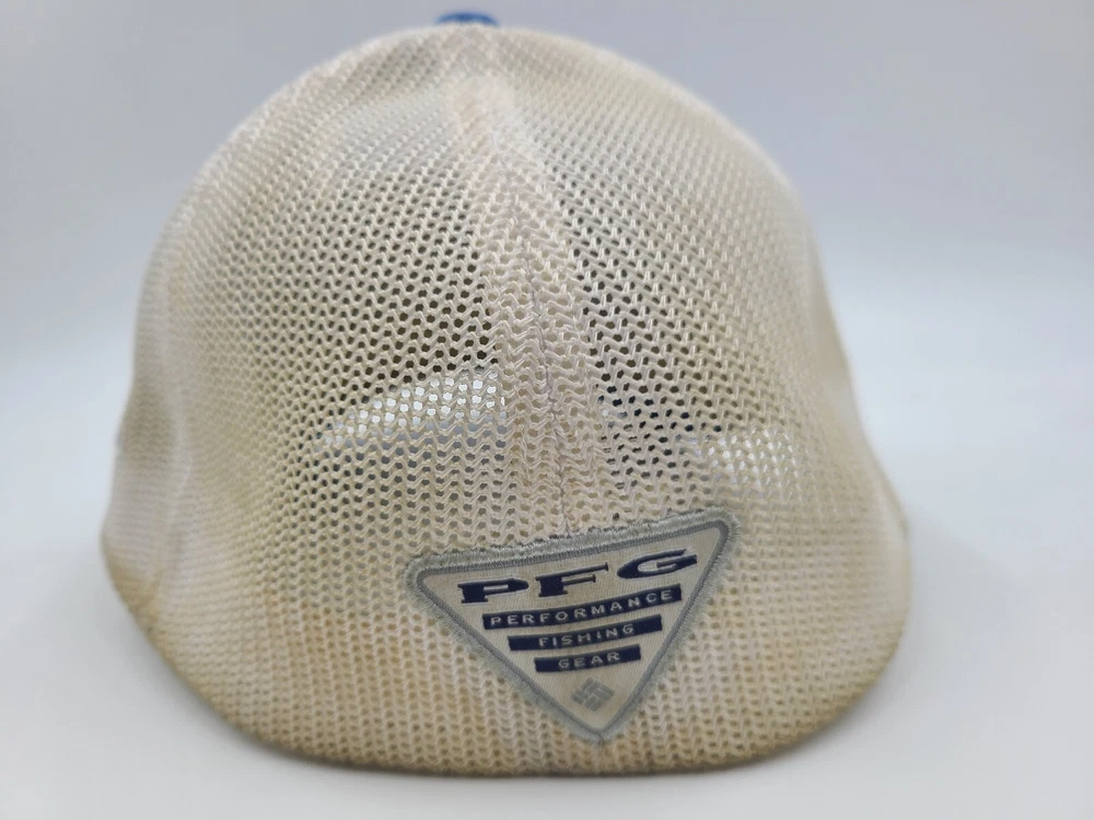 Has stains/discoloration all around the hat as seen in photos. Columbia PFG Distressed Mesh Flex Fitted L-XL Hat Cap Dad Men Women Blue White. EACH ADDITIONAL HAT PURCHASED IS ONLY $1 ADDED SHIPPING!