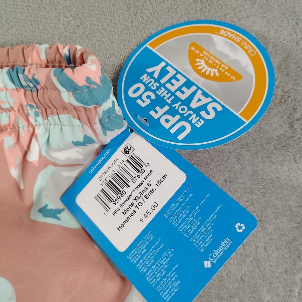 Columbia PFG Men's Rambler Swim Shorts- Sandalwood Pink Botanicraze -Size XL-6" inseam Upgrade your comfort on the water with high-performance Columbia® PFG Rambler™ Printed Water Shorts for Men. Bringing Omni-Shade™ UPF 50 sun protection, Omni-Shield™ advanced water repellency, interior mesh briefs, hand pockets, and a zip rear pocket, these Columbia men's water shorts make great swim trunks or a versatile, comfortable pick anytime. 100% polyester. Machine wash. Imported. Manufacturer style #: 2126201. 100% polyester Omni-Shade UPF 50 sun protection Omni-Shield advanced repellency Elastic waist Interior mesh briefs Hand pockets Zip back pocket External drawstrings