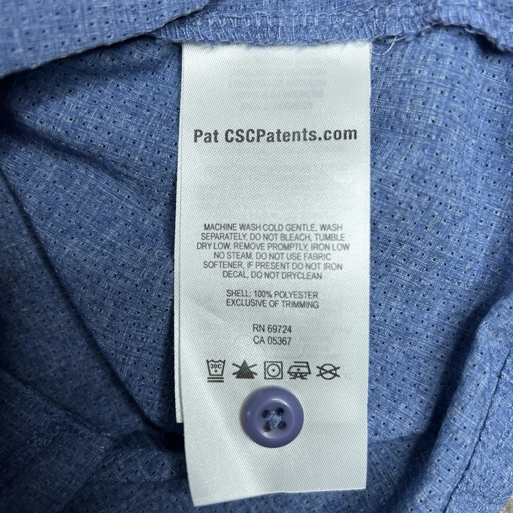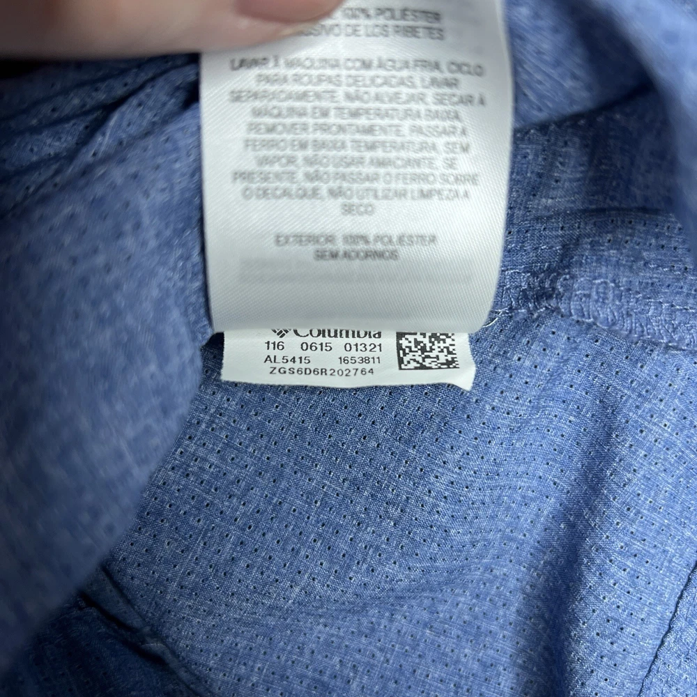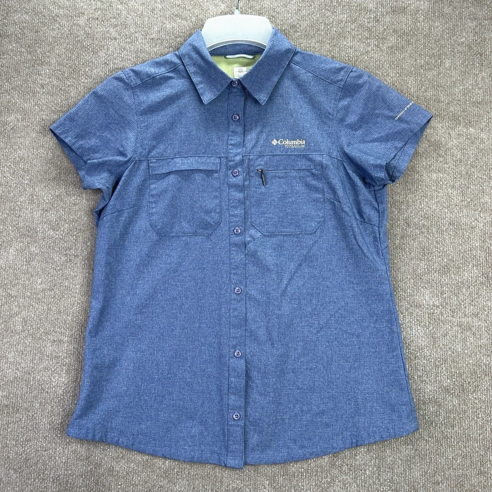 Style: Basic Neckline: Collared Fabric Type: Mesh Color: Blue Department: Women Type: Button-Up Size Type: Regular Features: Easy Care, Lightweight, Moisture Wicking, Pockets MPN: AL5415 Personalize: No Sleeve Length: Short Sleeve Closure: Button Pattern: Solid Season: Fall, Spring, Summer Garment Care: Machine Washable Size: M Handmade: No Theme: Fish, Outdoor, Sports Brand: Columbia Occasion: Casual, Travel Material: Polyester