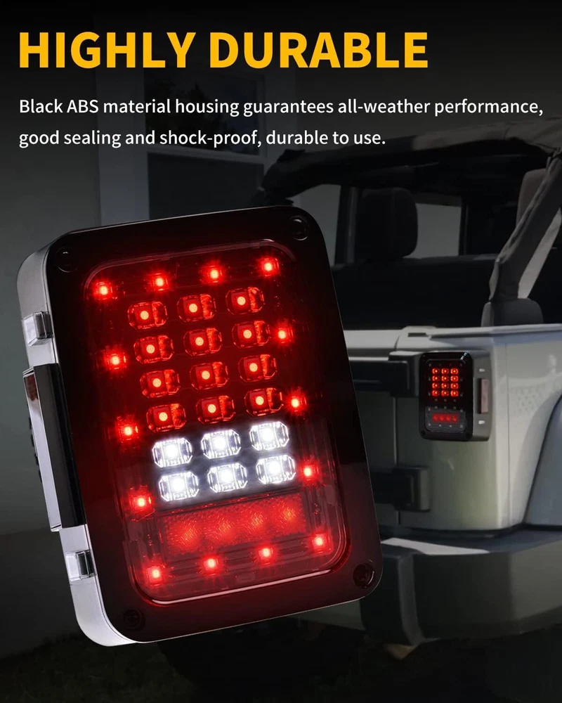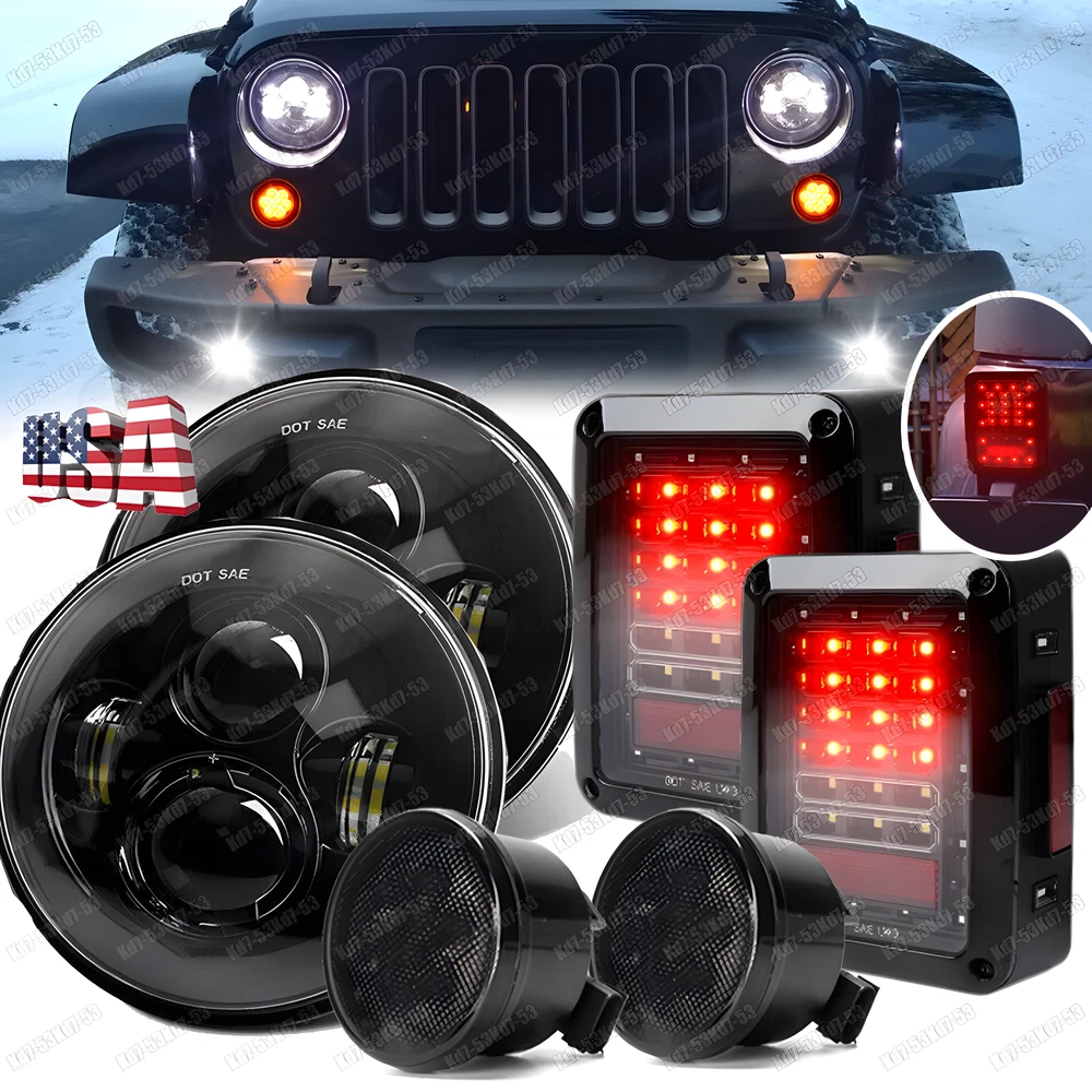 Fitment for 2007 2008 2009 2010 2011 2012 2013 2014 2015 2016 2017 2018 Jeep Wrangler JK 2 Door for 2007 2008 2009 2010 2011 2012 2013 2014 2015 2016 2017 2018 Jeep Wrangler Unlimited JK 4 Door Pair 7 inch Round Led Headlights Black Headlamp White Halo Angel Eyes Amber Turn Signal Power: 200W/Pair 100W/Pcs Dimension: 7" Dia. Input: 12-24V DC Operating Voltage: 9-30V DC Material: Aluminum + PMMA Clear Lens Lens Pattern:High & Low Beam / DRL(daytime running light) / Turn Signal Light Color Temperature: 6000K Cool White Waterproof:IP68 Connector: H4/H13 (Ground and High Beam) Life Span: Above 50,000 Hours JK LED tail lights Rear Brake Reverse Turn Signal Taillights Super Bright with faster on/off Response Time for Driving Safety. Gives your JK incredible visibility and style. Simple installation - Direct Plug & Play, Usually in 10 minutes or less Low Power Consumption, Life Span: 50000Hrs. Low Voltage Protection, High precision Constant Current Driver Chip. Gloss Black Exterior with Side Accent LED's Features: IP Grade: IP67 LED Chip: Osram chips Input voltage: 9-16v Reverse Light: 25W Light color: Red(running/Brake),Red(turn signal),White(reverse) •can be used for 2007+Wrangler vehicles •just plug and play, no need to change the car circuit wires. Life-span: Above 80,000 hours Lamp Cup Material: Aluminum Alloy+ Clear PC Lens Certification: DOT Pair LED Amber Turn Signal Lights 1.Voltage: DC 12V 2.Color Temperature: 2000K (Yellow) 3.Wattage: 5W 4.Color of outside surface: Smoke Black 5. Material: ABS 6.Life Span:80000 hours 7.Size: 8.8*8.8*7.2CM Notice Taillight has a female plug for U.S. models. (International customers please verify if your Jeep requires a male or female plug) Package includes: 2x 7 Inch round Halo led headlight 2x H4 to H13 adapter harness 2x Turn Signal light 2x LED Tail Light
