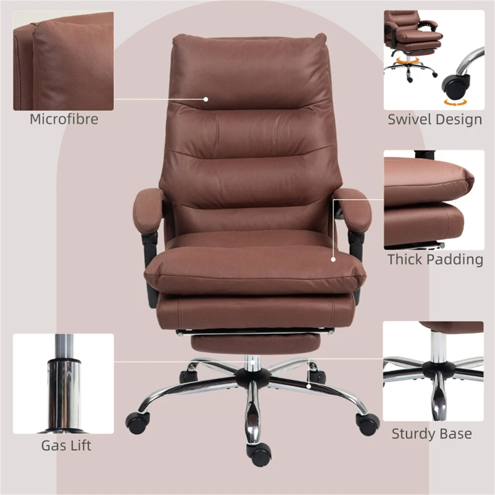 Features: - Six vibration massage points with five modes and lumbar heating to relax your body - Take a break and stretch out with a 135° recline angle and footrest - Curved backrest and double-tier padding provide extra support - Adjustable seat height to fit your comfort - Use massage with a wired remote control - Microfibre is breathable, comfortable, easy-care, and resistant to the wear and tear of busy households - Swivel wheels and seat ensure easy and quick mobility - Assembly required Specification: - Color: Coffee - Material: Microfibre Polyester), Foam, Multi-layer Board, Steel - Overall Dimension: 25.5" W x 28.25" D x 43" -46" H - Reclining Dimension: 24.75" W x 60.25" D x 38.5" -41.75" H - Seat Size: 22.5" W x 17.75" D - Seat Height: 21.75" -24.75" - Armrest Height to Seat: 6.75" - Back Size: 20" W x 28.75" L - Seat Thickness: 7" - Back Thickness: 6.75" - Cord Length: 5.9 ft - Weight Capacity: 265 lbs - Input: 100-240V, 50/60Hz - Output: 12V/1A, 12W Package Includes: - 1 x Massage Office Chair - 1 x Manual