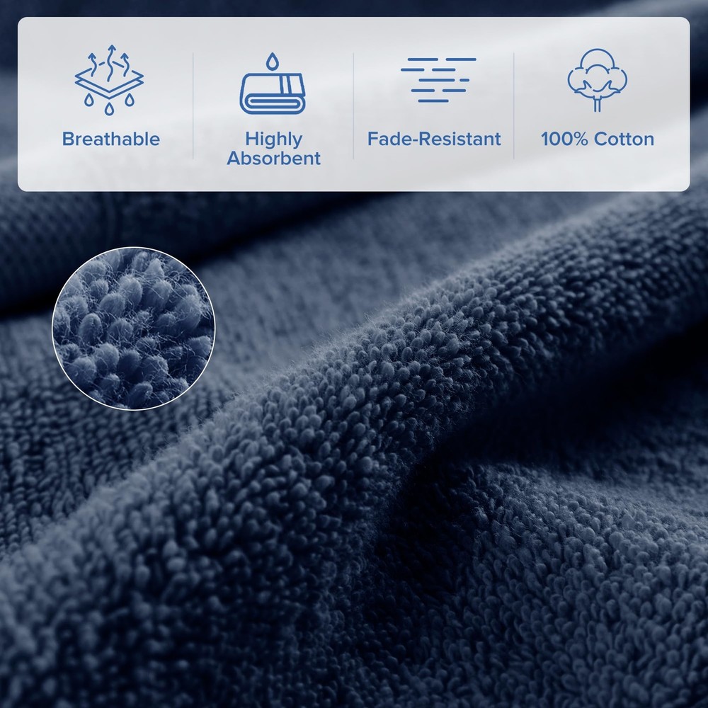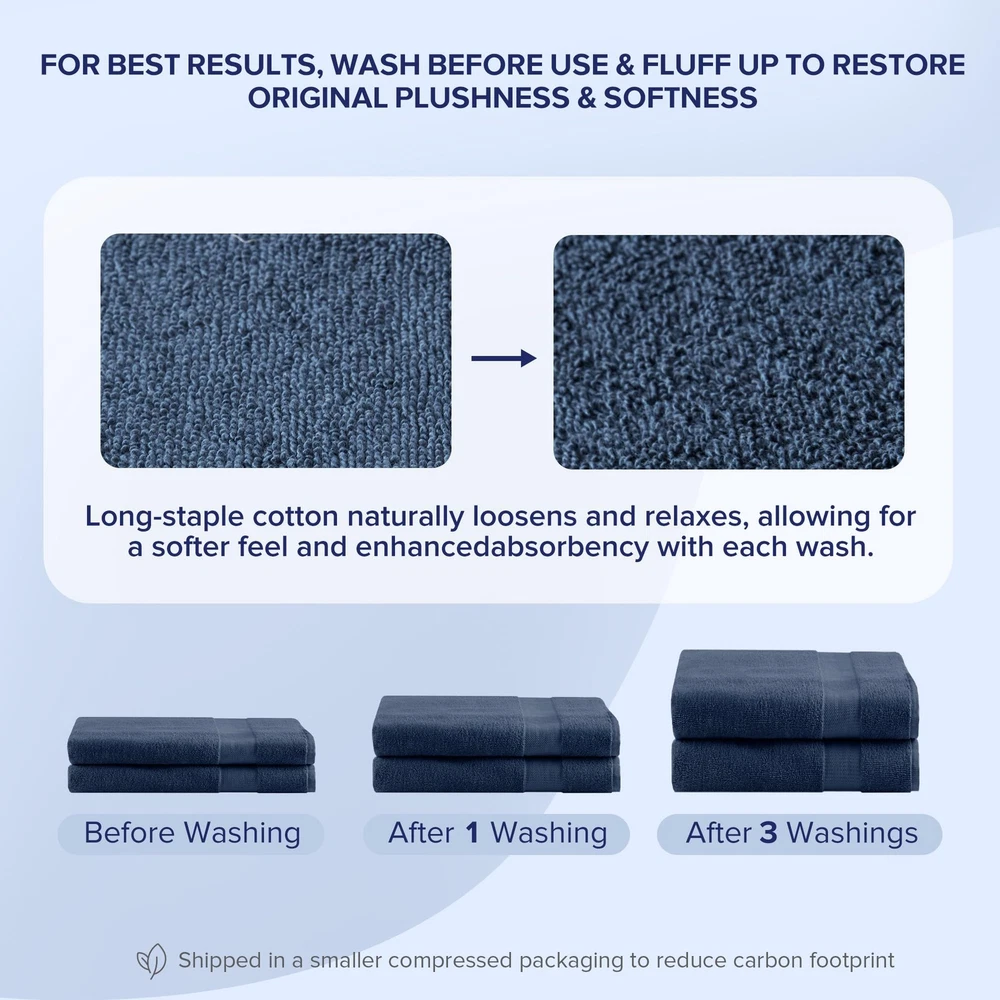 100% Turkish Cotton: Our Turkish Bath Towel Set, crafted from premium long-staple cotton for unmatched softness. Experience comfort with towels that are highly absorbent, quick-drying, and generously sized for ultimate coverage Quality Comfort: Crafted from premium long-staple 100% Turkish cotton with a 500gsm lightweight design, ensure quick drying, high absorbency, and a soft, plush feel. Perfect for daily showers, beach trips, poolside lounging, or gym use Perfect Gif Set Bundle: Ideal gift for any occasion, especially for housewarming gift. Oeko-Tex CERTIFIED - Ensuring the use of non-toxic chemicals and substances, made in an environmentally friendly and socially responsible workplace Seafoam Navy Blue Set (Large Size) includes: 2 Bath Sheets:35"W x 70"L. Items may arrive in compact packaging to reduce their carbon footprint. Washing before first use is recommended to restore fluff and softness Care: Our cotton towel set withstands daily wear, is fade-resistant, and durable. Machine wash cold on a gentle cycle with like colors. Use non-chlorine bleach only. Avoid benzoyl peroxide. Tumble dry low and remove promptly. Do not iron