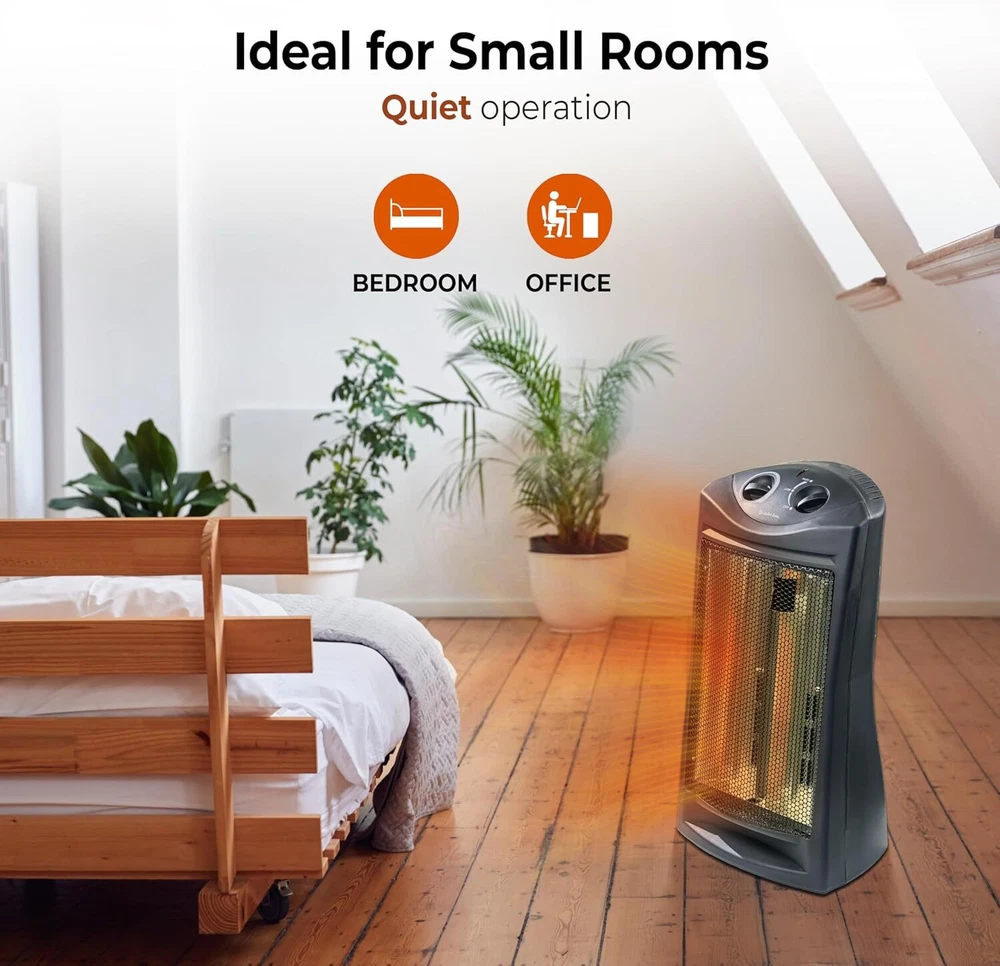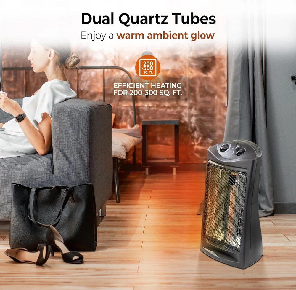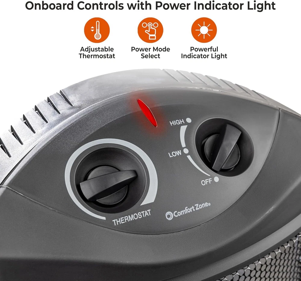 Comfort Zone Indoor Tower Space Heater, Adjustable Thermostat, Radiant Black Product Details Brand: Comfort Zone Special Feature: Cool Touch Exterior, Portable, Manual Thermostat, Overheat Protection Color: Black Form Factor: Tower Indoor/Outdoor Usage: Indoor Product Dimensions: 12.4"D x 9.06"W x 22.83"H Recommended Uses For Product: Office, Home Mounting Type: Stand alone Room Type: Office, Living Room, Bedroom Heating Coverage: 150 sq. ft. Burner type: Radiant EU Spare Part Availability Duration: 2 Years Fuel Type: Electric Number of Speeds: 3 Voltage: 120 Volts Amperage: 12.5 Amps Item Weight: 5.14 pounds Manufacturer: World and Main Country of Origin: USA Item model number: CZQTV007BK Is Discontinued By Manufacturer: No Assembly required: No Number of pieces: 1 Batteries required: No Included Components: Heater Power SourceHeating Method: Corded ElectricRadiant Item WeightHeat Output: 5.14 Pounds1500 Watts EFFICIENT RADIANT HEAT: Experience rapid and thorough heating with our practical radiant heater. Equipped with dual quartz tubes, this heater instantly emits a comforting warmth and creates a soothing glow when in use. Enjoy the focused and efficient heat output that quickly warms the people and objects in front of it, providing a cozy environment within a coverage area of 200-300 square feet. EVEN HEAT DISTRIBUTION: Experience enhanced heat dispersion with the fan-assisted feature of this heater. The fan helps to evenly and efficiently distribute the warmth throughout rooms, ensuring a comfortable and cozy environment. Whether it's your office or bedroom, this heater is a reliable choice for maintaining a pleasant temperature in any space. USER-FRIENDLY CONTROLS: The heater is equipped with two convenient top-mounted control knobs, providing you with effortless control over the thermostat and temperature settings. Adjusting the thermostat and switching between high and low temperature settings is quick and easy, ensuring optimal comfort with just a simple twist. ADVANCED SAFETY FEATURES: This heater is equipped with a range of smart safety features to ensure your peace of mind. The stay-cool molded handle allows for safe and convenient handling, while the durable metal housing adds an extra layer of protection. The tip-over switch instantly shuts off the heater if it is accidentally knocked over, and the overheat protection system prevents it from reaching unsafe temperature levels. Enjoy warmth without worry, thanks to these enhanced safety measures. SLEEK AND SPACE-SAVING: This quartz heater boasts a slim and stylish design, making it the perfect choice for smaller spaces. Its compact size allows it to fit seamlessly into any room, while the sleek black finish adds a touch of elegance that effortlessly blends with various decor styles. Enjoy both warmth and aesthetic appeal with this modern and space-saving heater. Powerful and Efficient Radiant HeaterCreate a warm and comfortable space for work or relaxation with this Comfort Zone Radiant Quartz Tower Heater. By lowering your home thermostat slightly and using this heater to warm just the room you are occupying, it can lead to significant savings on your heating bills. The heater employs dual quartz tubes, which heat up quickly and give off a warm glow when in use.Practical Settings and Convenient ControlsThe quartz heater offers two different heat settings. It is fan-assisted to help disperse the heat more evenly throughout your space. You can switch between the high and low heat settings by simply turning a knob at the top of the unit. A second knob allows you to easily adjust the thermostat to just the right temperature for your space. Advanced Safety FeaturesA tip-over switch automatically turns the heater off if it is knocked over to help prevent fires, while a built-in sensor helps to prevent the unit from overheating. A molded handle makes it easy to carry, and the stay-cool handle and housing allow you to safely transport it from room to room. Stylish and Compact Modern DesignThe Comfort Zone Quartz Heater has a space-saving design that fits into small rooms with ease. It comes in a sleek black finish that effortlessly complements a wide variety of different décor styles.