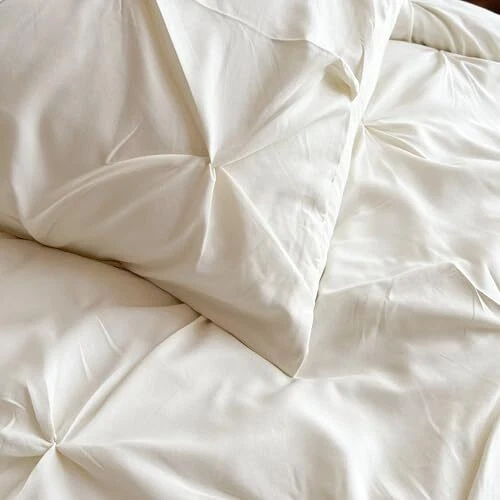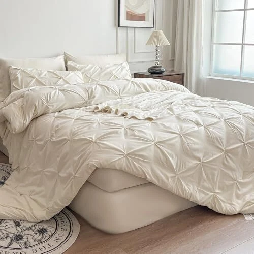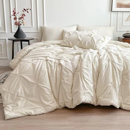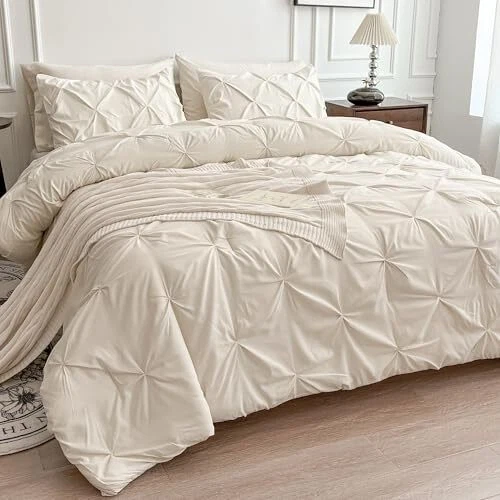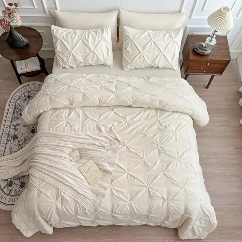 Comforter Set, 7 Pieces Bed in a Bag Pintuck Bedding Sets Queen Cream White