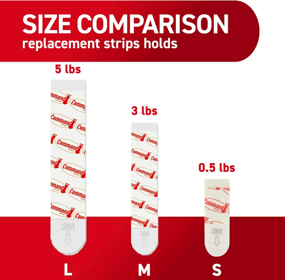 INCLUDES - 20 Indoor Large Replacement Strips RE-HANG HOOKS – Reorganize when inspiration strikes! Command Replacement Strips make it easy to hang and rehang all your Command indoor hooks, damage-free ORGANIZE DAMAGE-FREE - Say goodbye to holes, marks, or sticky residue on your walls, doors, cabinets, or closets; Command Hooks by 3M are easy to use and help keep your walls looking beautiful STRONG AND VERSATILE- Command indoor hooks hold strongly on a variety of surfaces including painted walls, metal, painted concrete, laminate & finished wood (painted or varnished: shiplap, cabinets, or doors), tile, glass and other smooth surfaces Not recommended for mounting or hanging frames - use specially designed Command Picture Hanging Strips or Hangers instead Command Replacement Strips make it easy to move and rehang your Command Products to reorganize or redecorate your home. For reuse with Command Large indoor plastic and metallic hooks. For indoor use only. Command Replacement Strips come in small, medium and large sizes.