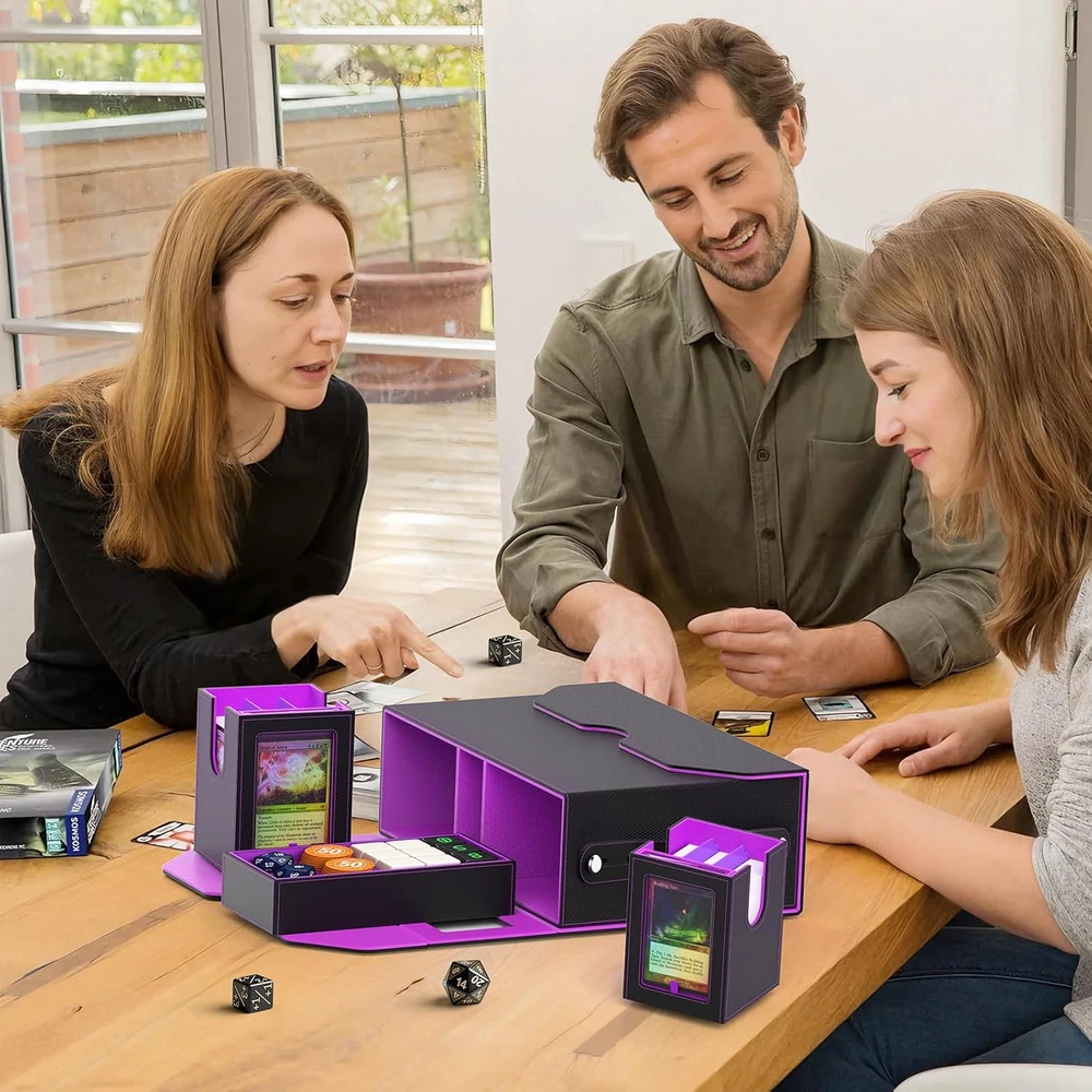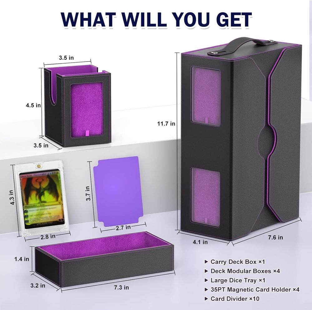 5-in-1 Modular Design: Features 4 removable card boxes and 1 large central storage box that doubles as a dice tray. Store all tokens and accessories, eliminate clutter from scattered boxes. Organize all your gaming gear in one portable case, a thoughtful gift for dedicated players Stylish and Portable with Display Windows: A sturdy, rivet-fixed top handle makes it easy to grab and go for game nights, tournaments, or travel. Each mtg deck box features a clear display window, comes with 4× 35PT magnetic acrylic card holders. Safely showcase your commander or rare cards for instant recognition and elegant display Magnetic Secure Closure: Each deck box attaches firmly with built-in strong magnets for smooth insertion and secure hold. Cards stay protected even when shaken or inverted, delivering maximum security for your valuable collection during transport All-Round Premium Protection: Constructed with thickened PU leather and reinforced stitching, waterproof, robust, and hard-wearing. The plush microfiber interior lining gently protects your cards from dust, scratches, and wear, keeping them in mint condition over time Ideal Gift for Card Enthusiasts: Designed for serious collectors, each card case holds 100+ double-sleeved cards, 140+ single-sleeved, or 240+ unsleeved cards to support growing collections. Includes 10 dividers for organization. With its massive capacity and luxurious look, it's the ideal gift for MTG, TCG, and sports card collectors Product description